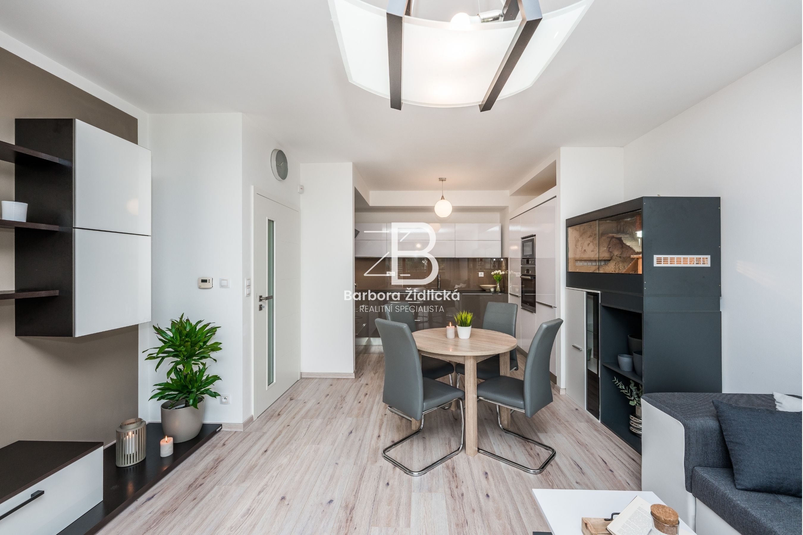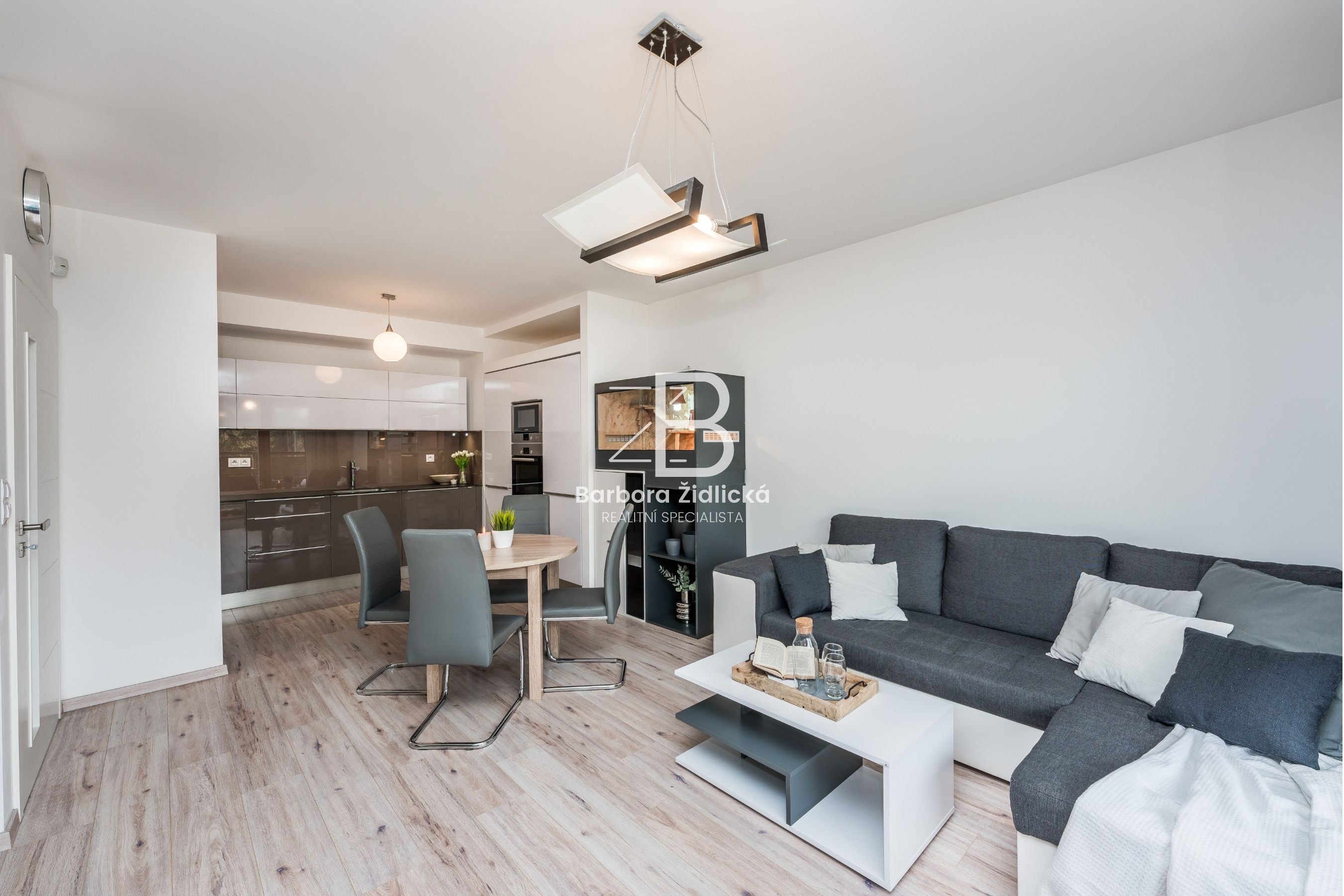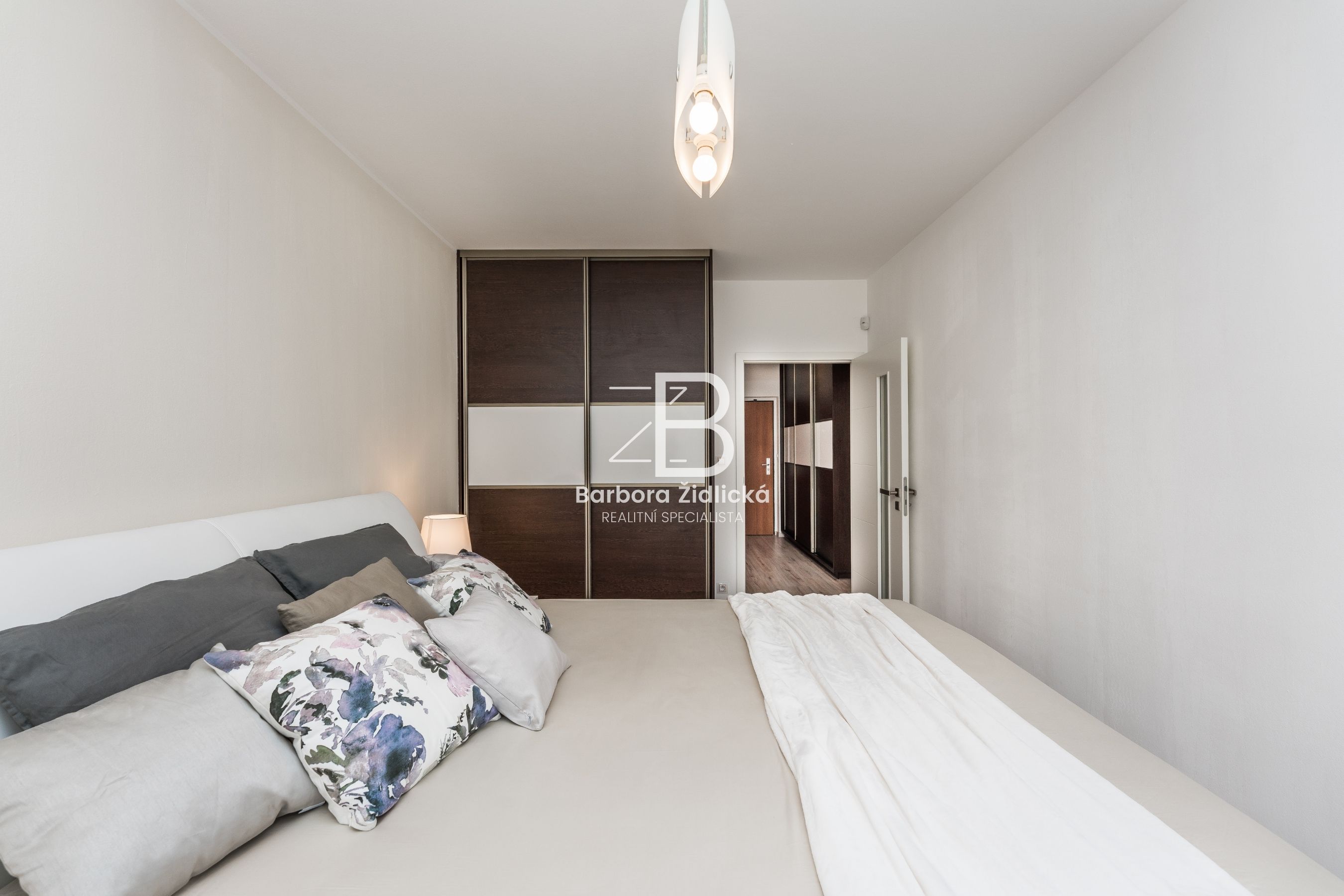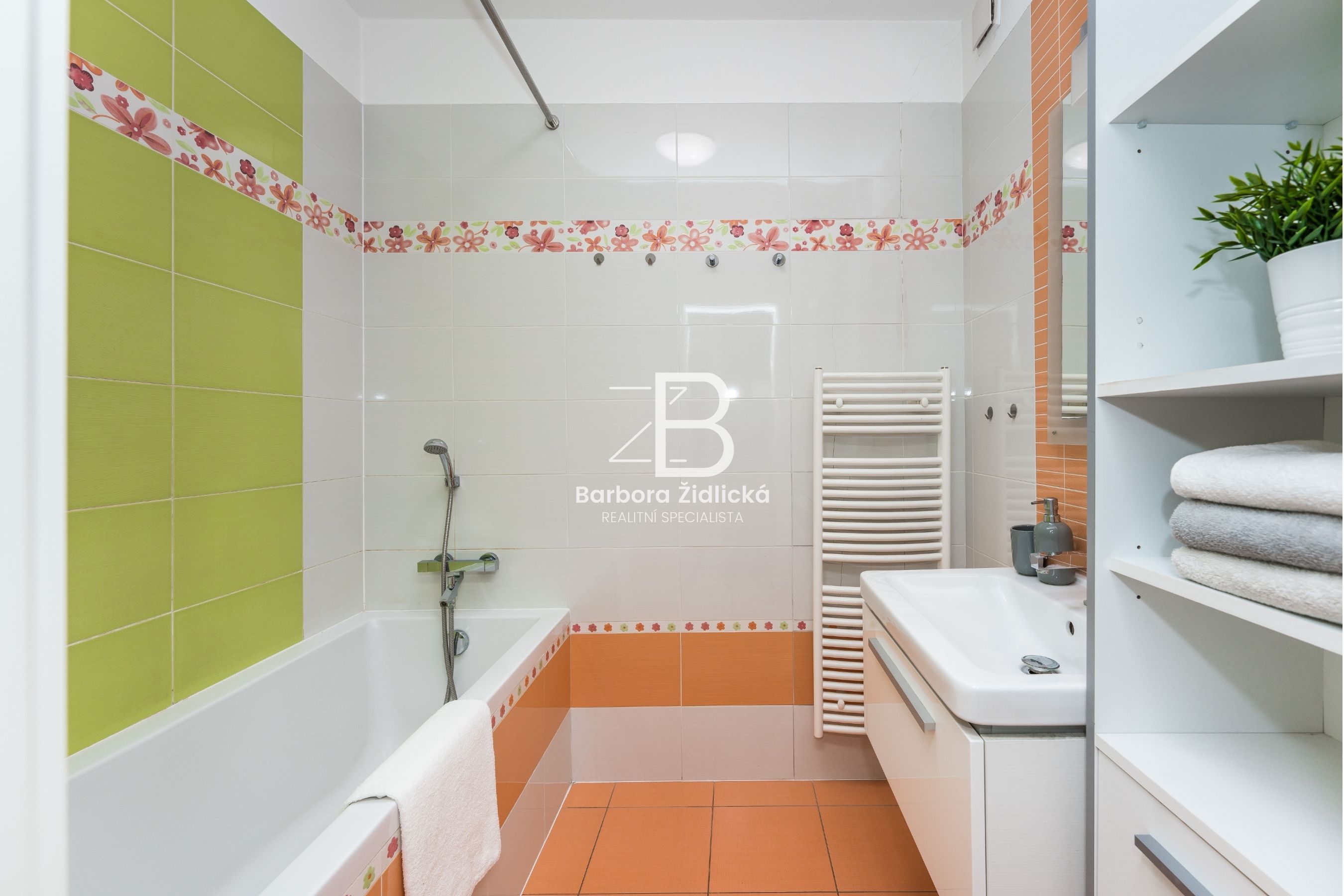 Kuchyňská linka značky Hanák je vybavena vestavěnou myčkou, horkovzdušnou troubou, mikrovlnnou troubou, lednicí, mrazákem, indukční deskou a digestoří. K bytu dále náleží sklep, prostorná lodžie se vstupem z obývacího pokoje i ložnice a společná zabezpečená kolárna.