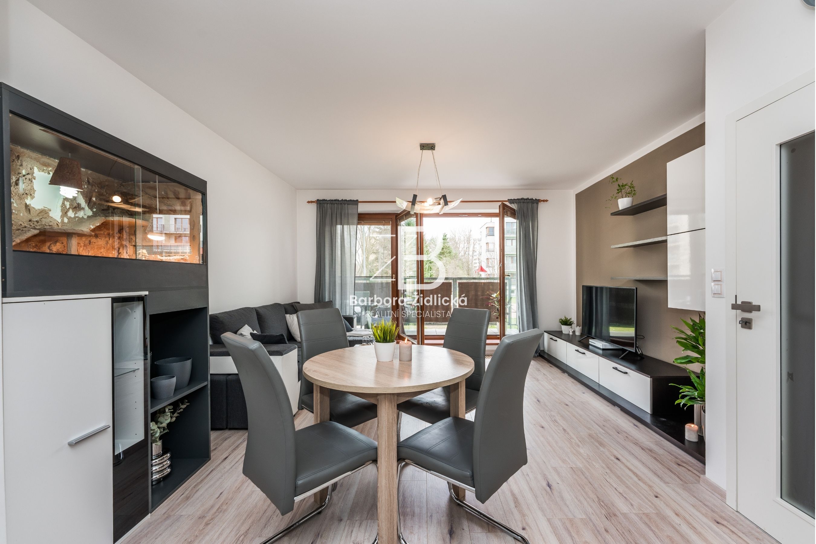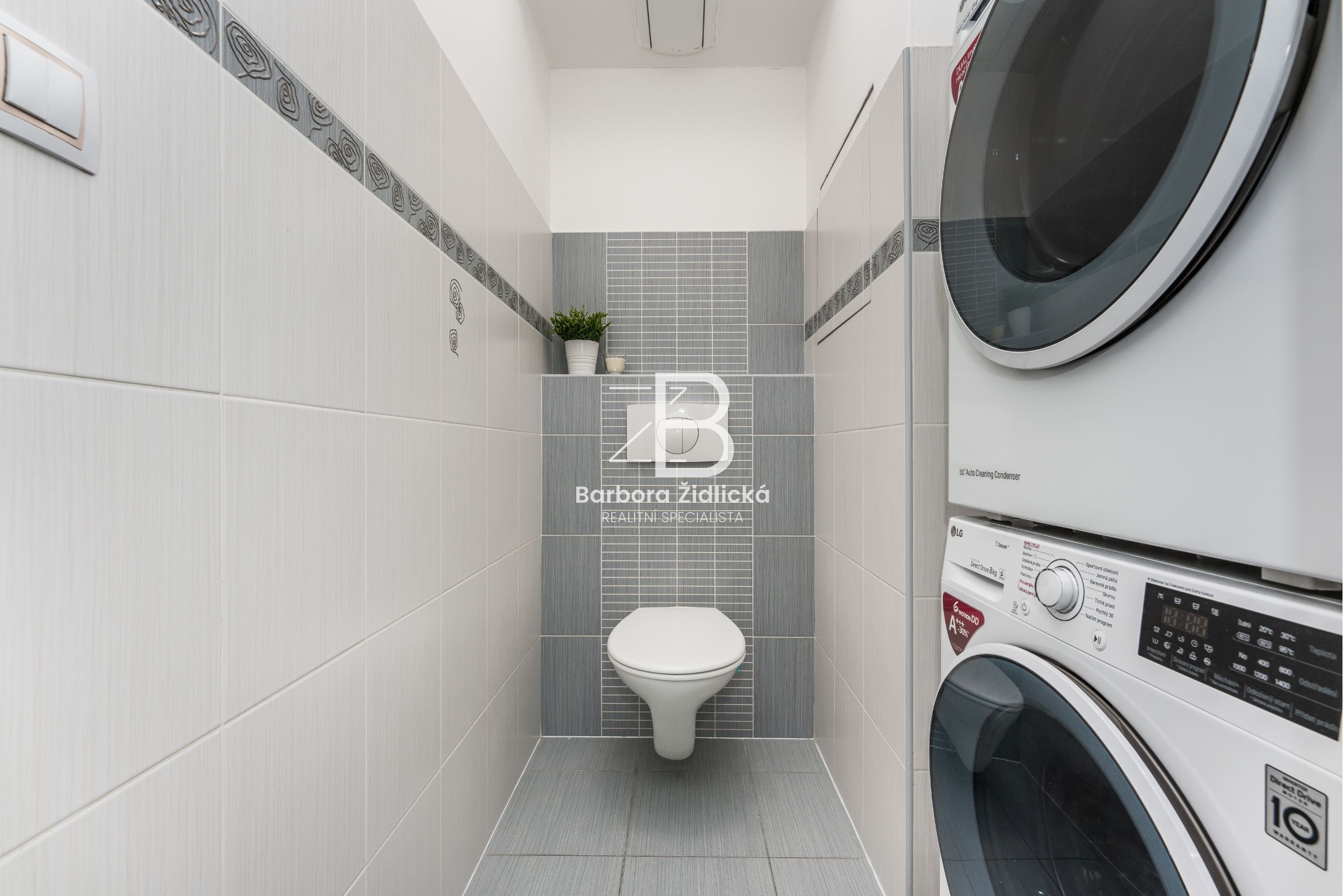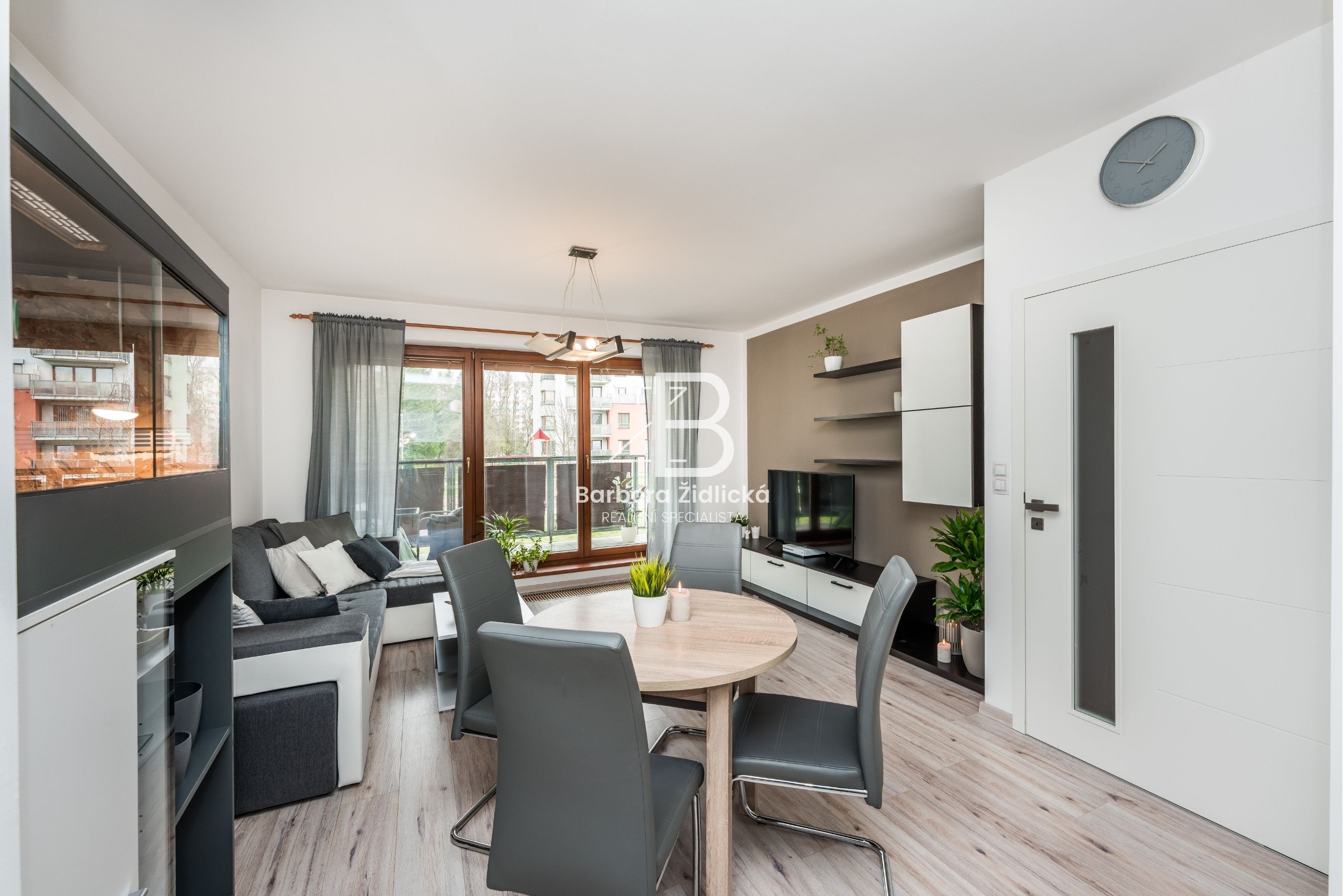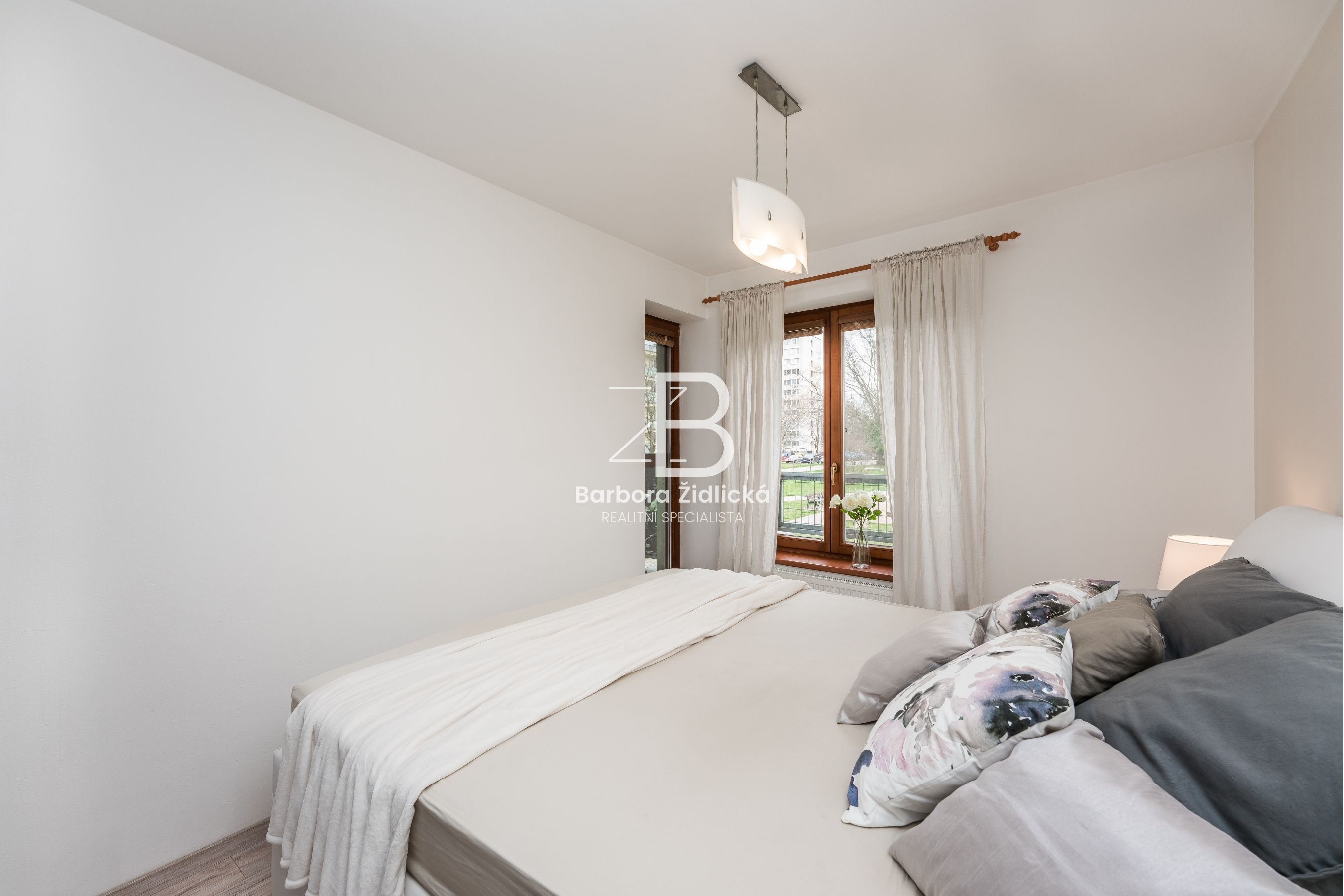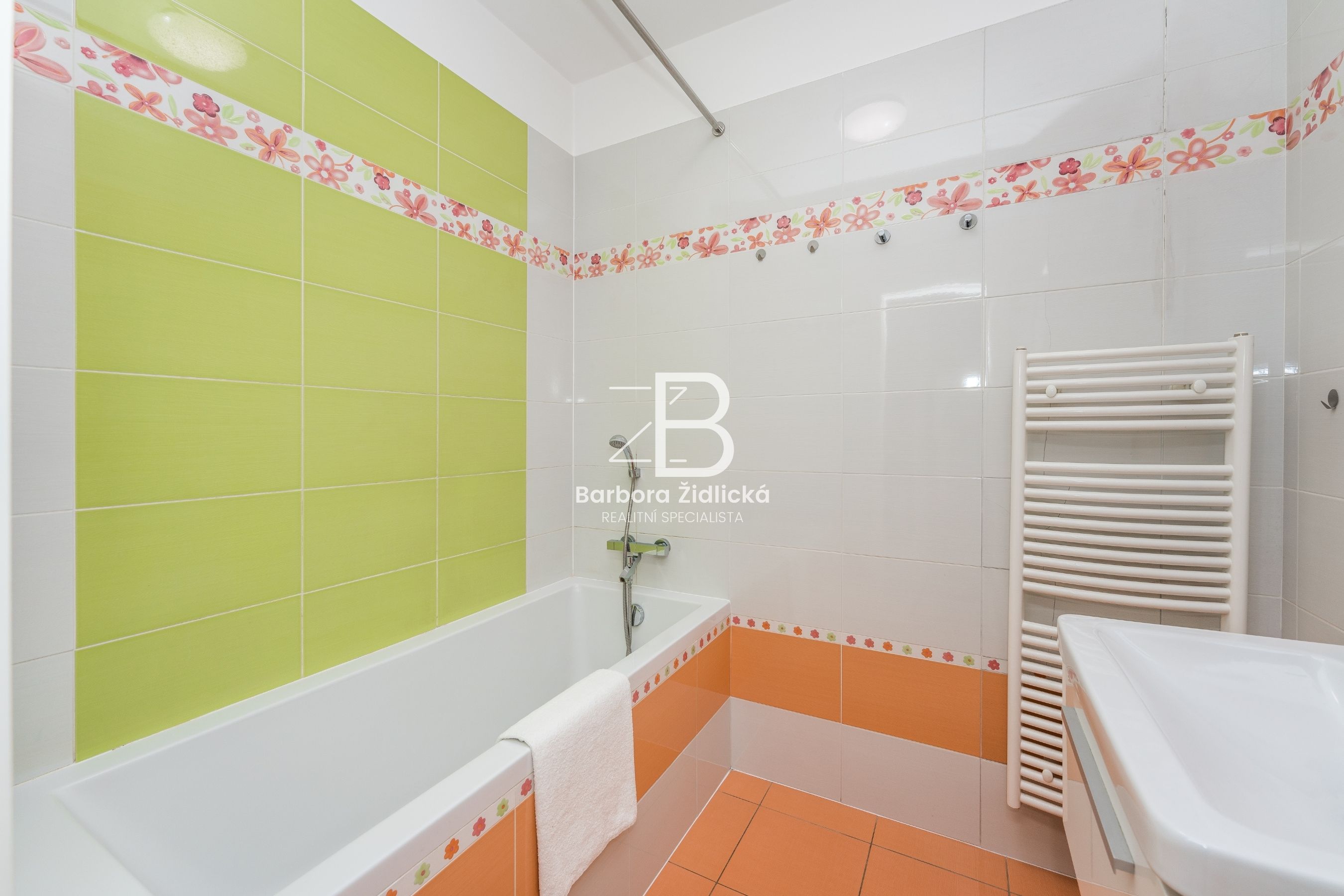 Kuchyňská linka značky Hanák je vybavena vestavěnou myčkou, horkovzdušnou troubou, mikrovlnnou troubou, lednicí, mrazákem, indukční deskou a digestoří. K bytu dále náleží sklep, prostorná lodžie se vstupem z obývacího pokoje i ložnice a společná zabezpečená kolárna.