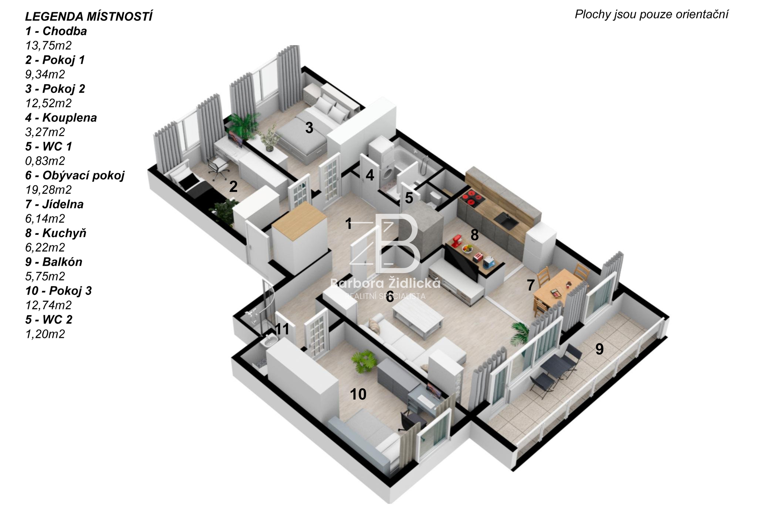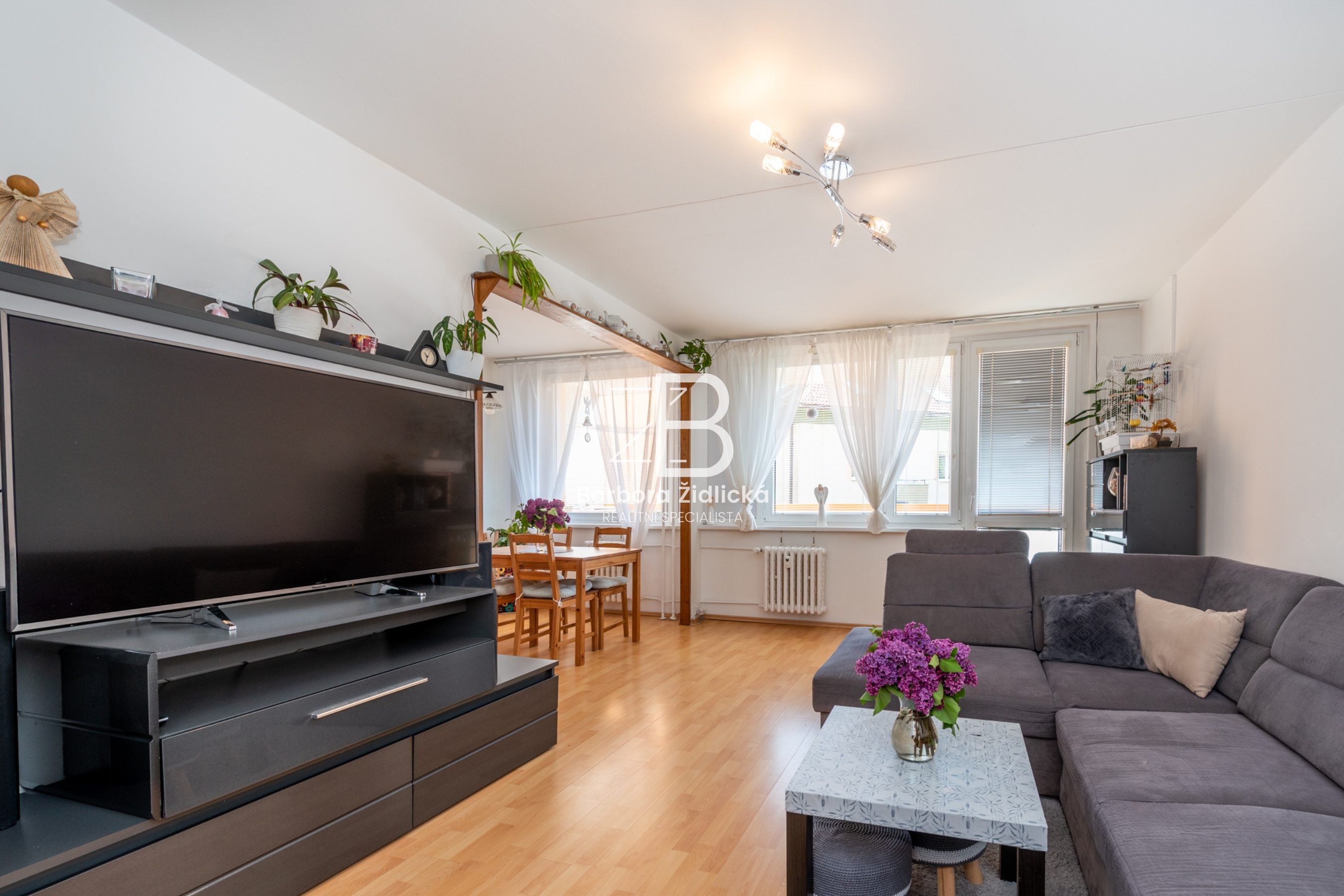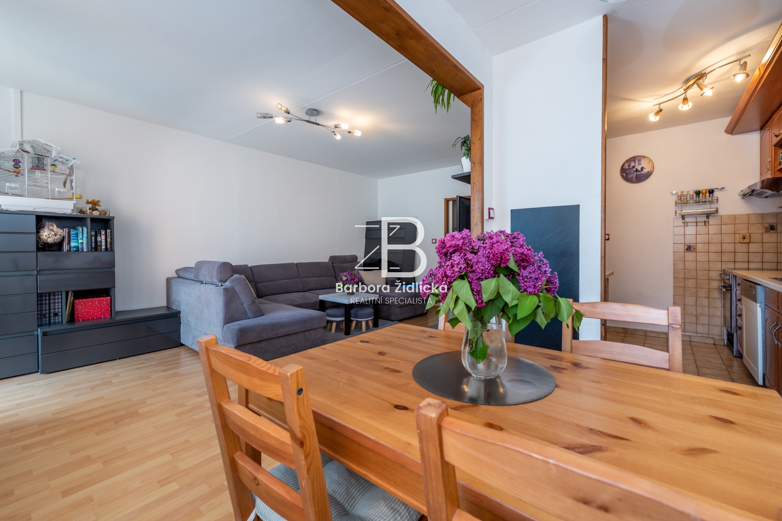 V bytě proběhla rekonstrukce v roce 2010 – podlahy, omítky, koupelna, WC, propojení jídelny a obývacího pokoje. Součástí prodeje je kuchyňská linka. Plocha bytu činí 83,1m2 a náleží k němu lodžie (6,5m2) a sklepní kóje (1,7m2). Je zde také možnost využití kolárny a kočárkárny.