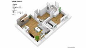 Byt č. 4 je dispozičně řešen jako 2+kk s celkovou podlahovou plochou 54,8 m2. Užitná plocha bytu je 48,8 m2. Nachází se v 1. patře a jeho součástí je i sklepní kóje s výměrou 2,2 m2. Standard vybavení zahrnuje dřevěnou podlahu a bezfalcové dveře přírodního dřeva, dřevěná eurookna – trojsklo, kuchyňskou linku.