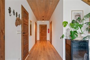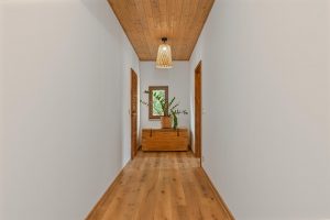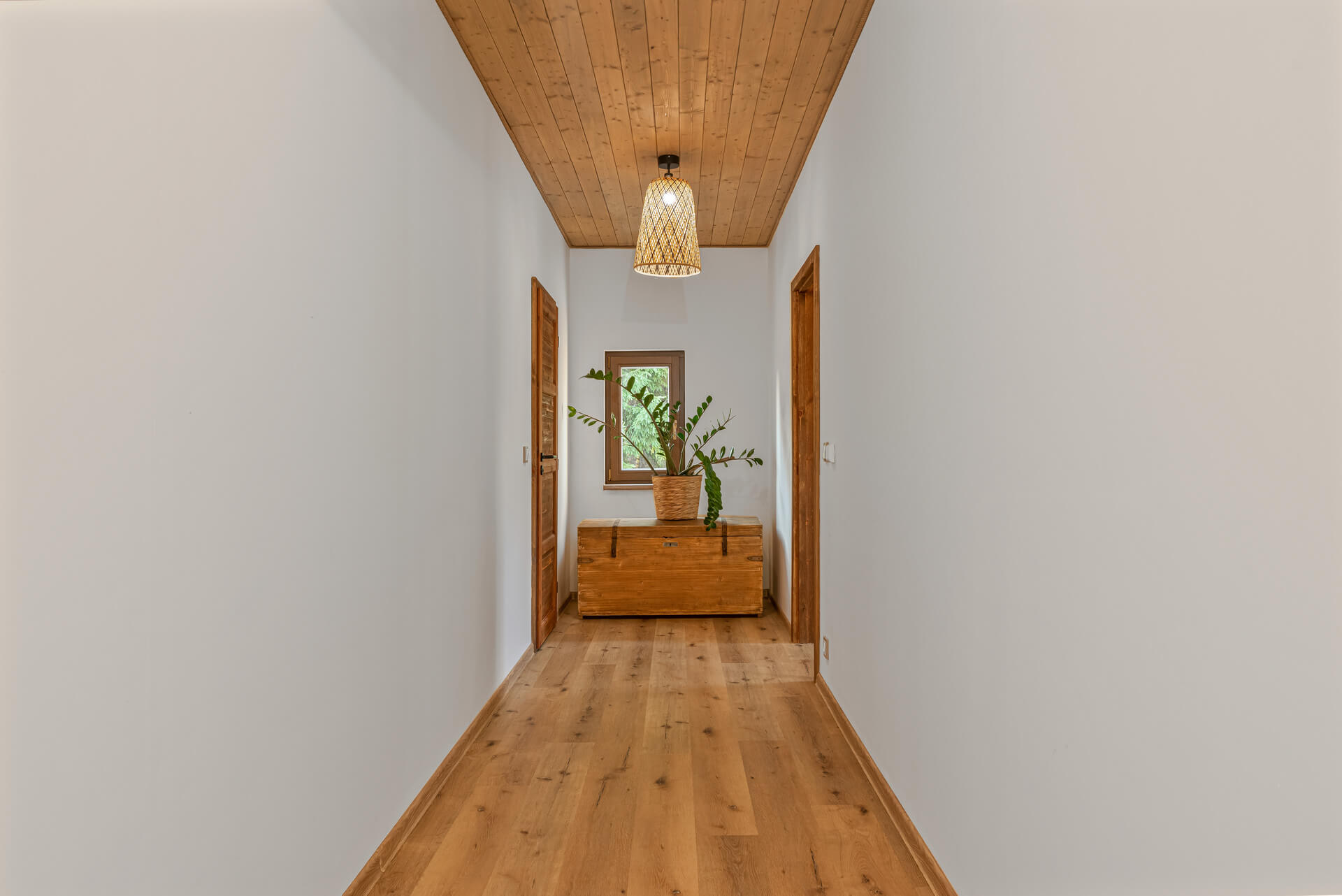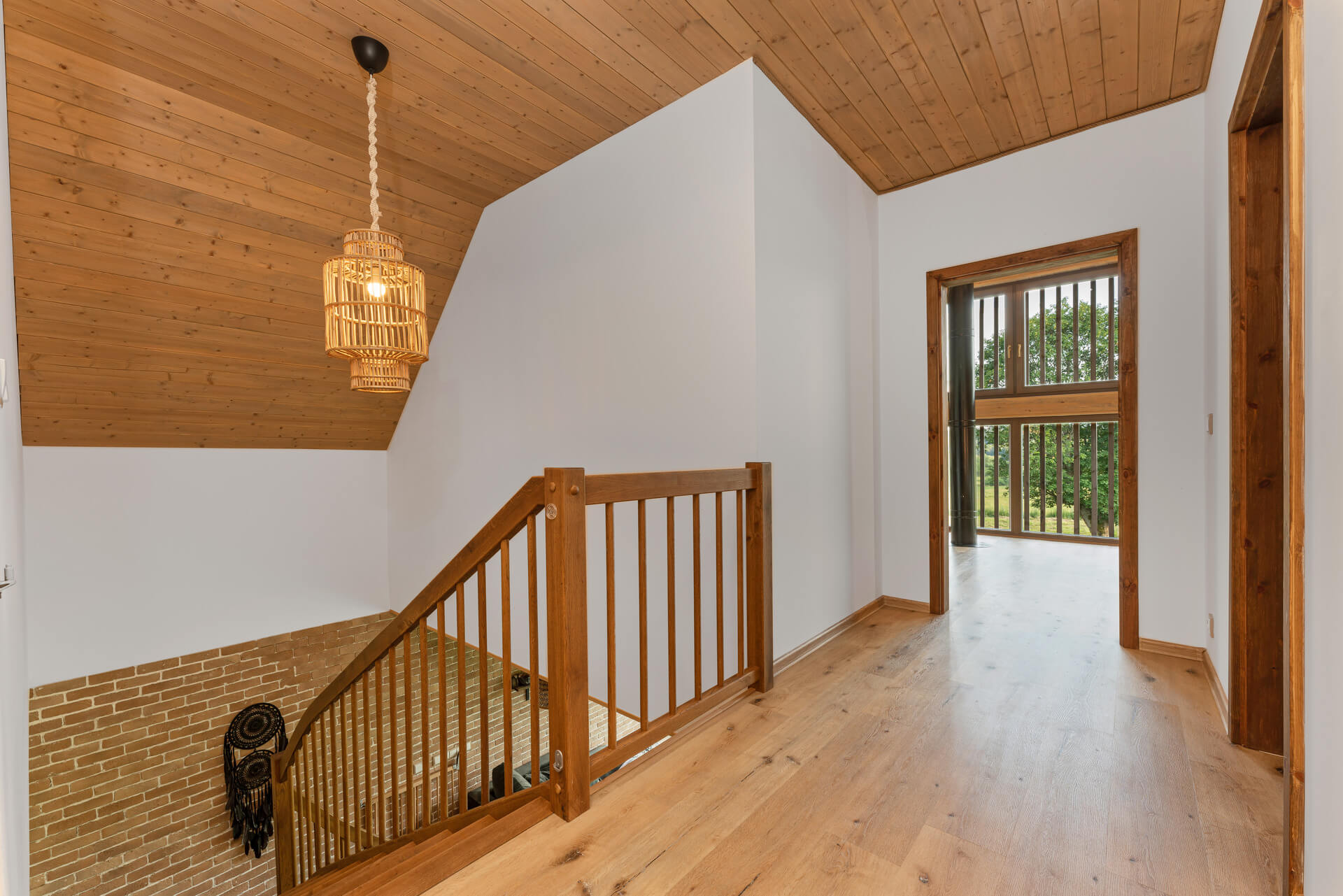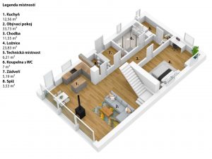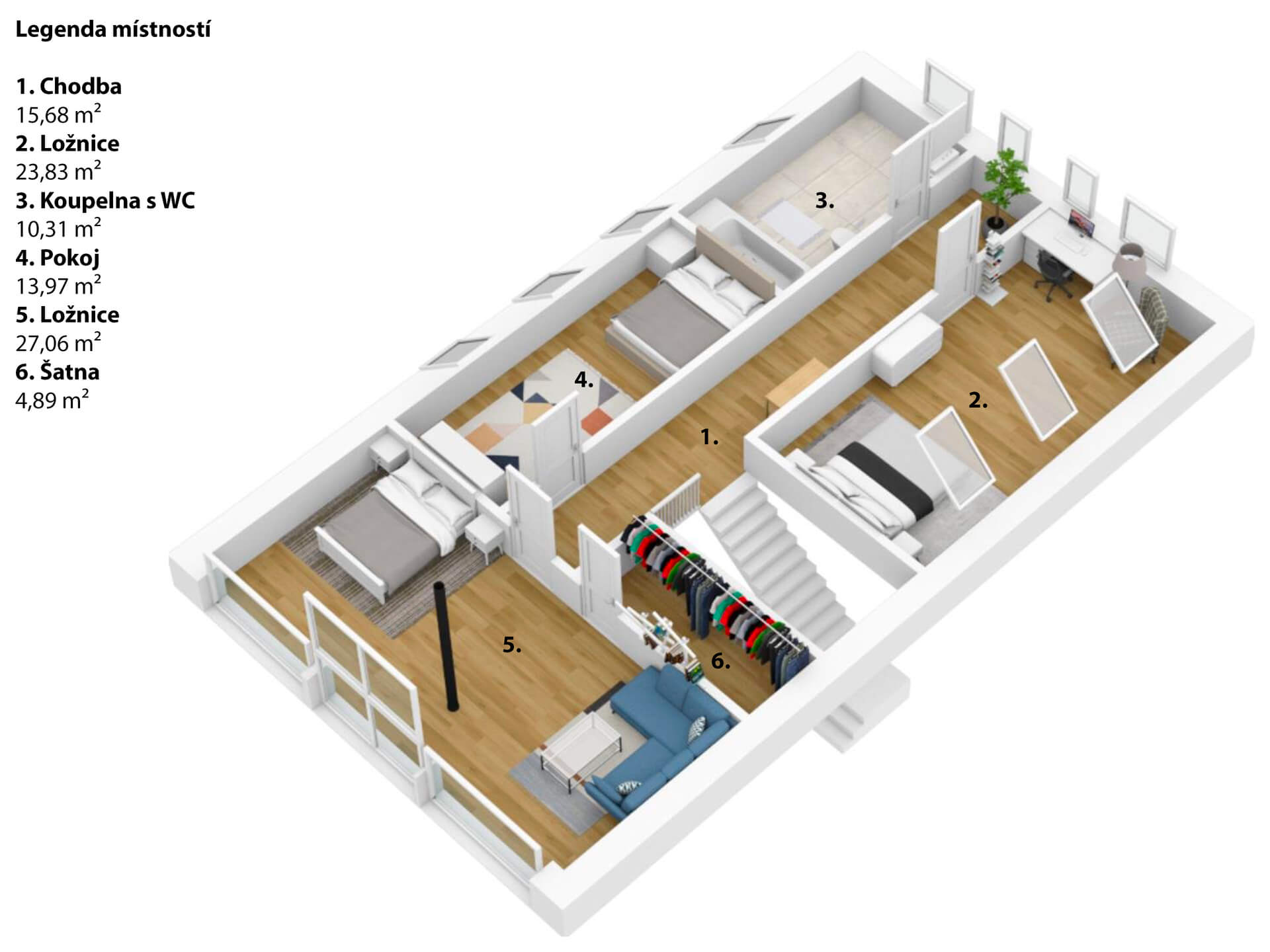 Dřevěné schodiště, které se nachází v obývacím pokoji vede do 2.NP a dovede Vás na rozlehlou chodbu (15,68 m2), ze které vedou dveře do úžasné prosklené ložnice se šatnou (27,06 m2 + 4,89 m2), hned vedle do pokoje (13,97 m2), do koupelny s vanou a WC (10,31 m2) a do posledního pokoje o výměře 23,83 m2.