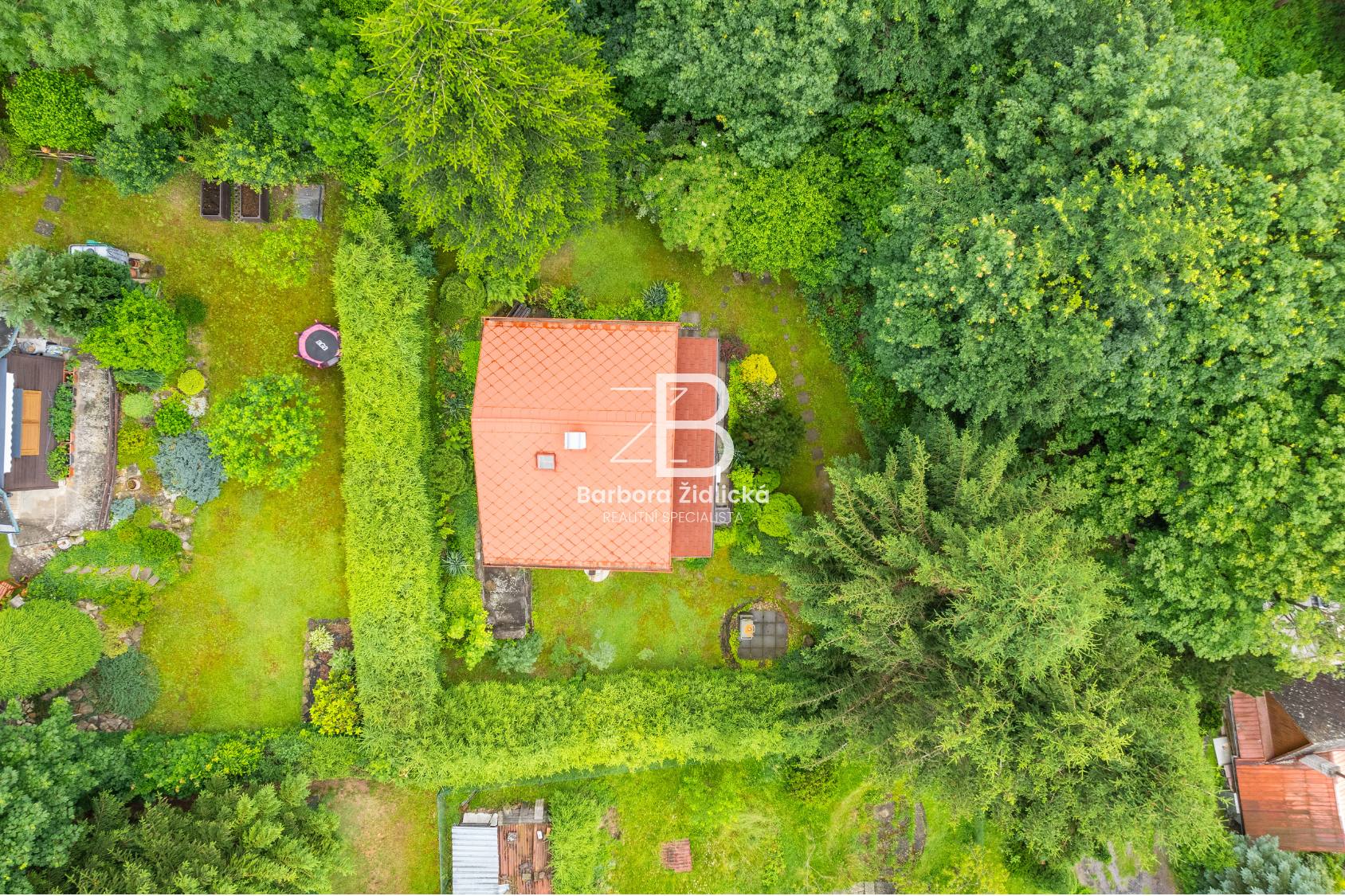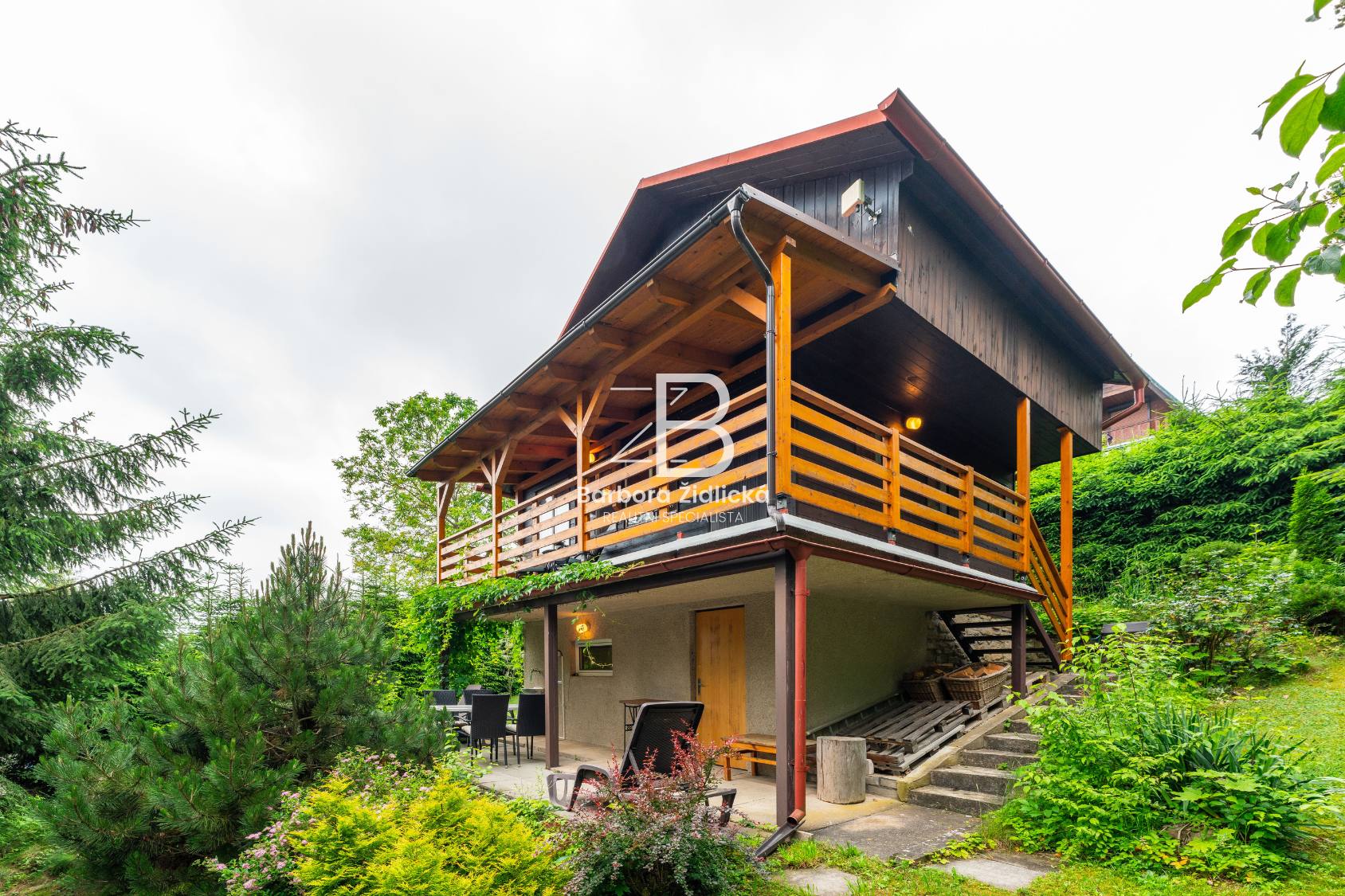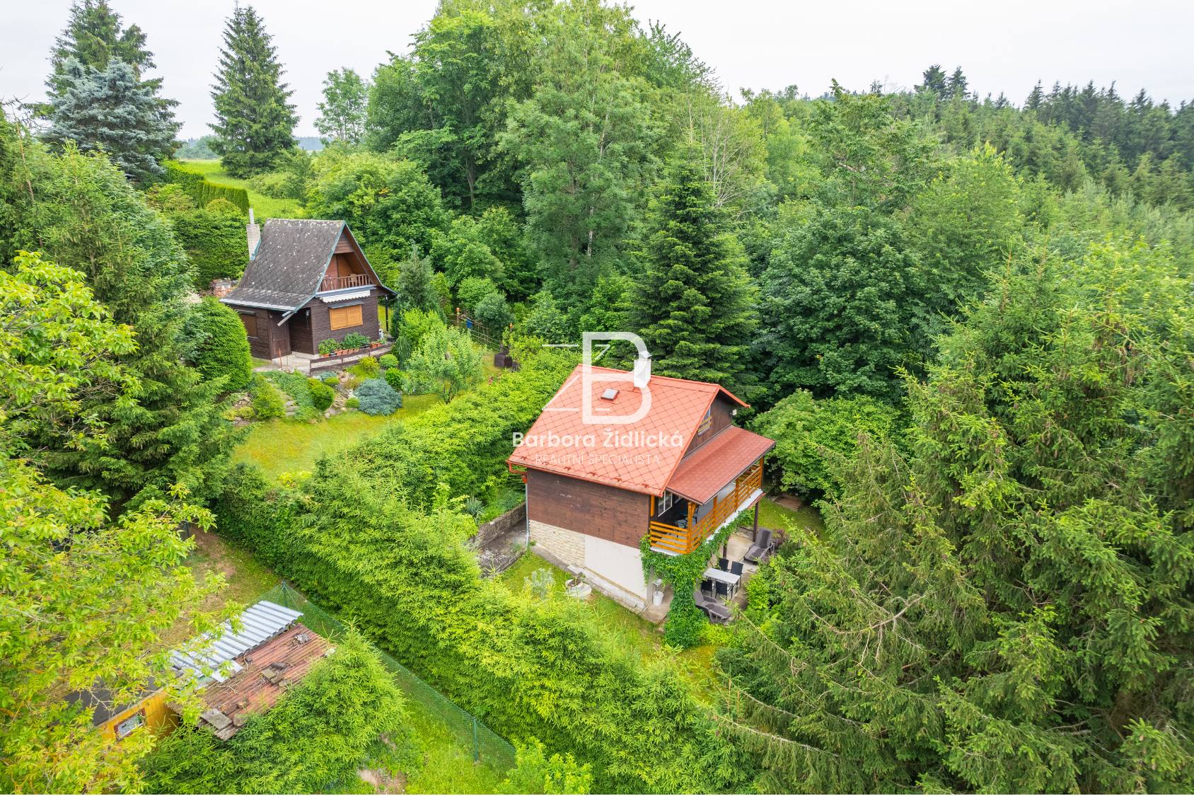 Rekreační chata v obklopení vzrostlých stromů, zajišťující dokonalé soukromí.