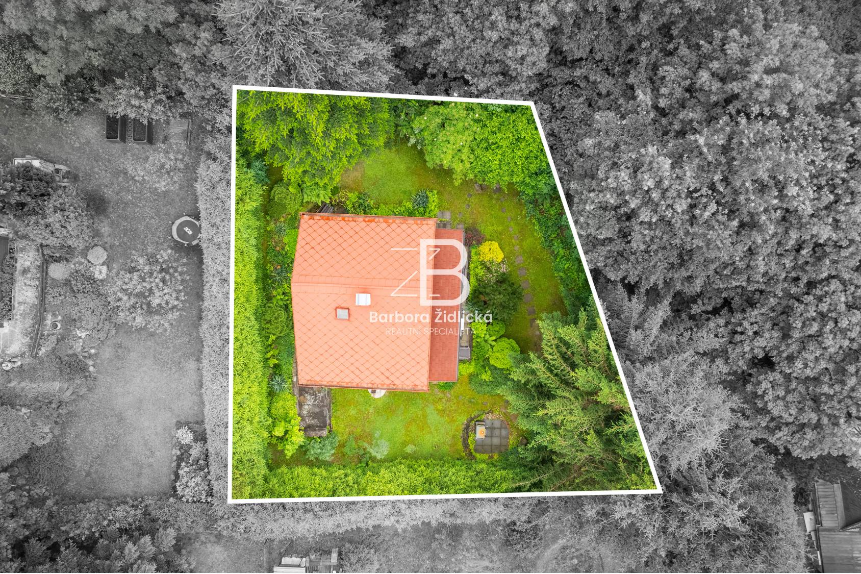 K pozemku o rozloze 347 m2 (z toho zastavěná plocha 48 m2) vede obecní příjezdová cesta, kde je možné i parkovat. Terasa i balkon jsou orientovány na jih, zahrada na západní stranu a je ohraničena plotem. V suterénu chaty se navíc nachází technická místnost a kůlna pro uložení zahradních a sezónních věcí.