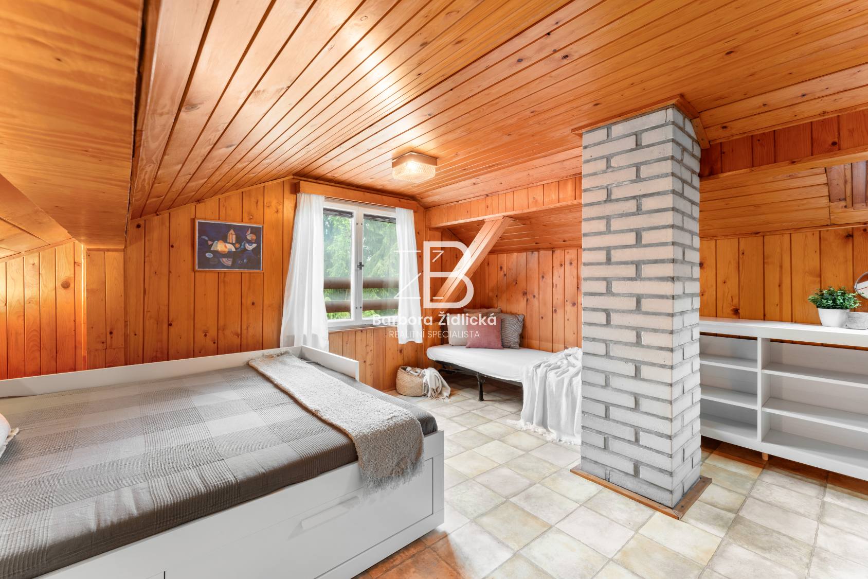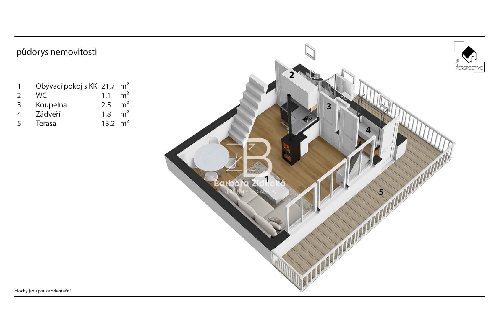 Stavba je smíšená a nabízí prostornou obývací místnost s krbem a výhledem do korun stromů, kuchyň s jídelním koutem, koupelnu se sprchou a WC. Vedle obytného podkroví se nachází i „půdní prostor“ pro uložení věcí. Chata se prodává kompletně vybavená a je tedy připravena k okamžitému užívání, případně i trvalému bydlení. Je ale vhodná i za účelem investice pro krátkodobý pronájem, a to pro celý rok. Je napojena na obecní vodovod (celoročně) a odpadní vody jsou svedeny do jímky. Vytápění je zajištěno přes krbová kamna a ohřev vody přes elektrický bojler.