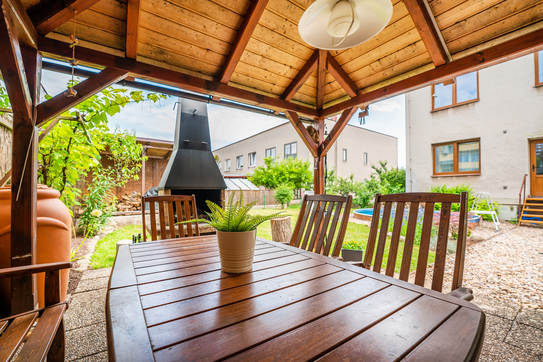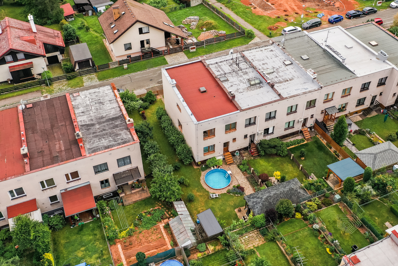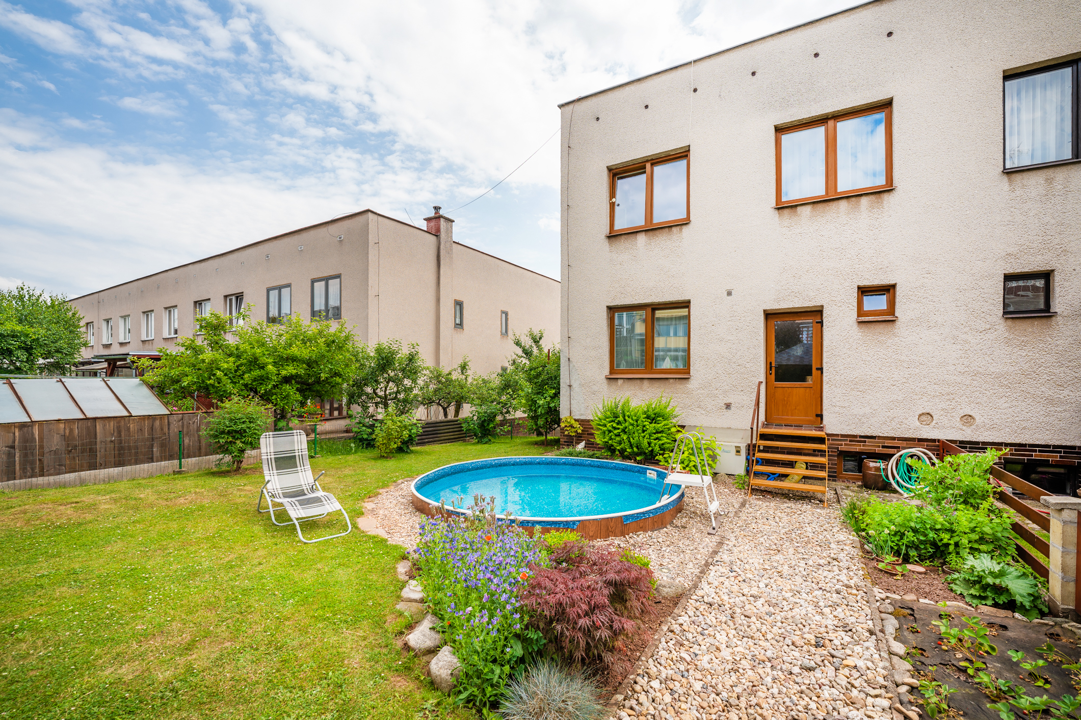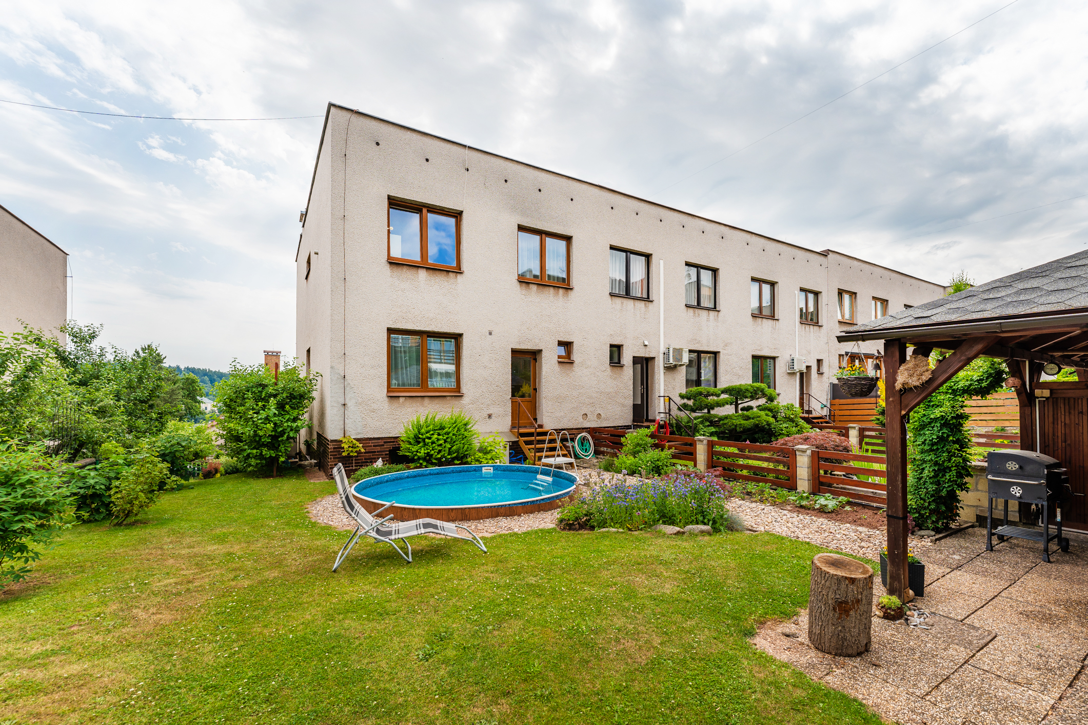 Na udržované zahradě o výměře 82 m2 se nachází bazén a terasa pro rodinné grilování. Vstup na zahradu je zajištěn i z prvního obytného patra. Parkování je možné v garáži, na pozemku a také na ulici. Příjezd k pozemku je po místní asfaltové komunikaci.