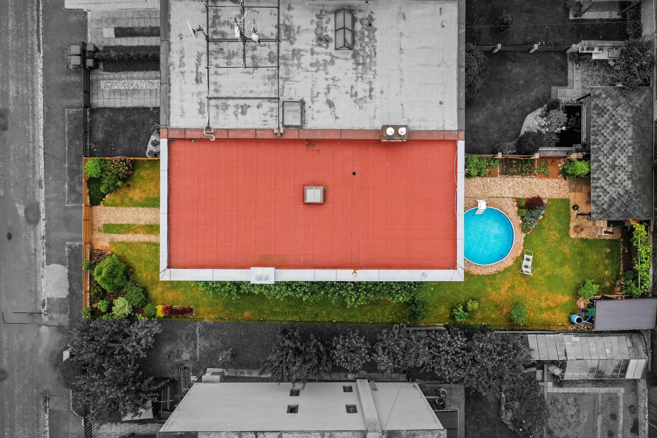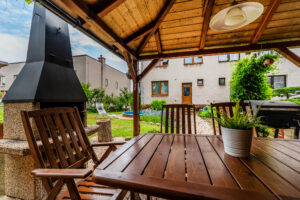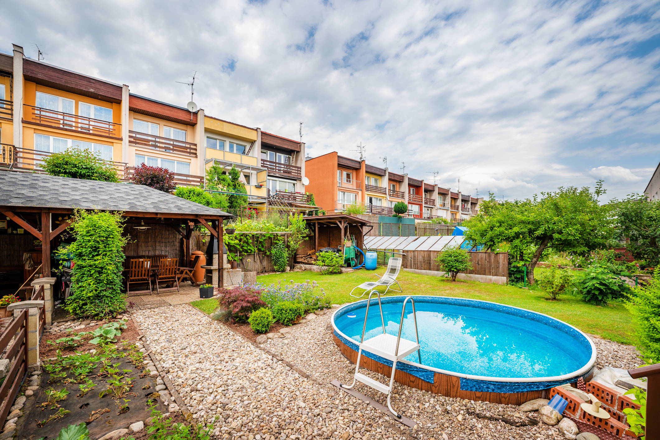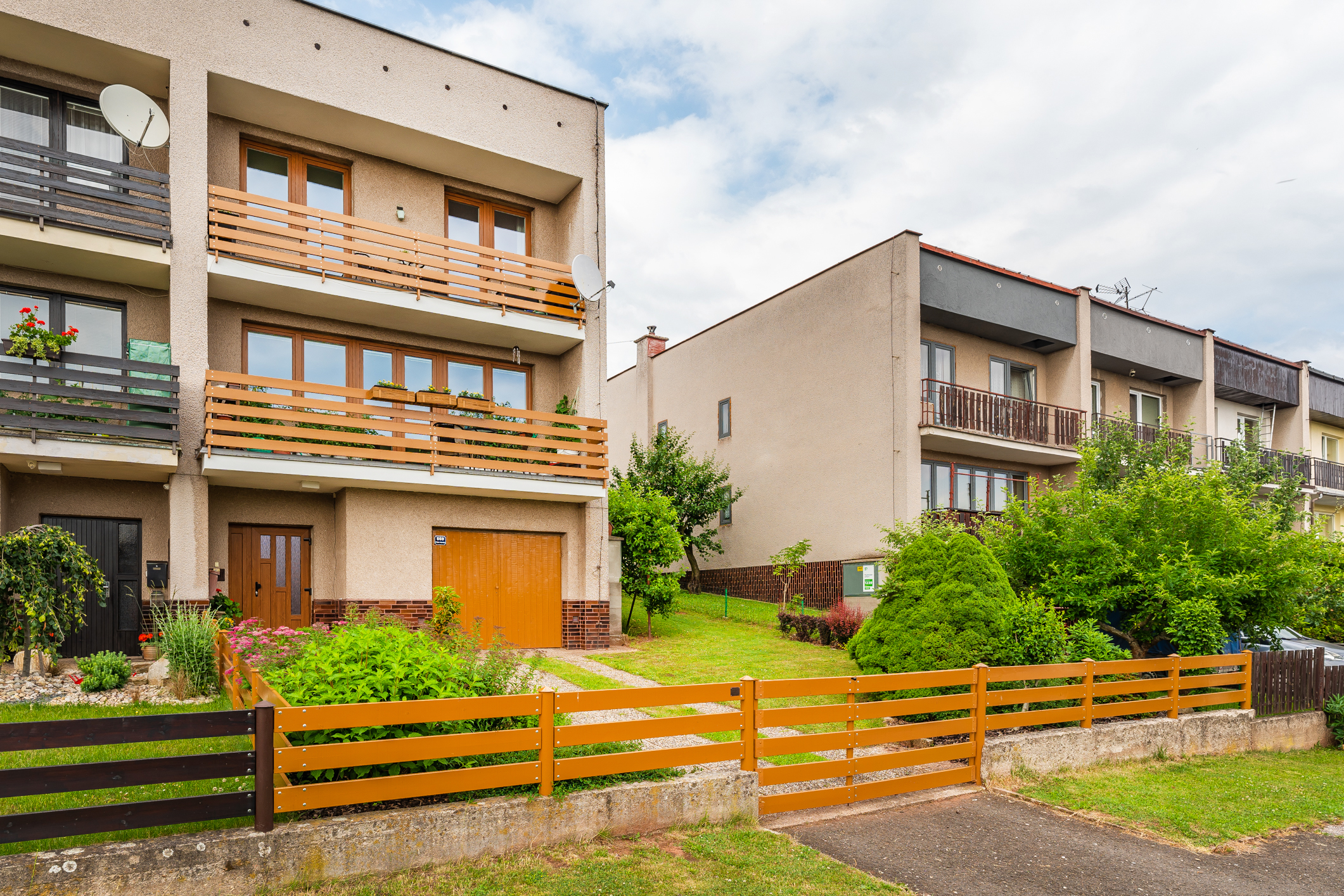 Na udržované zahradě o výměře 82 m2 se nachází bazén a terasa pro rodinné grilování. Vstup na zahradu je zajištěn i z prvního obytného patra. Parkování je možné v garáži, na pozemku a také na ulici. Příjezd k pozemku je po místní asfaltové komunikaci.