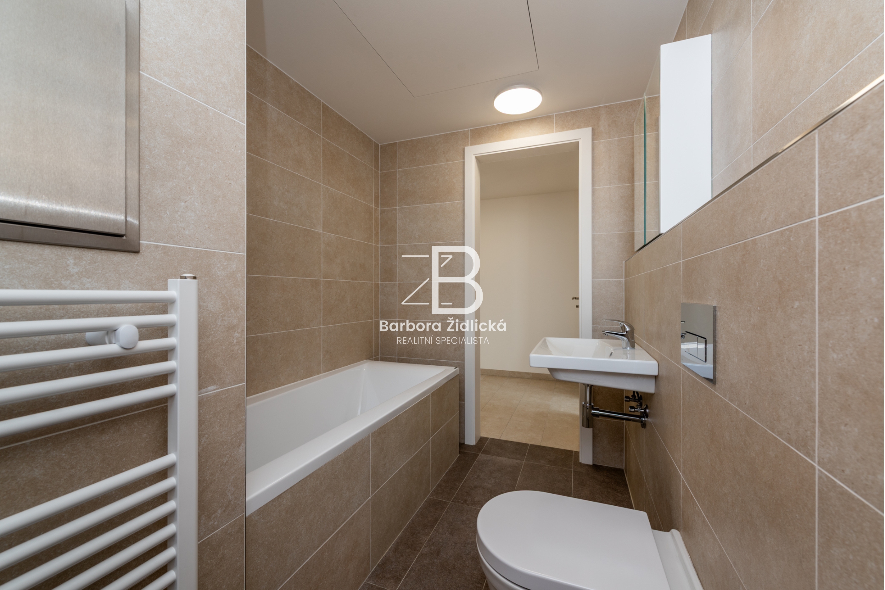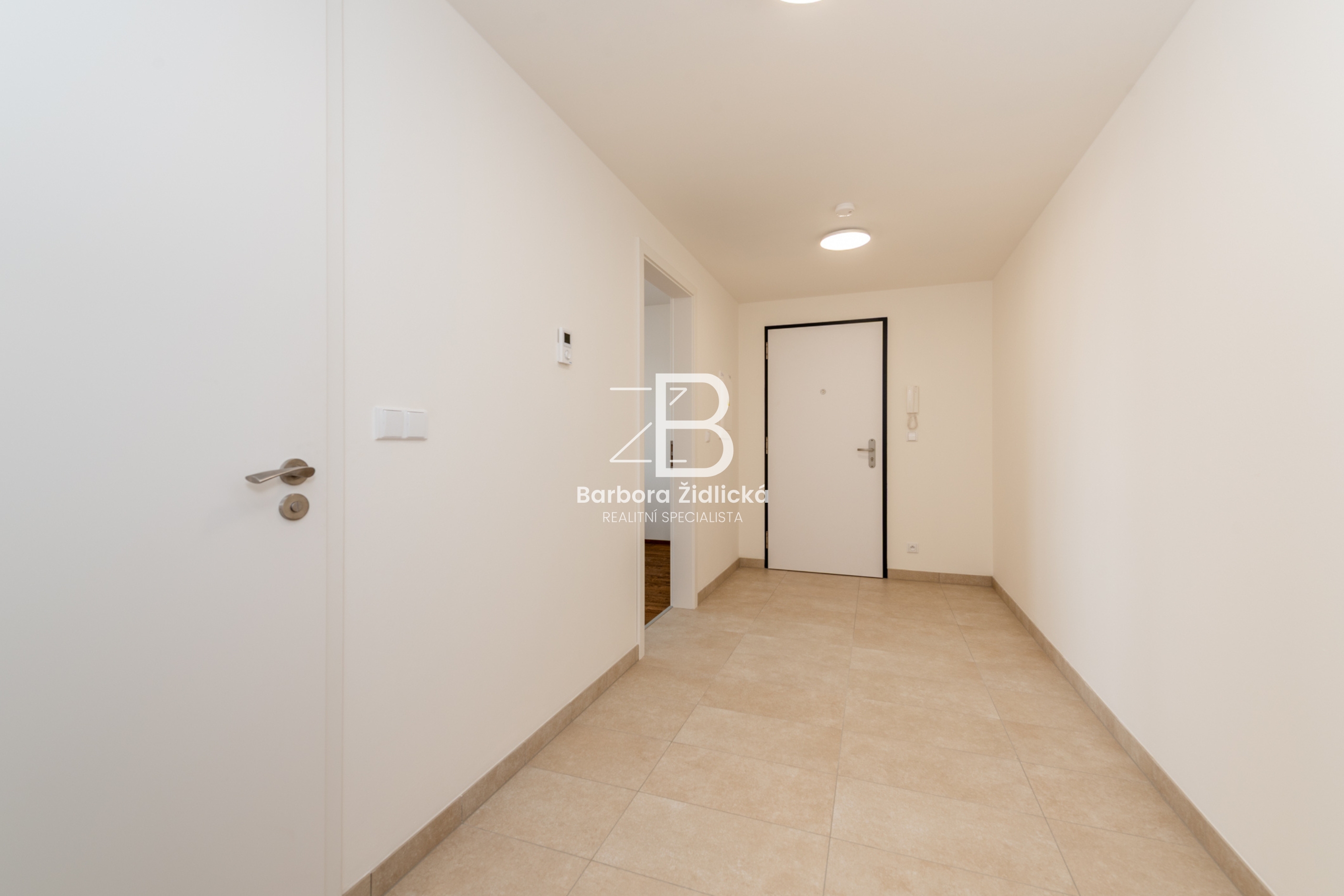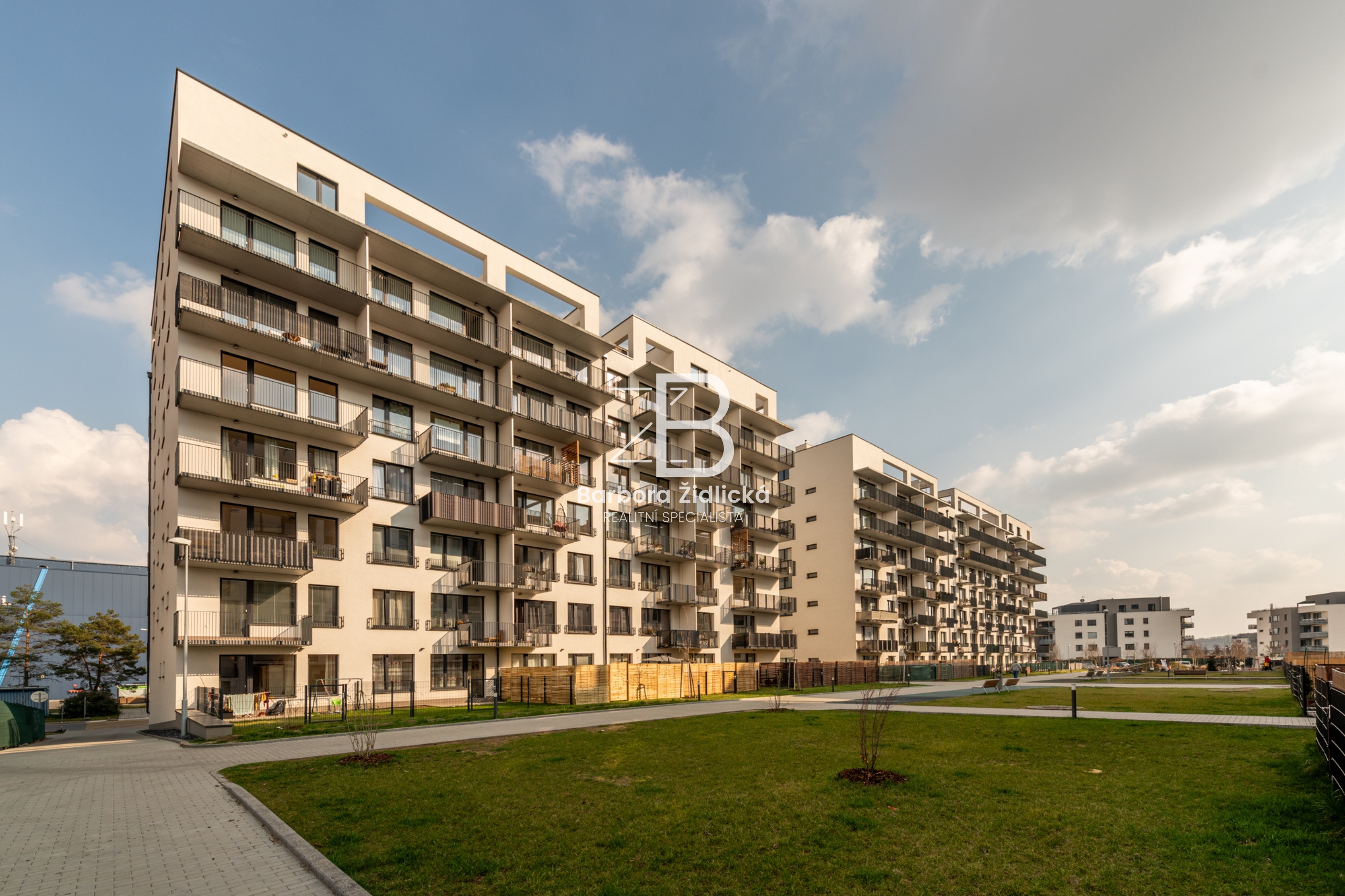 Dlouhodobý pronájem bytu o dispozici 2+kk s balkonem 9m2. Součástí pronájmu je i sklep o rozloze 2m2 a garážové stání. V domě je také kolárna. Kuchyňská linka je včetně vestavěné myčky, lednice s mrazákem, trouby, mikrovlnné trouby, sklokeramické desky a digestoře. V bytě je rekuperace a také jsou nainstalovány vnitřní žaluzie.