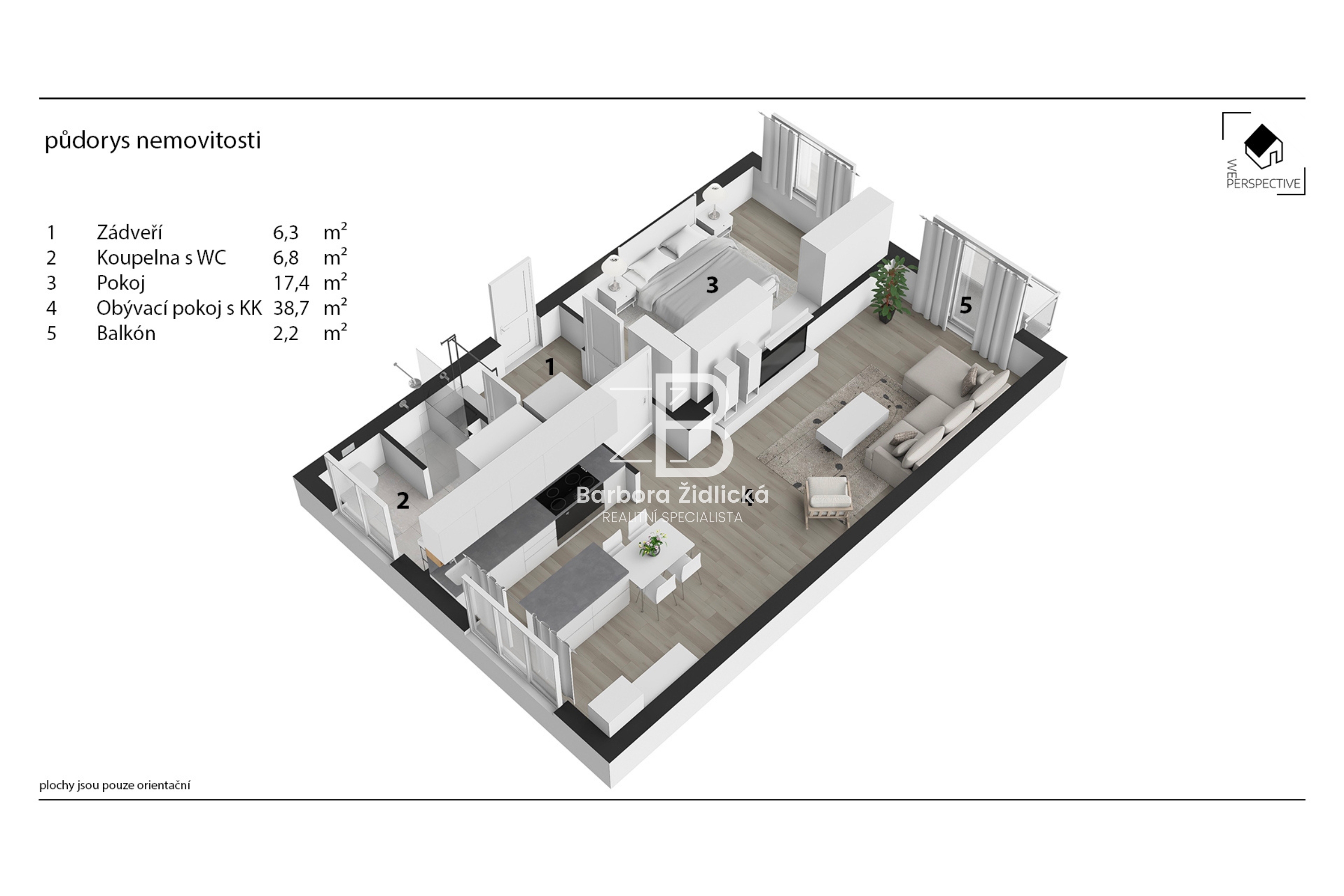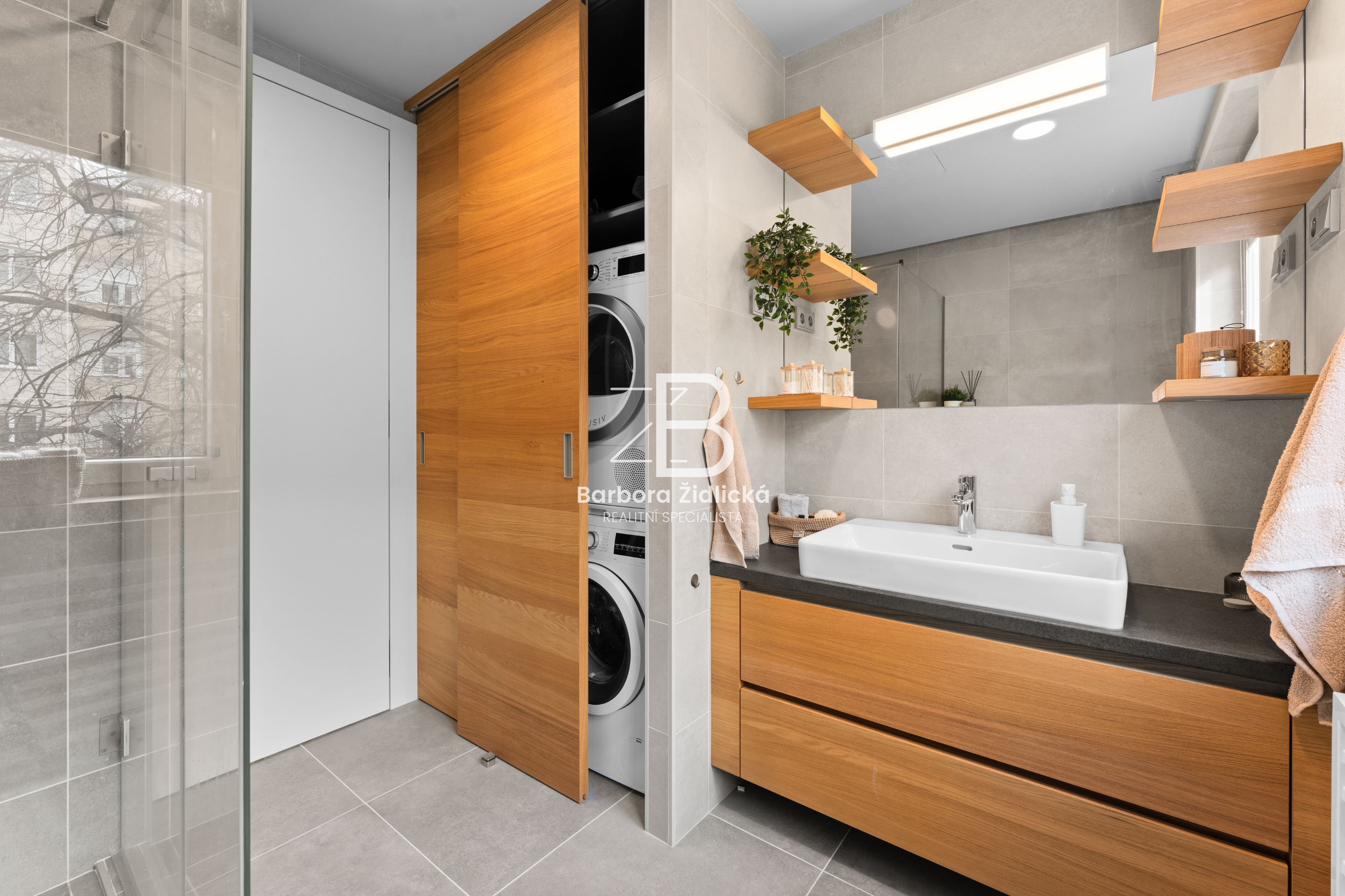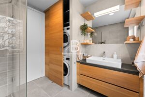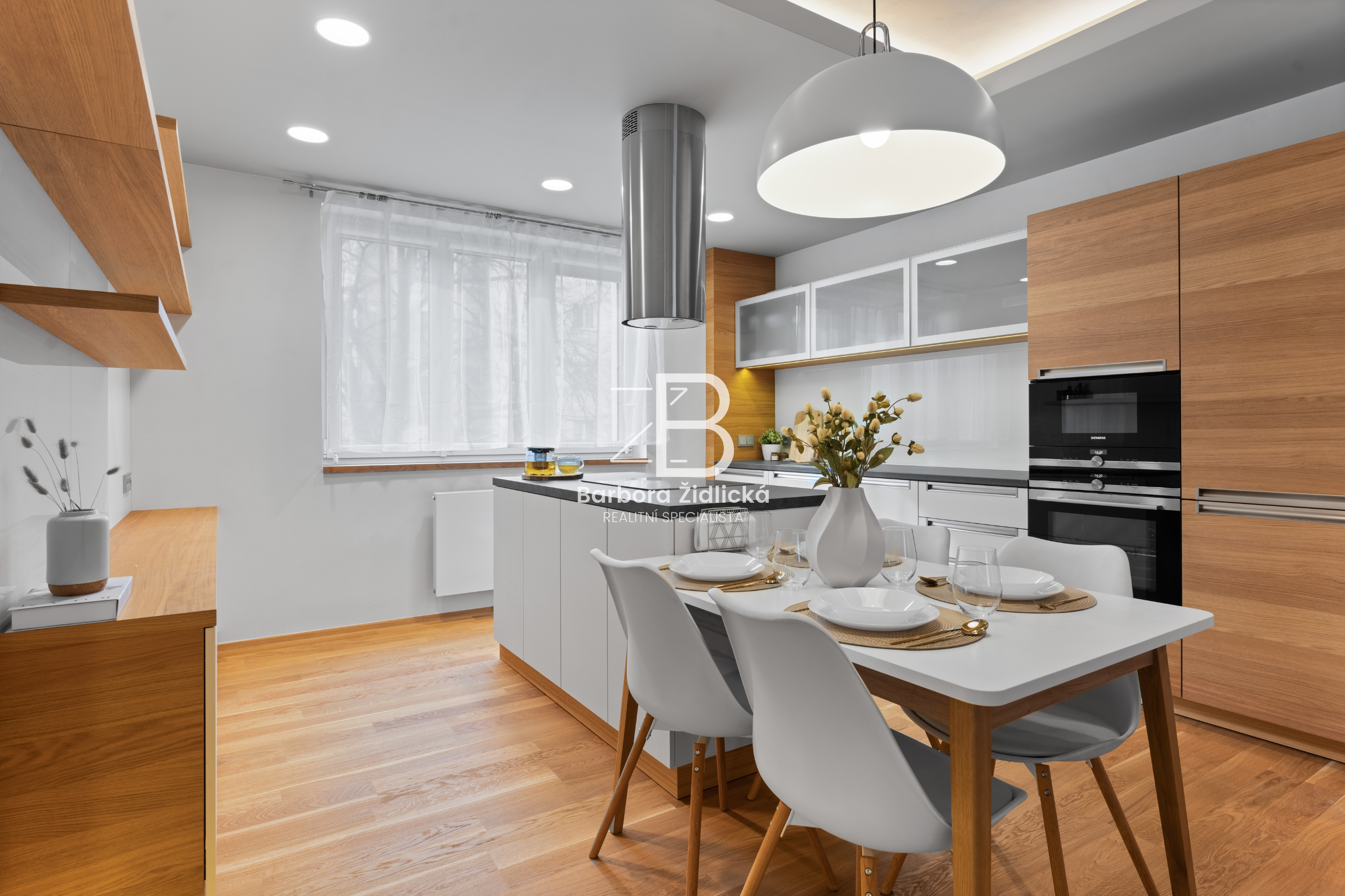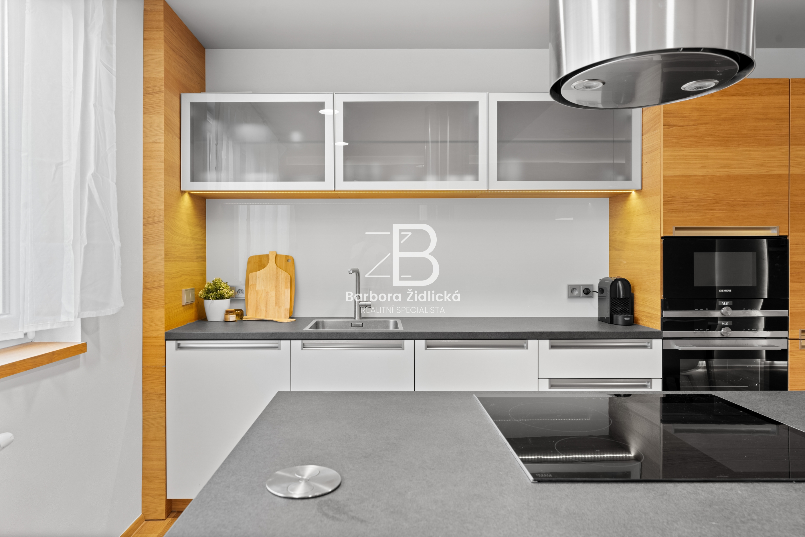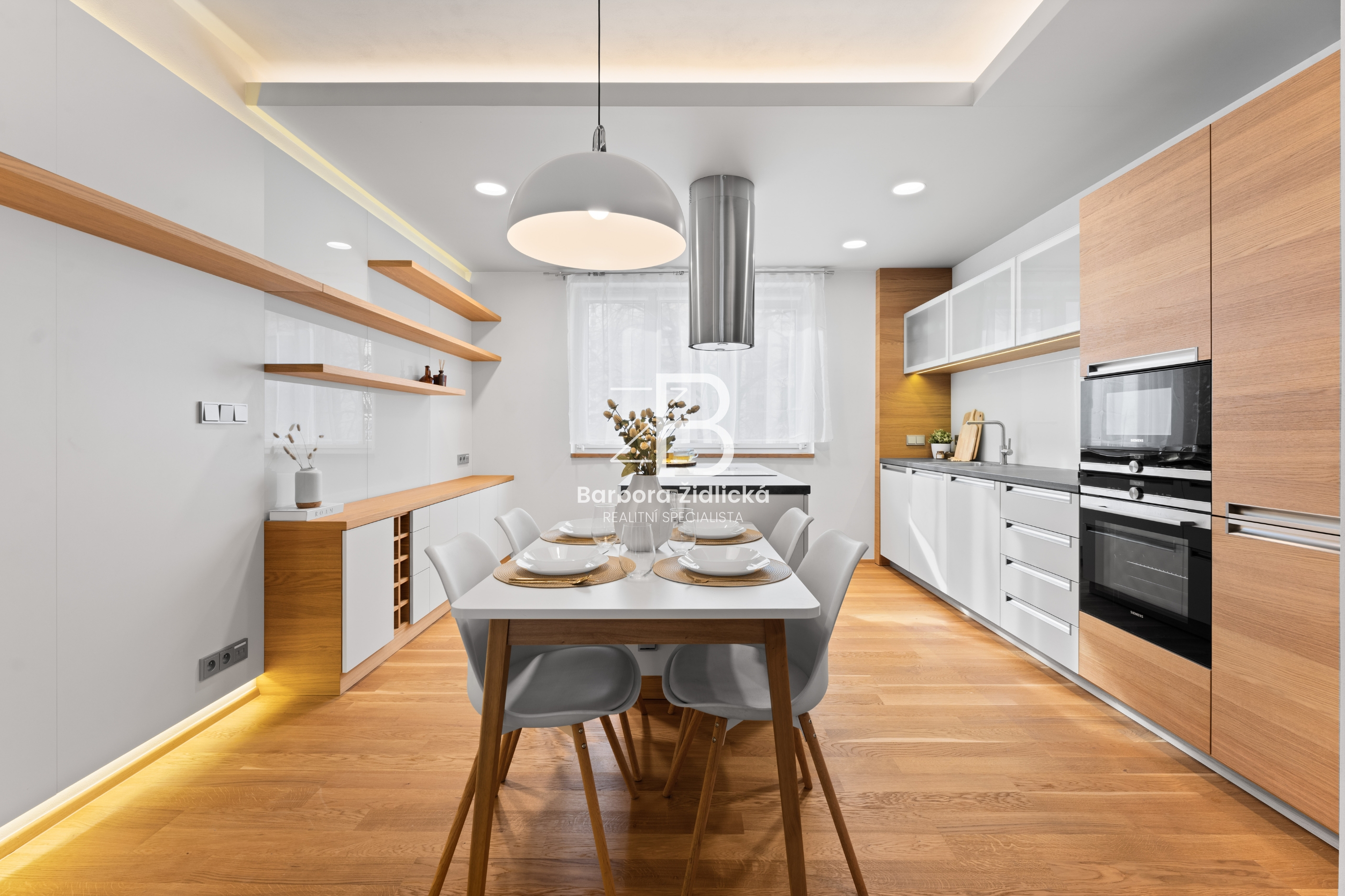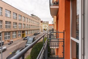 Byt se nachází ve druhém patře cihlového domu s výtahem. Kuchyňská linka je vybavena vestavěnou myčkou, horkovzdušnou troubou, mikrovlnnou troubou, lednicí, mrazákem, indukční deskou, digestoří a novým kuchyňským nádobím. Veškerý nábytek zachycený na fotografiích je součástí pronájmu. K bytu dále náleží sklep a balkon se vstupem z obývacího pokoje.