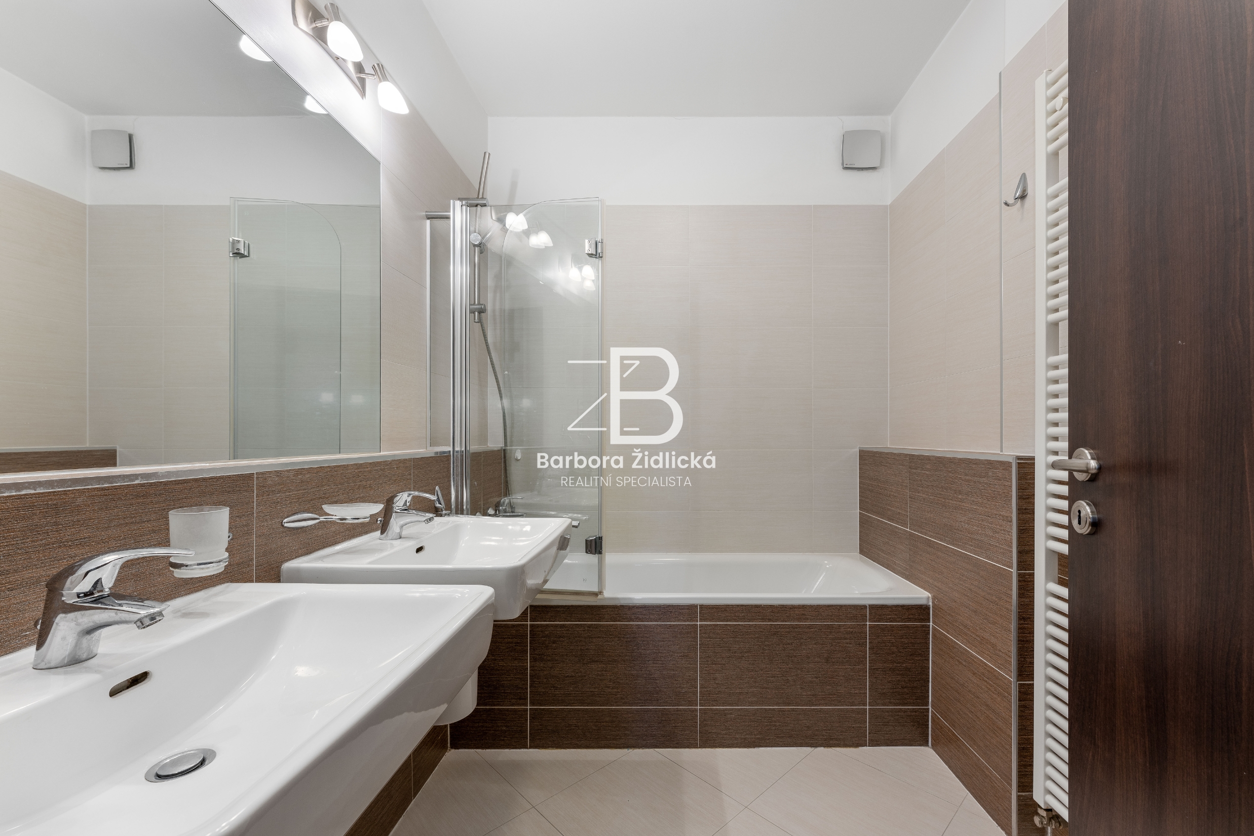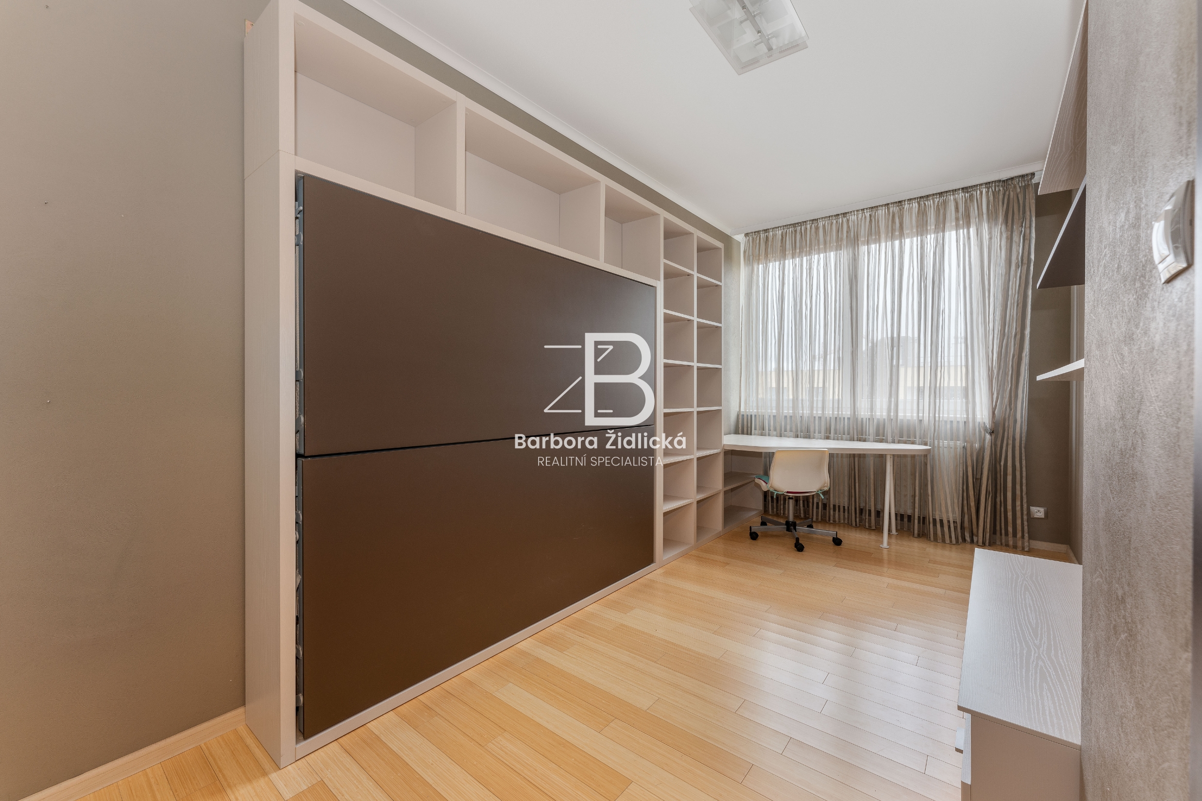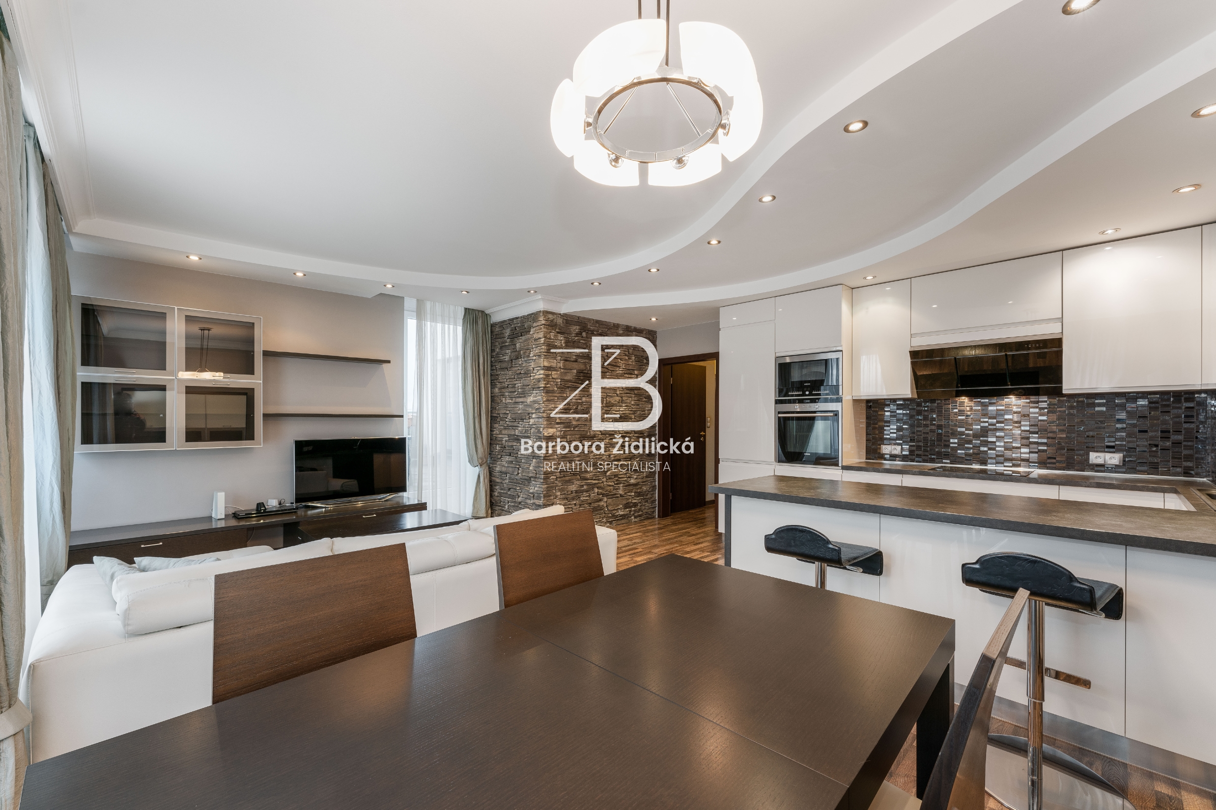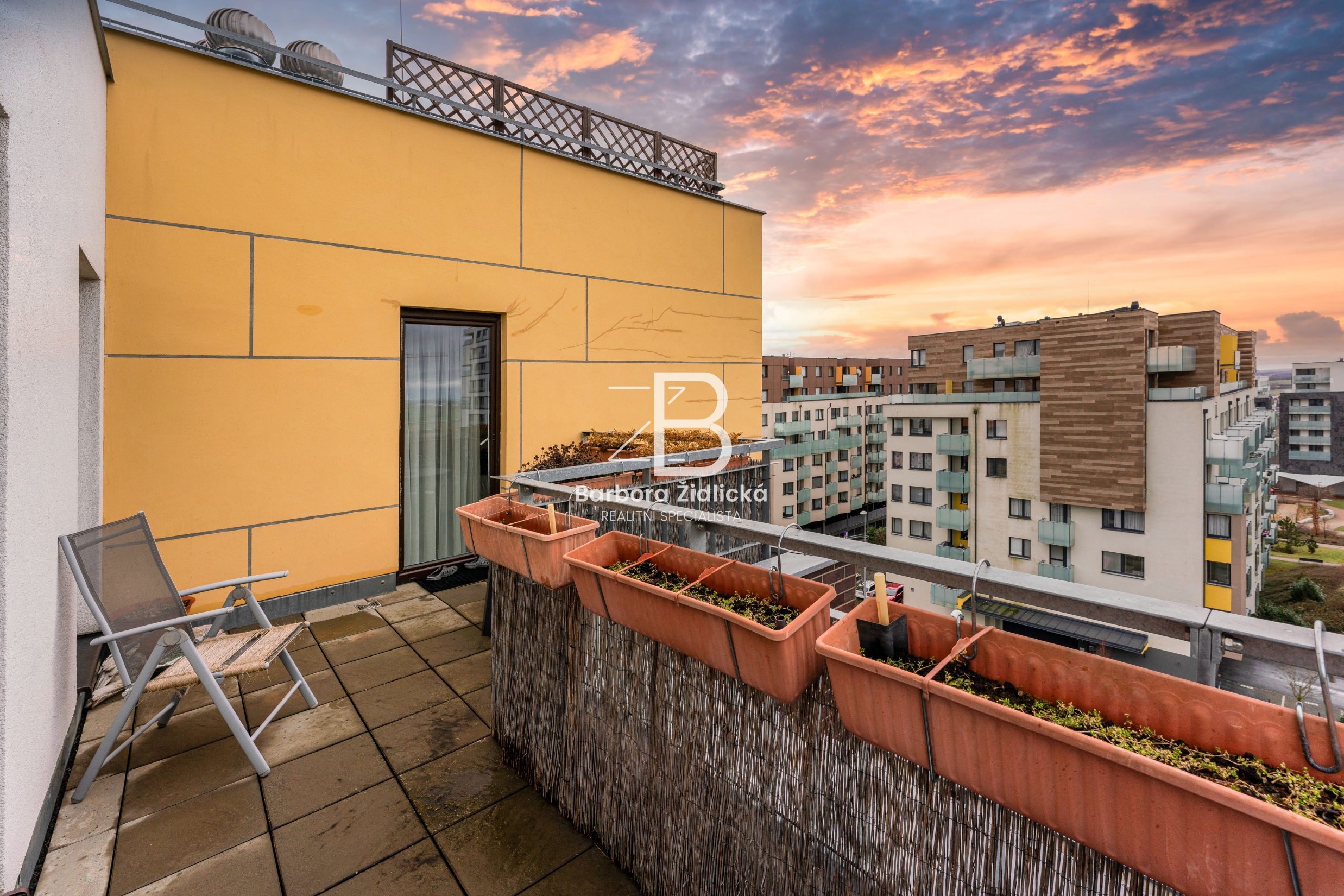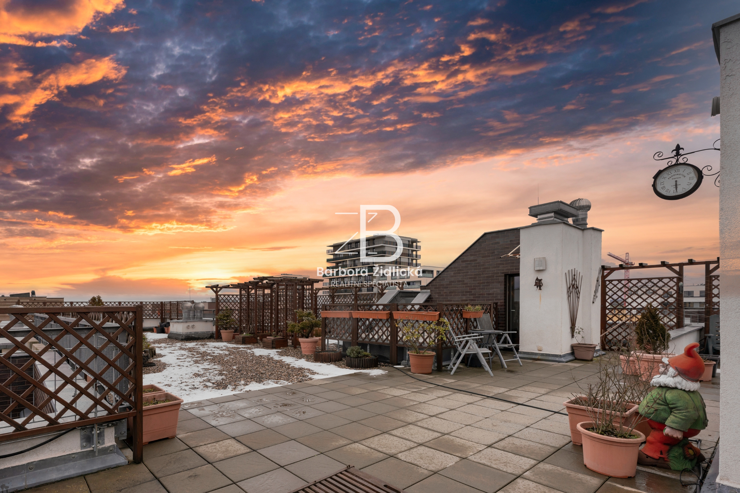 Pronájem nadstandardního bytu o dispozici 4+kk se střešní terasou o velikosti 200m2, kde si můžete užívat večery s pohledem na západ slunce. K bytu náleží i druhá terasa o výměře 13m2, která je přístupná z obývacího pokoje. Součástí pronájmu je i vnitřní parkovací stání. Možno pronajmout i druhé parkovací stání, které není zahrnuté v ceně.