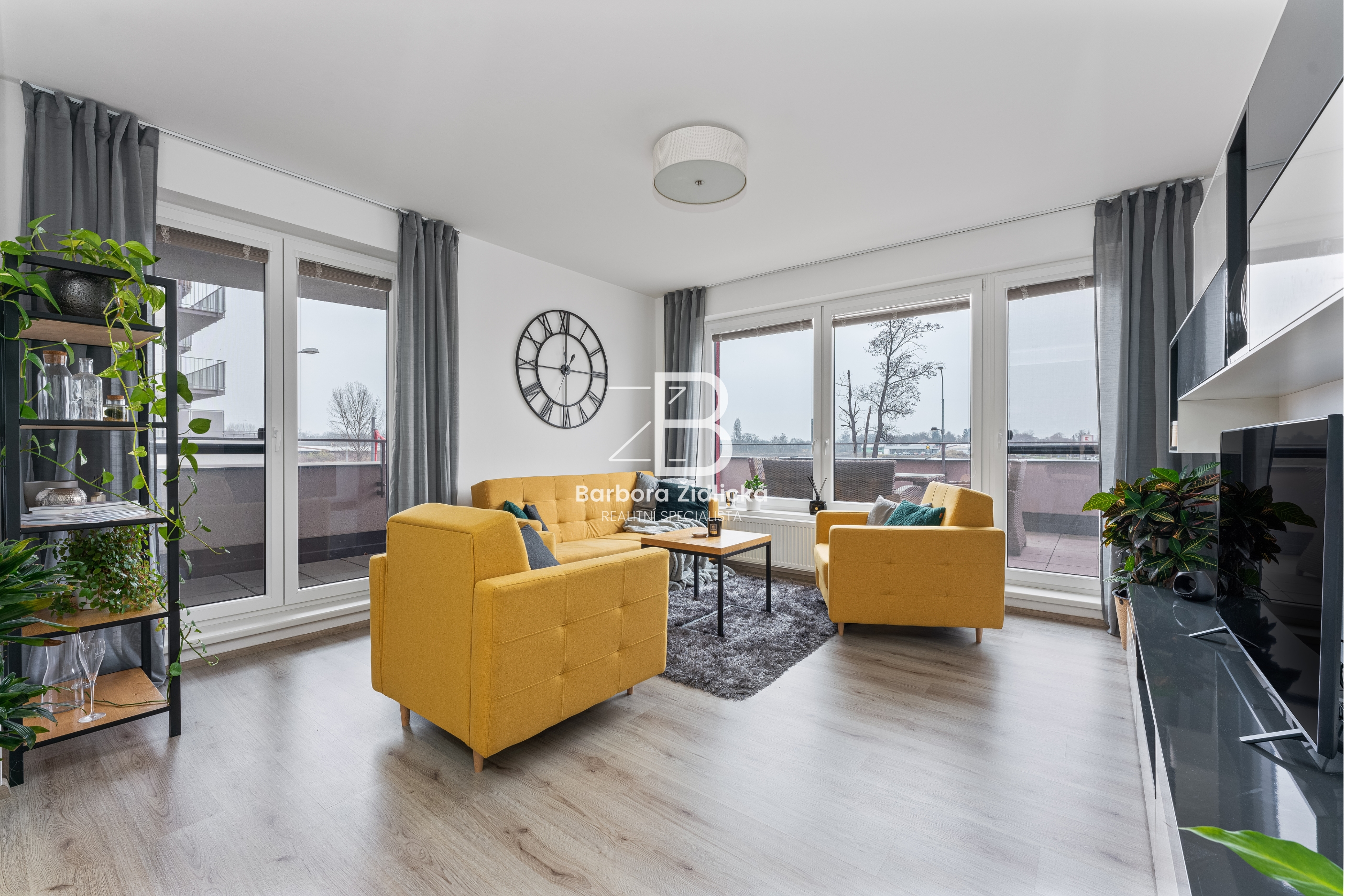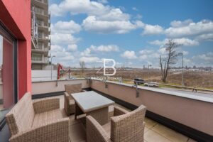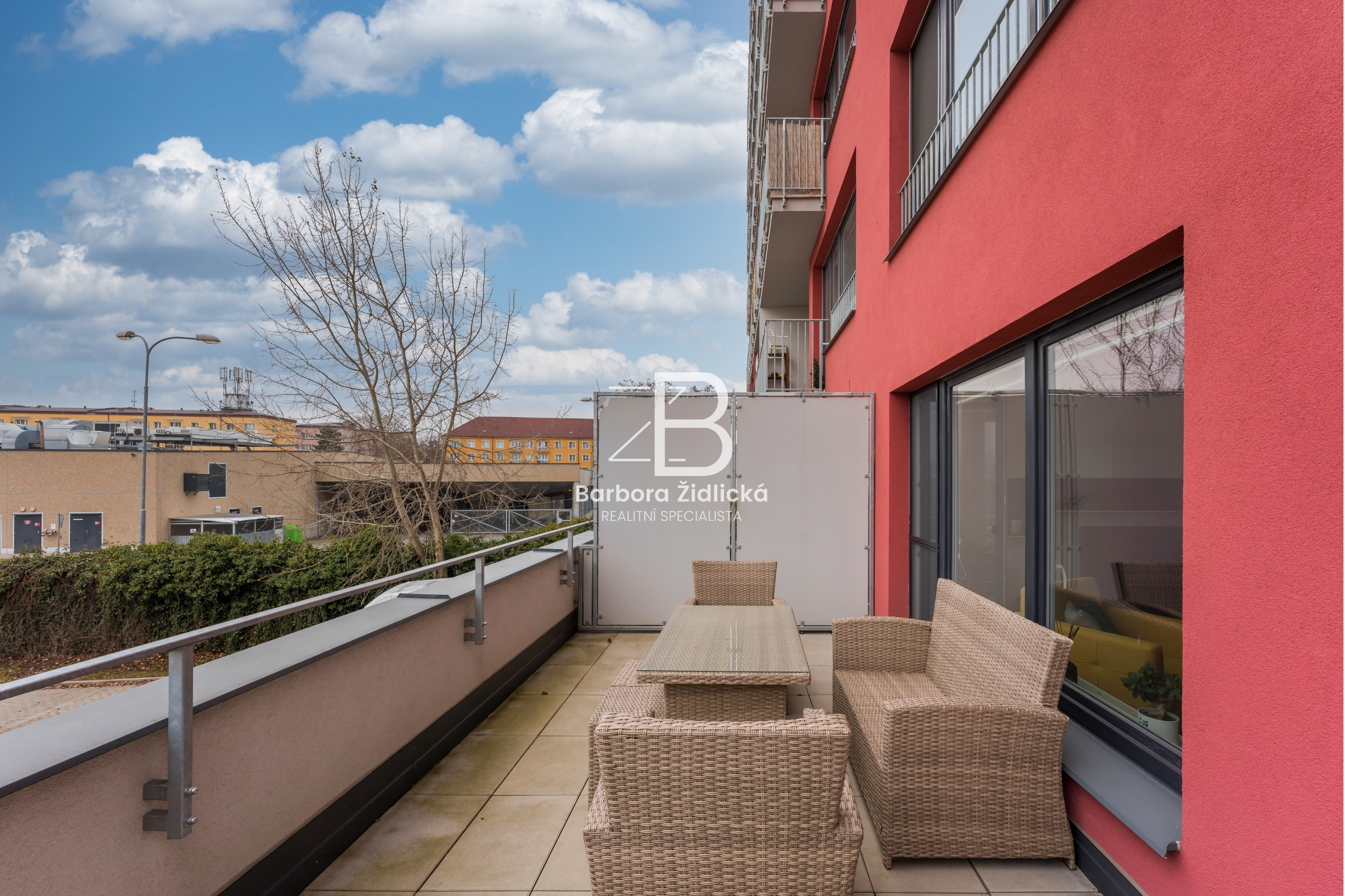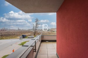 Byt se nachází v 1. patře cihlového domu, který je opatřen kamerovým systémem. Velkou dominantou je prostorná terasa, která je z jedné strany zastřešená. Jsou zde dvoje balkonové dveře a na oknech jsou nové sítě proti hmyzu.