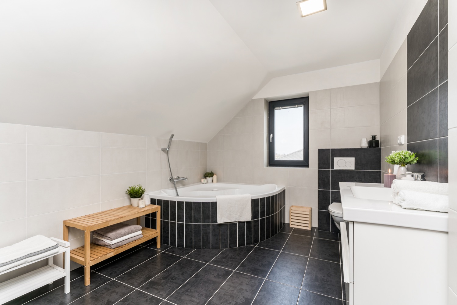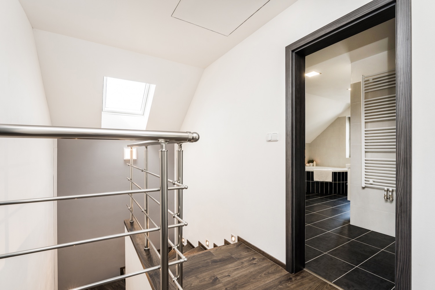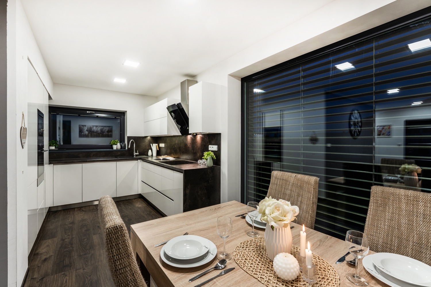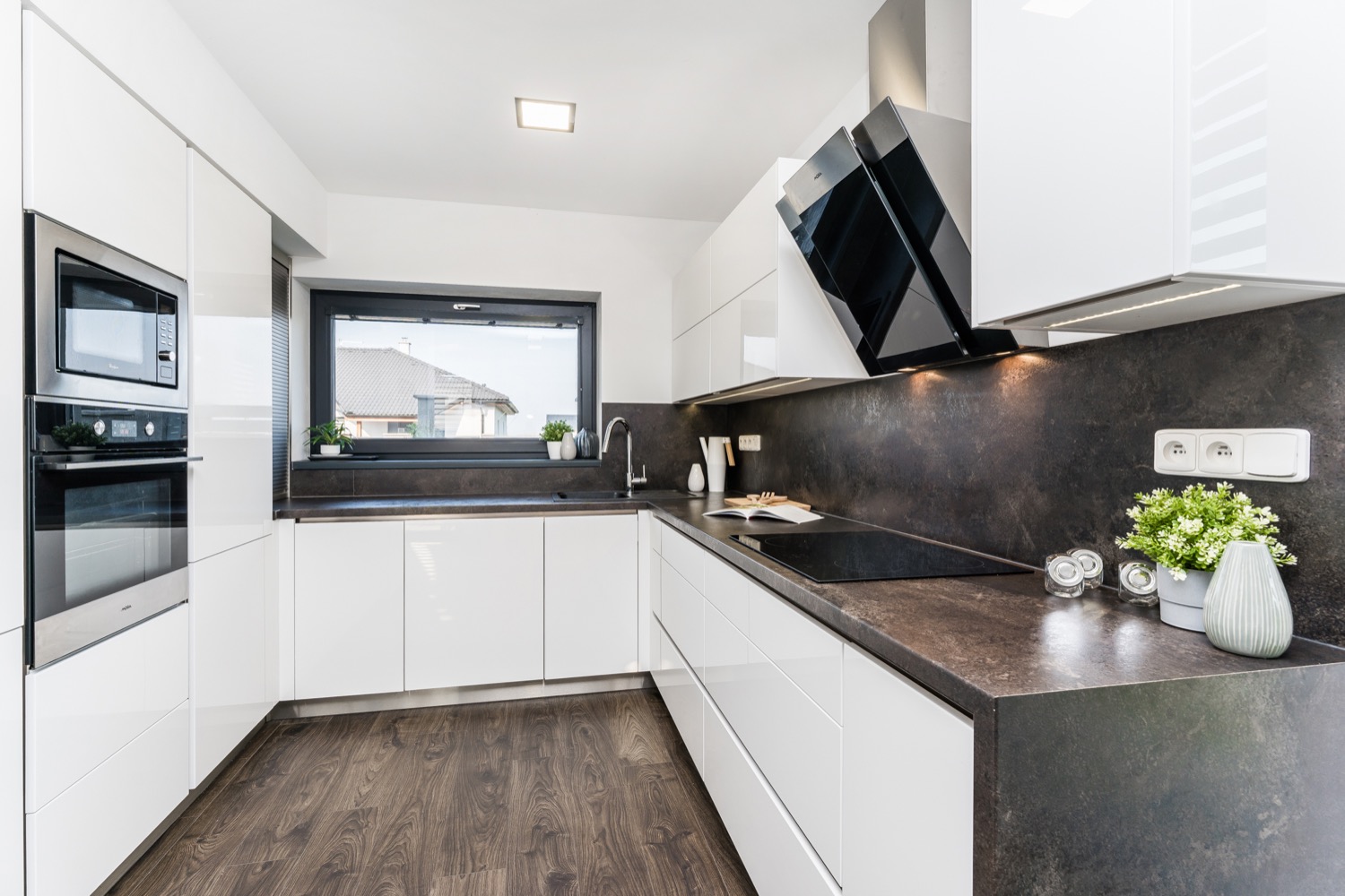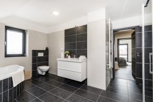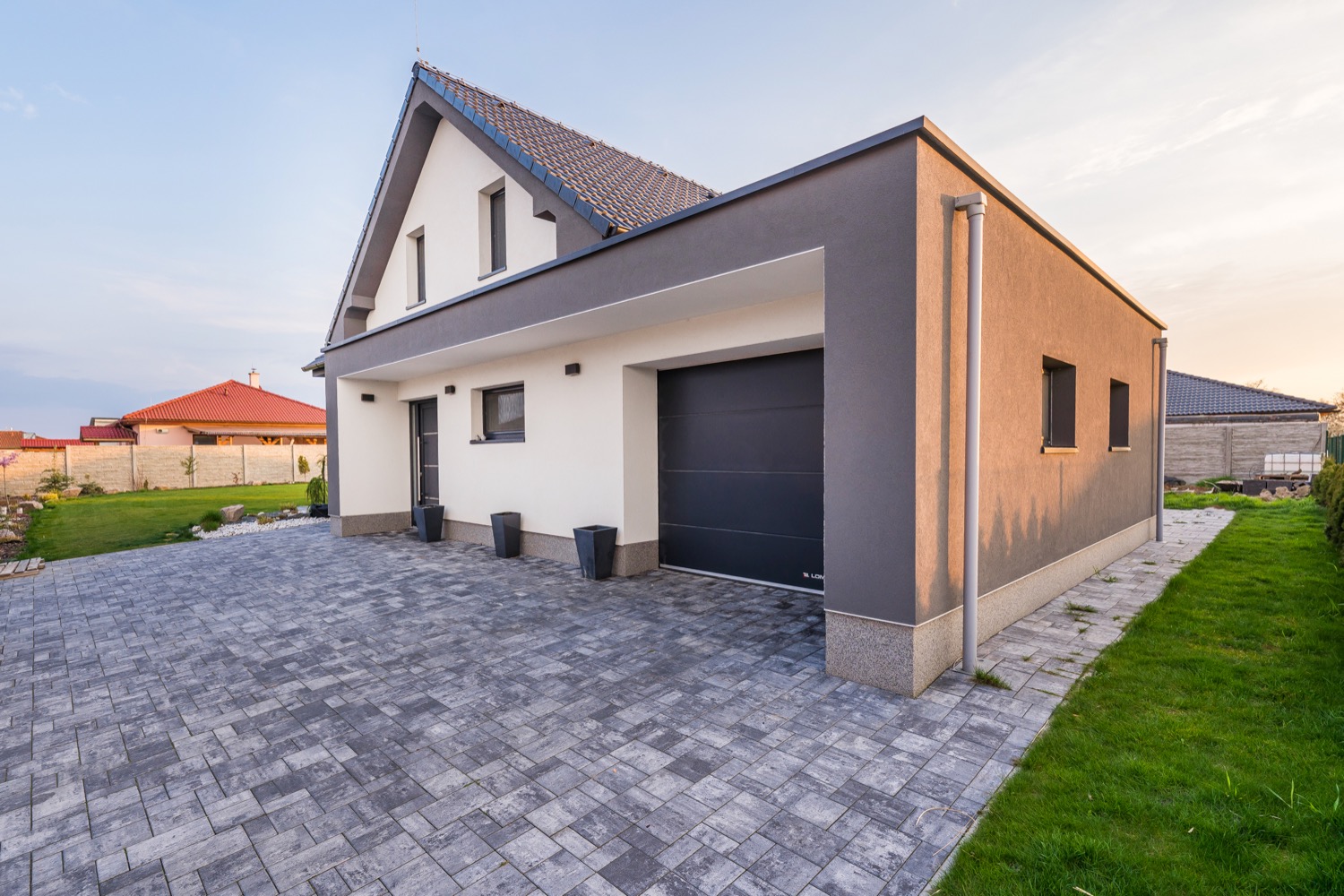 Dostatek světla poskytují plastová okna s izolačním trojsklem. O teplo domova se postará podlahové teplovodní vytápění, krbová kamna a elektrický kotel. V letních dnech se horko dovnitř nedostane díky venkovním elektrickým žaluziím a venkovním elektrickým roletám LOMAX. Pokud máte rádi moderní technologie, můžete je ovládat i pomocí Vašeho mobilního telefonu. Nezapomnělo se ani na hmyz, před kterým Vás ochrání posuvné dveřní sítě proti hmyzu a sítě integrované v roletách. Jelikož má pozemek velkorysých 915m2, určitě Vás potěší automatický zavlažovací systém GARDENA, který čerpá vodu z vrtané studny. Velká zahrada orientovaná na jih navíc nabízí spoustu prostoru pro umístění bazénu a zahradního domku. Dům je postaven z cihel HELUZ o tloušťce 300mm a zateplen polystyrenem o tloušťce 200mm. Obvodové stěny tvoří cihelné bloky s tepelnou izolací jako výplň dutin. Zateplená je rovněž i zemní stavba a podkrovní stropy. Střecha je tvořena kombinací střechy sedlové BRAMAC se sklonem 40° se skrytými okapními žlaby a z části střechy ploché. Nádvoří je pokryto betonovou dlažbou a interiér domu vinylovou podlahou QUICKSTEP sjednocenou v přízemí i v patře dekorem dřeva.