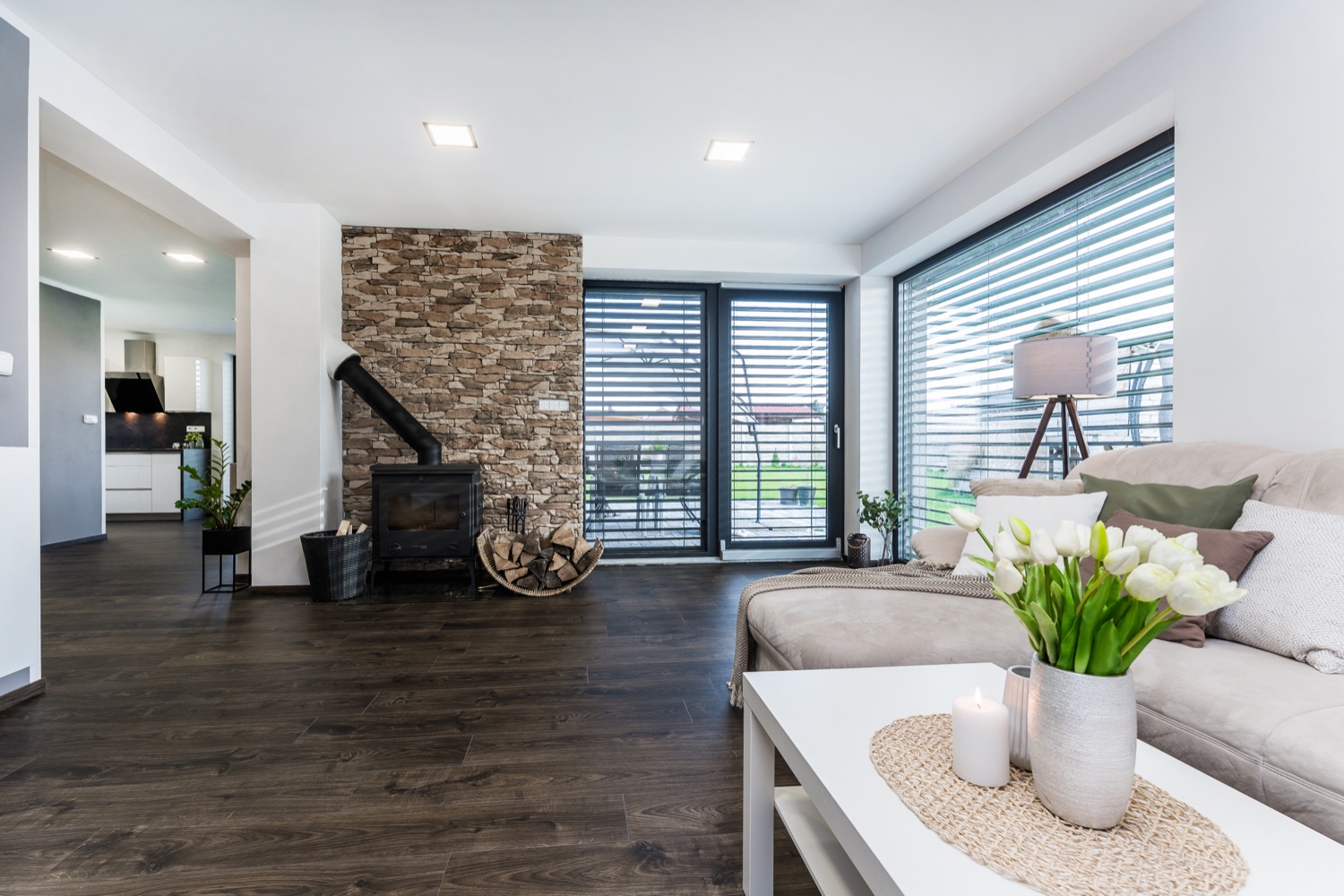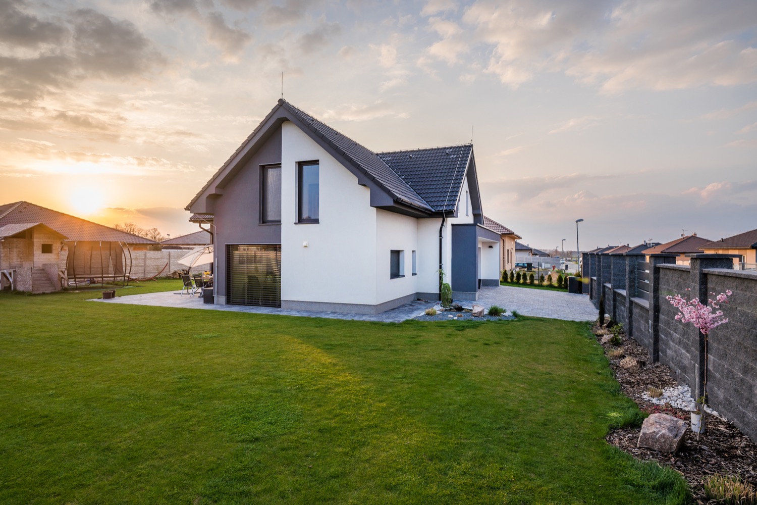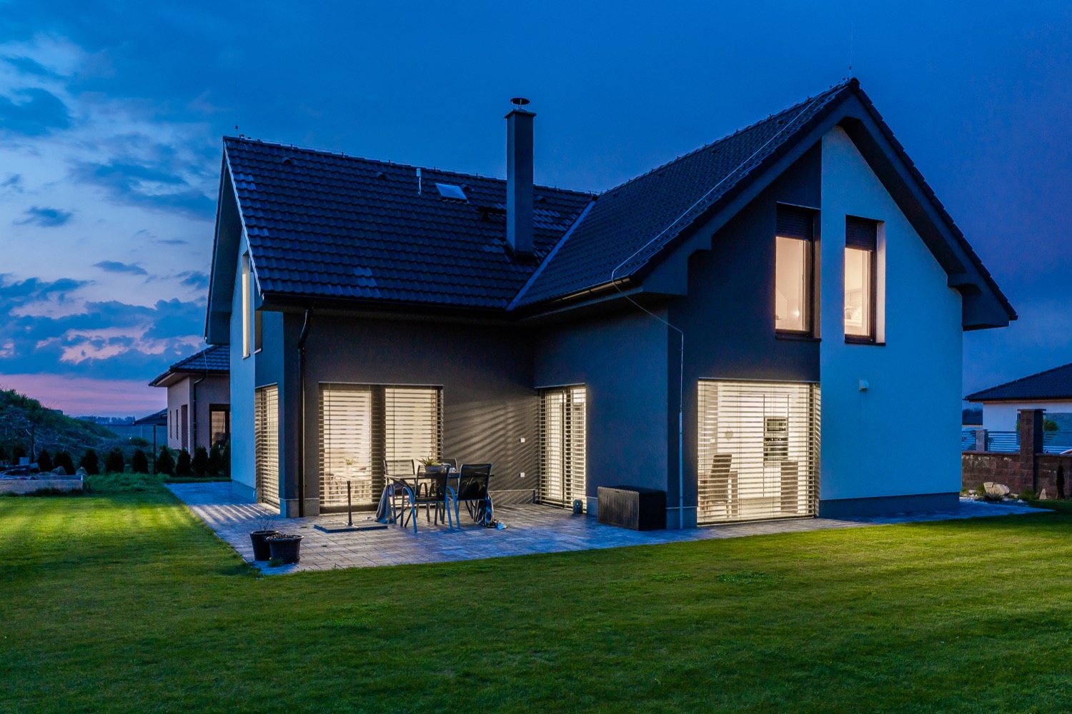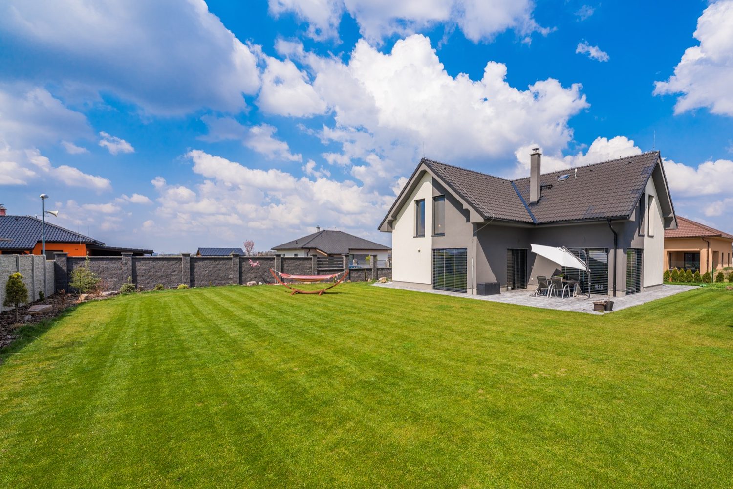 garáž, venkovní elektrické žaluzie a rolety, podlahové vytápění, zavlažovací systém, studna