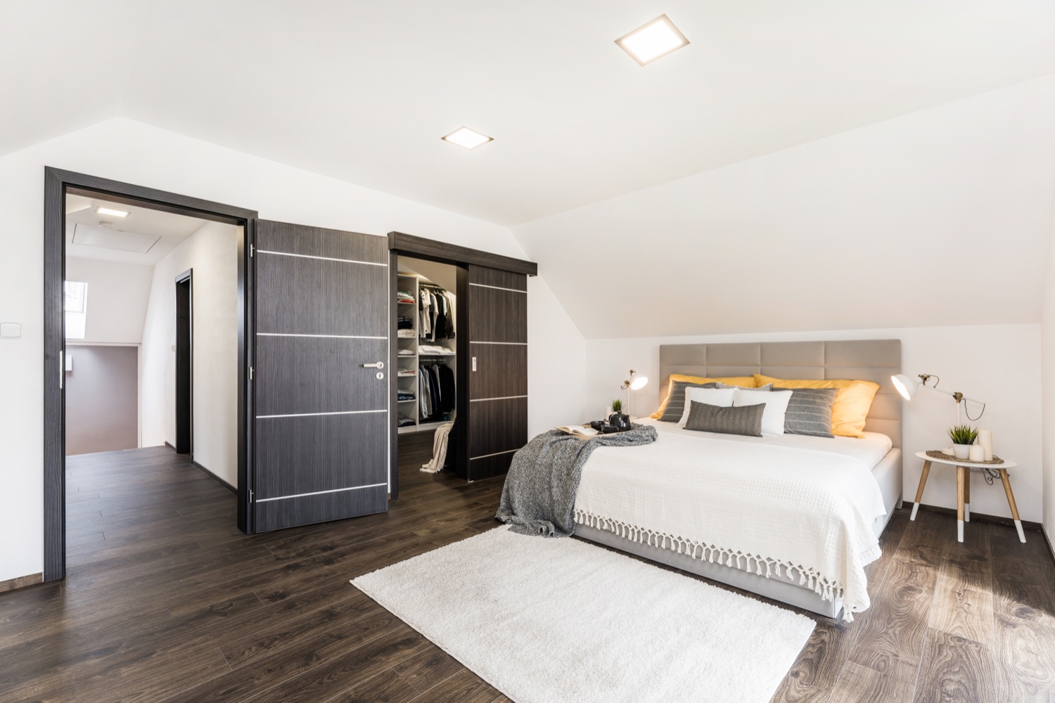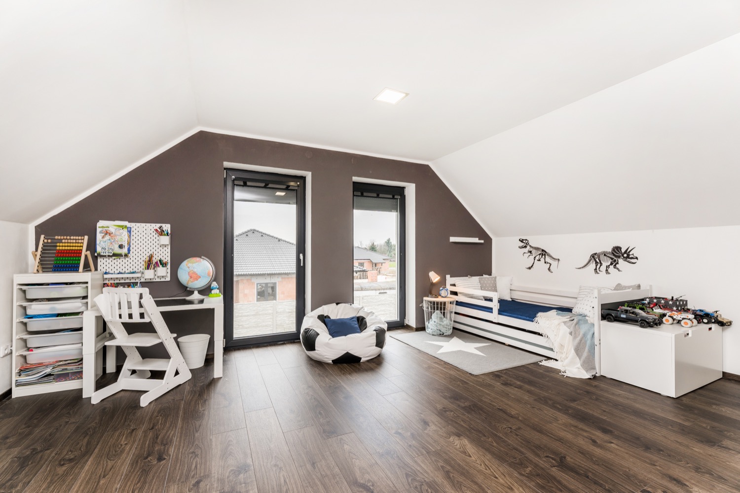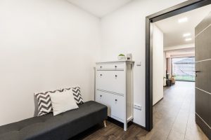 Dispozice je řešena jako 5+kk. Vstup do domu je osvětlený a krytý přístřeškem. Ze zádveří se dostanete do prostorné haly spojující kuchyň a jídelnu s obývacím pokojem, jehož příjemnou atmosféru podtrhuje krb, výhled do udržované zahrady a na venkovní terasu. V přízemí domu naleznete i koupelnu se sprchovým koutem, pracovnu a komoru. Do patra se dostanete po osvětleném schodišti bodovými světly a střešním oknem. Zde se nachází dětský pokoj a šatna, která je přístupná z prostorné ložnice a z koupelny s rohovou vanou a dalším sprchovým koutem. Nechybí zde ani garáž se samostatným vchodem, umístěna po pravé straně od hlavního vchodu do domu. V garáži se nachází jedno parkovací místo a druhé je před garážovými vraty Lomax. Před pozemkem jsou vyhrazena ještě další 2 parkovací místa.