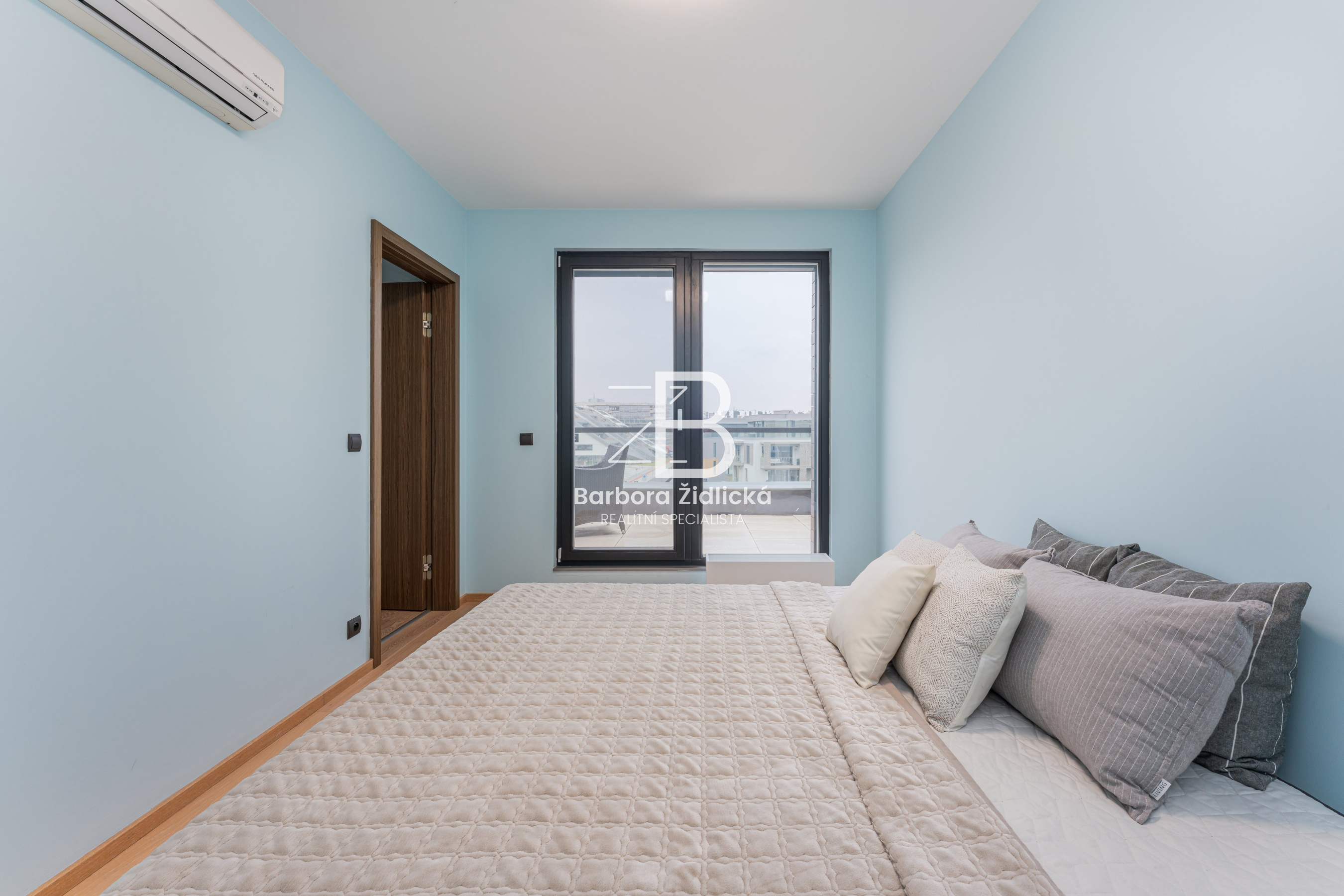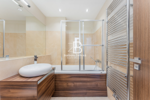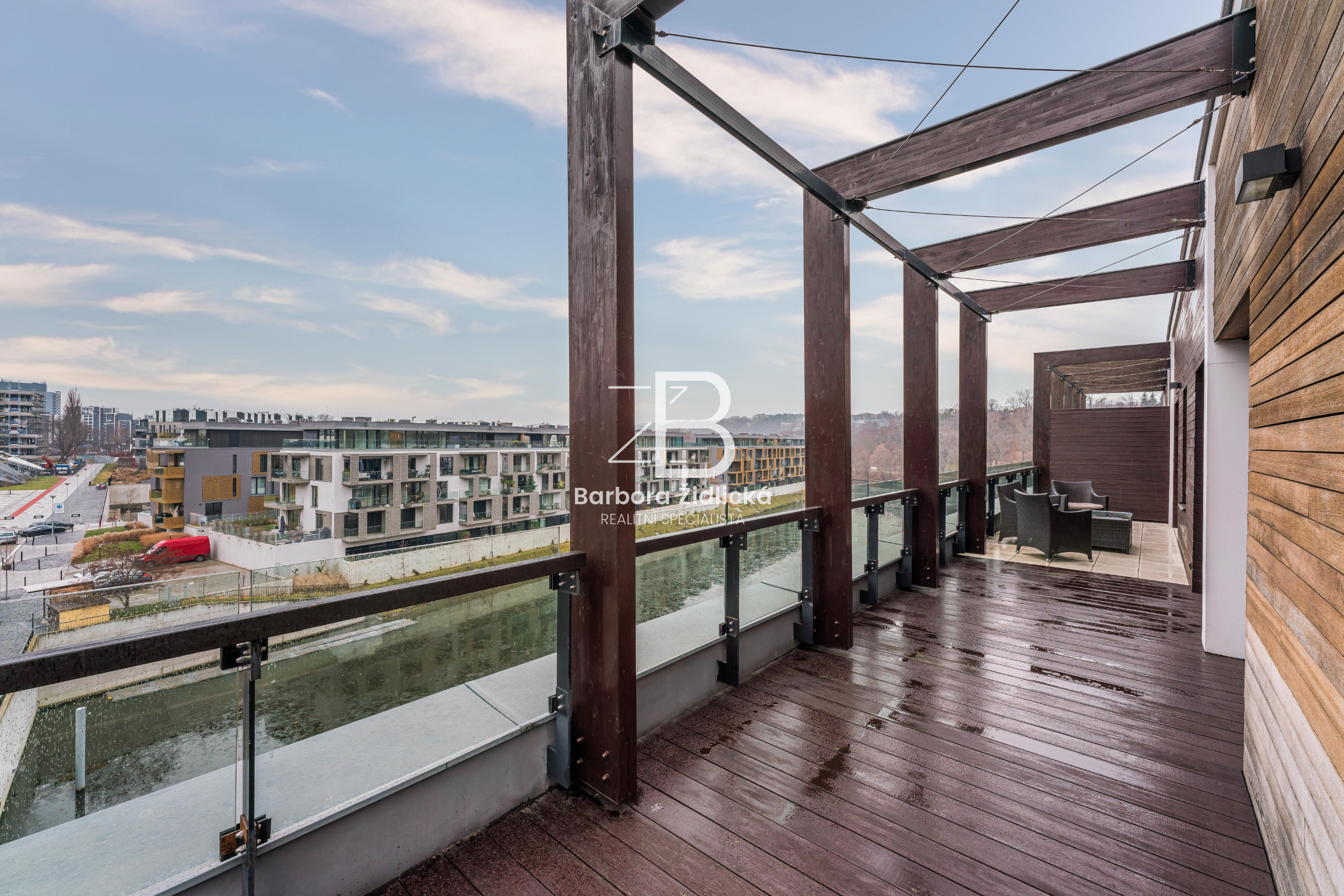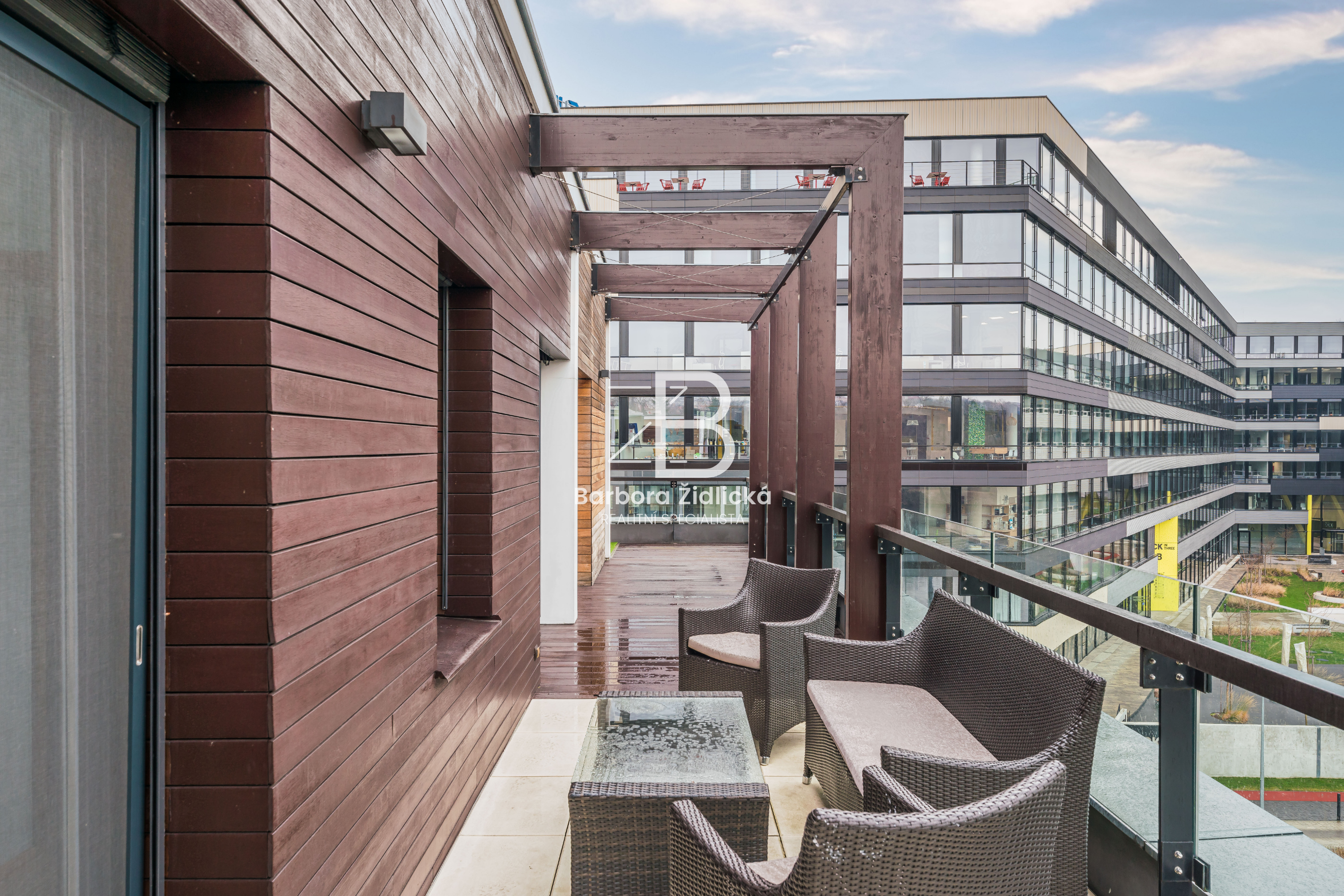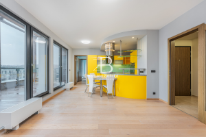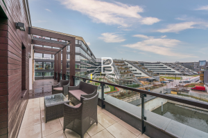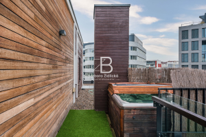 Pronájem střešního bytu o dispozici 3+kk s vlastní terasou o velikosti 72 m2, na které máte k dispozici vlastní vířivku. Dominantou je kuchyň s mramorovou deskou a přidatnou speciální varnou deskou na wok. Komfort bydlení poskytují i venkovní elektrické žaluzie a klimatizační jednotky. Součástí pronájmu je i vnitřní parkovací stání a prostorný sklep. K dispozici máte v domě i recepci, která funguje 24 hodin denně.