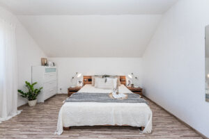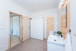 Jedná se o dvoupodlažní, krajní řadový dům s půdním prostorem o dispozici 3+kk, s možností přepažení na 4+kk. Přízemí domu se skládá z prostorné vstupní haly, koupelny, obývacího pokoje spojeného s kuchyňským koutem a jídelnou. V patře se nachází druhá koupelna s vanou a sprchovým koutem, dětský pokoj a prostorná ložnice.