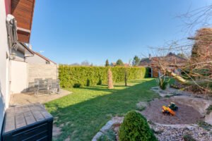 Udržovaná zahrada o výměře 307 m2 s dostatkem soukromí je orientovaná na jihozápadní stranu. Vstup na zahradu je možný francouzským oknem z obývacího pokoje a brankou z příjezdové cesty. Je zde i vydlážděná plocha terasy a zahradní domek na nářadí a zahradní techniku. Před domem se nachází jedno parkovací místo a společné parkoviště pár metrů od domu. Parkování je možné i na pozemku nebo lze předělat prostornou vstupní halu na garáž pro jedno auto.