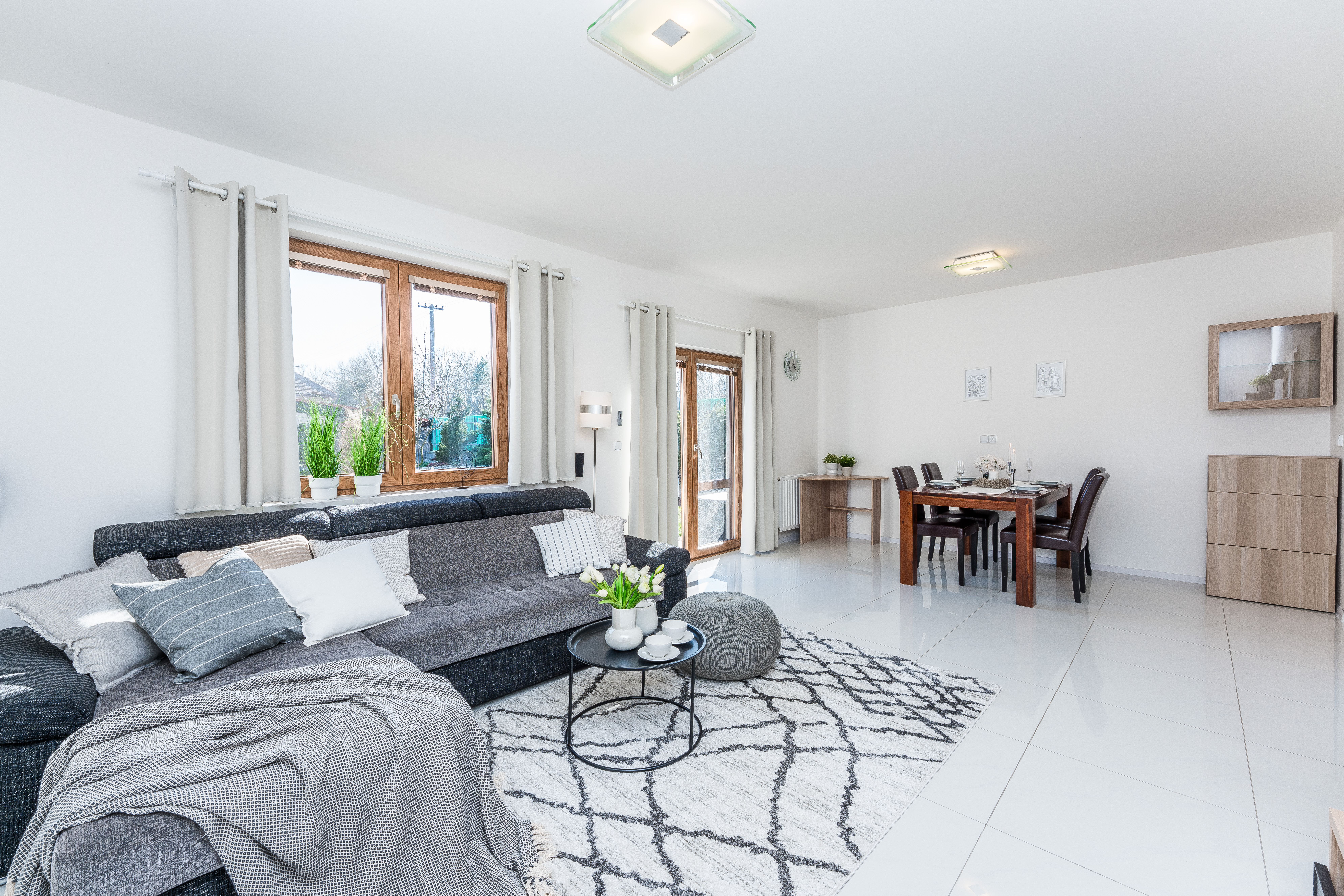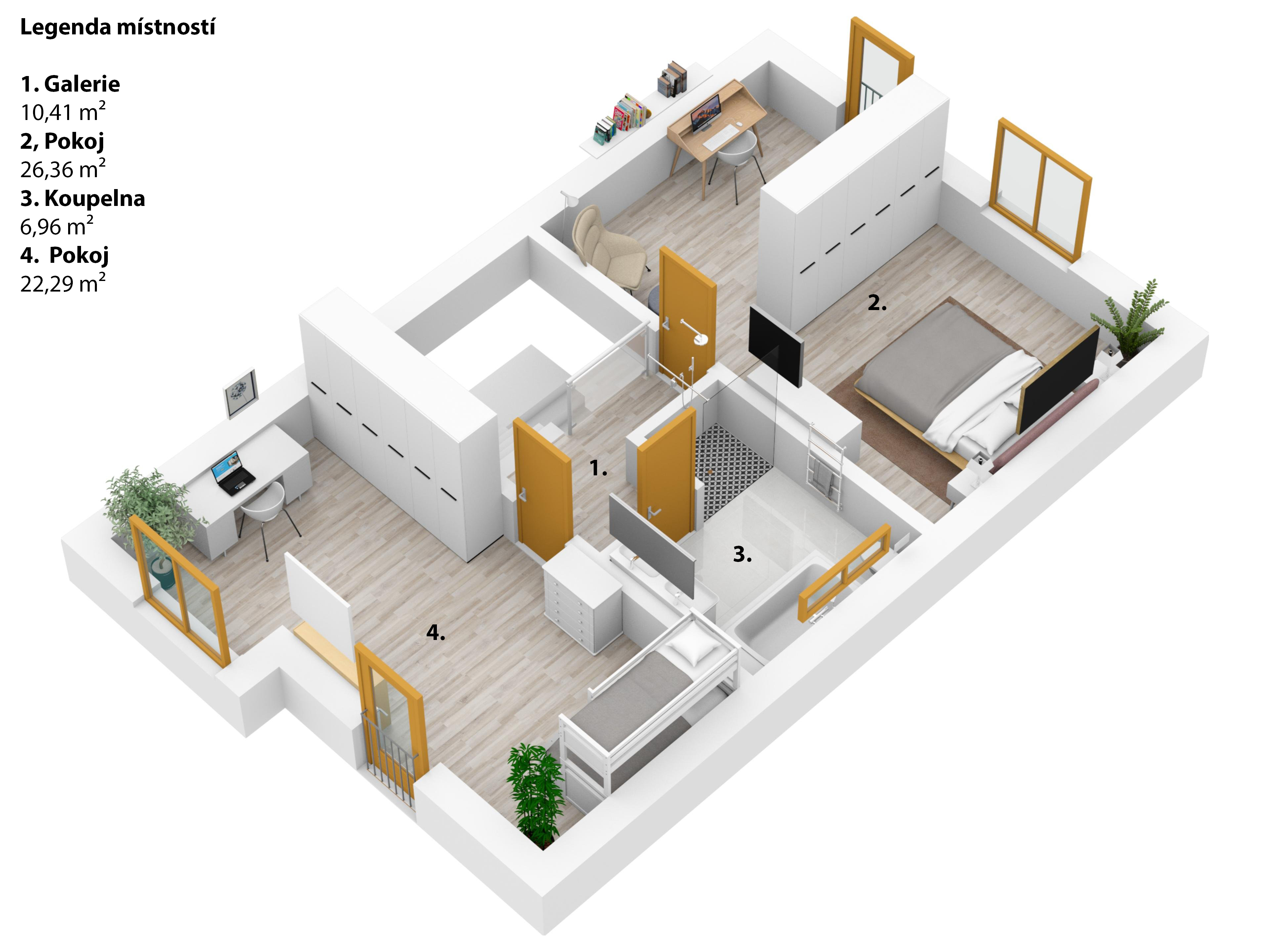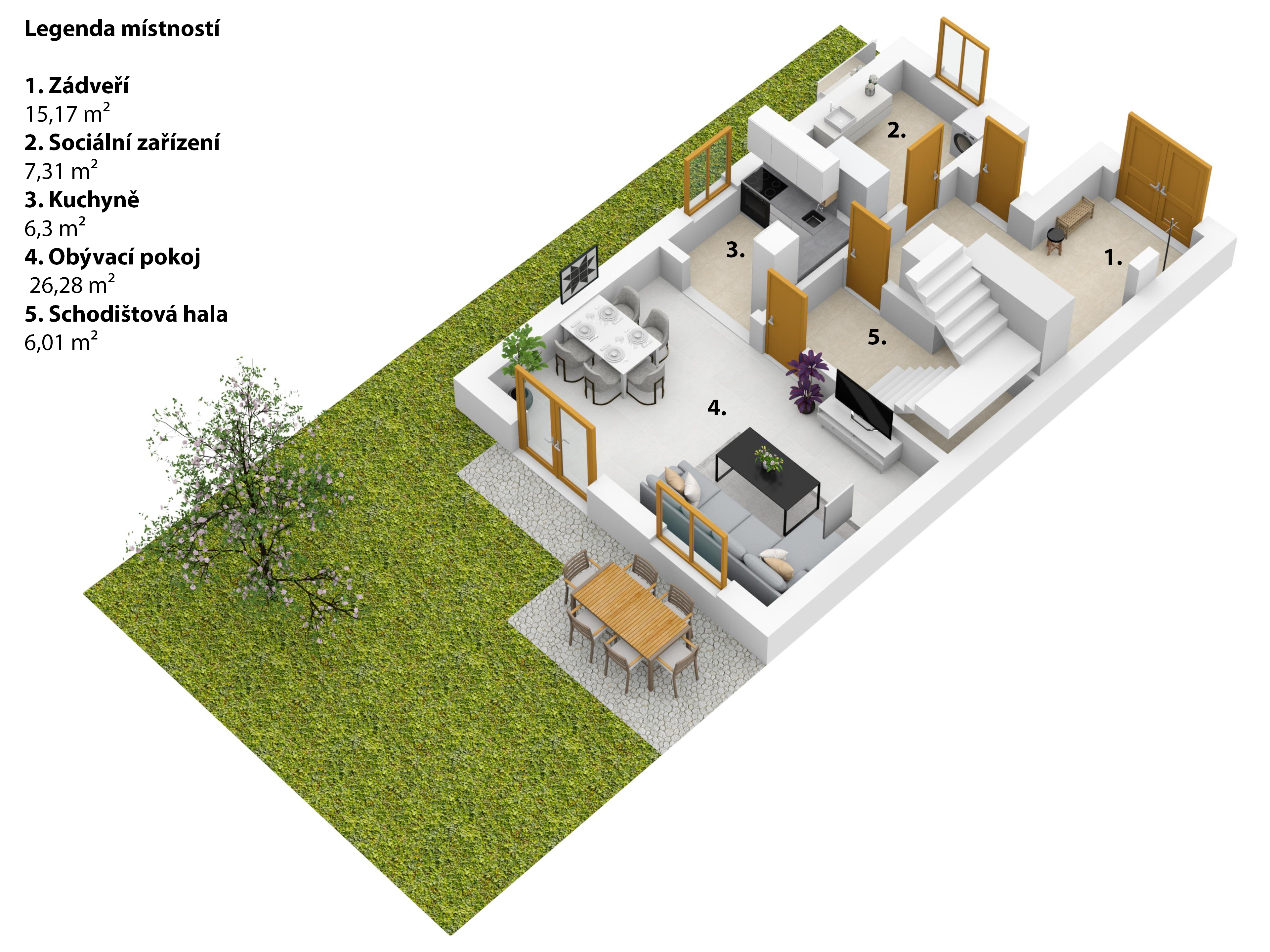 Jedná se o dvoupodlažní, krajní řadový dům s půdním prostorem o dispozici 3+kk, s možností přepažení na 4+kk. Přízemí domu se skládá z prostorné vstupní haly, koupelny, obývacího pokoje spojeného s kuchyňským koutem a jídelnou. V patře se nachází druhá koupelna s vanou a sprchovým koutem, dětský pokoj a prostorná ložnice.