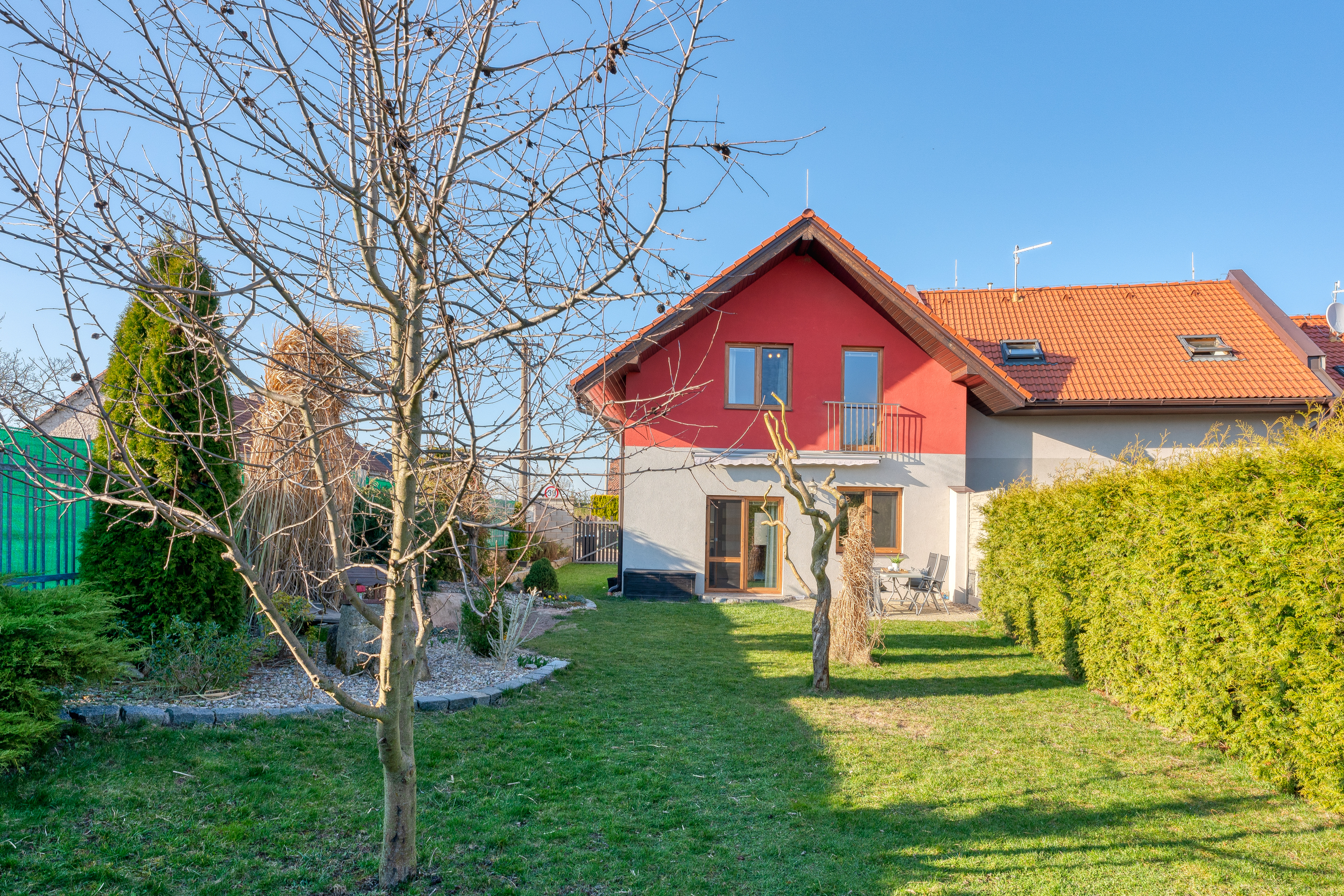 Udržovaná zahrada o výměře 307 m2 s dostatkem soukromí je orientovaná na jihozápadní stranu. Vstup na zahradu je možný francouzským oknem z obývacího pokoje a brankou z příjezdové cesty. Je zde i vydlážděná plocha terasy a zahradní domek na nářadí a zahradní techniku. Před domem se nachází jedno parkovací místo a společné parkoviště pár metrů od domu. Parkování je možné i na pozemku nebo lze předělat prostornou vstupní halu na garáž pro jedno auto.