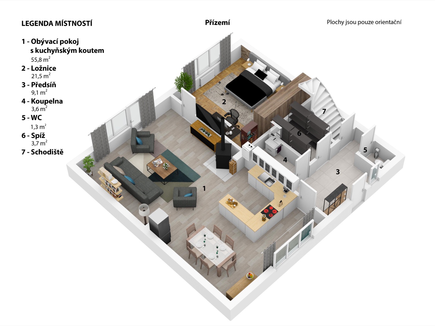 Dům je určen k rekonstrukci dle přání nového majitele, která již byla z části započata, a to výměnou plynového kotle, novými rozvody a podlahové vytápění. Dům se prodává ve stavu, v jakém je zachycen na fotografiích. Vizualizace rekonstrukce jsou vytvořeny pouze pro představu možné podoby interiéru. Podkroví rodinného domu je v původním stavu, vhodné pro přestavbu na obytnou část.