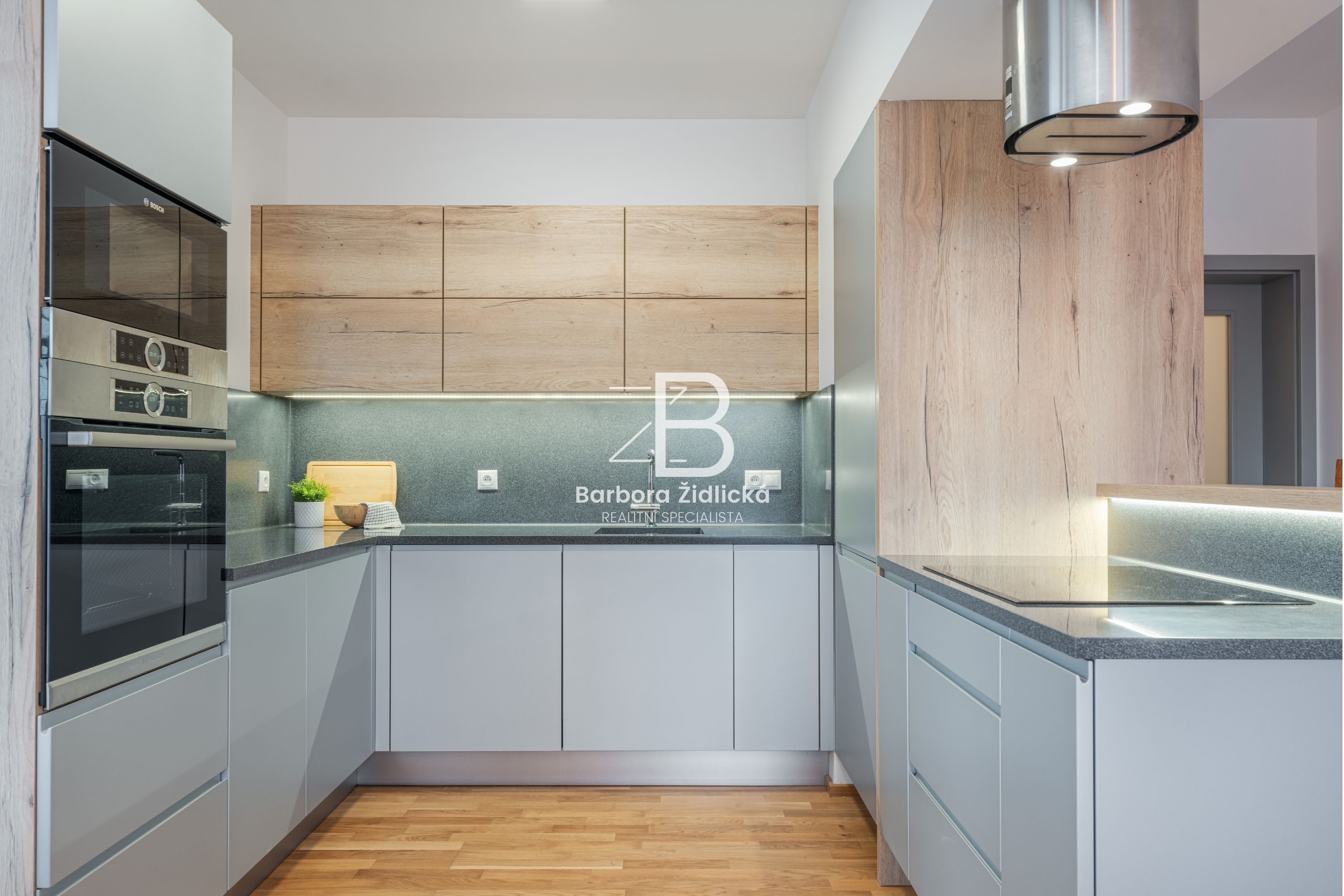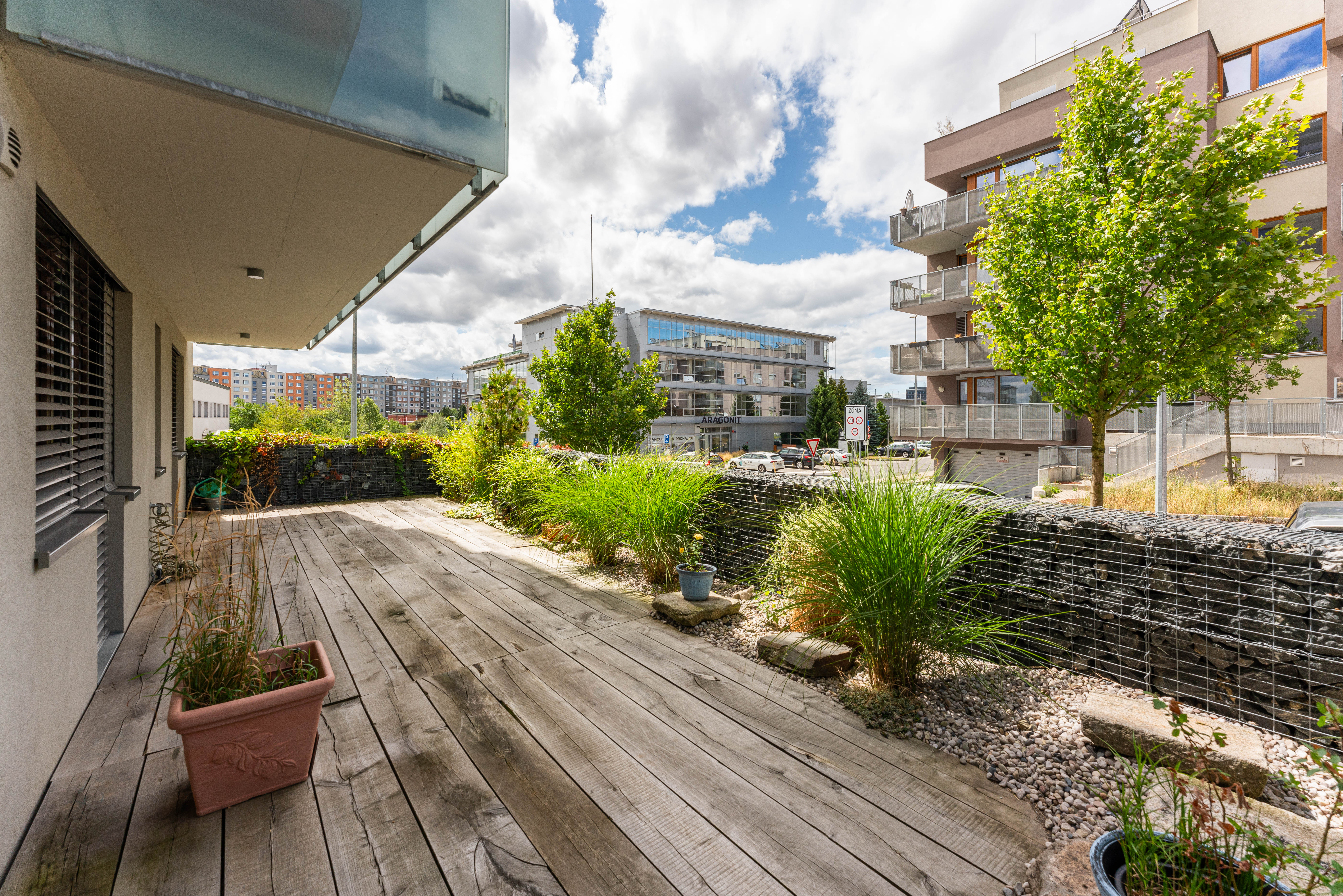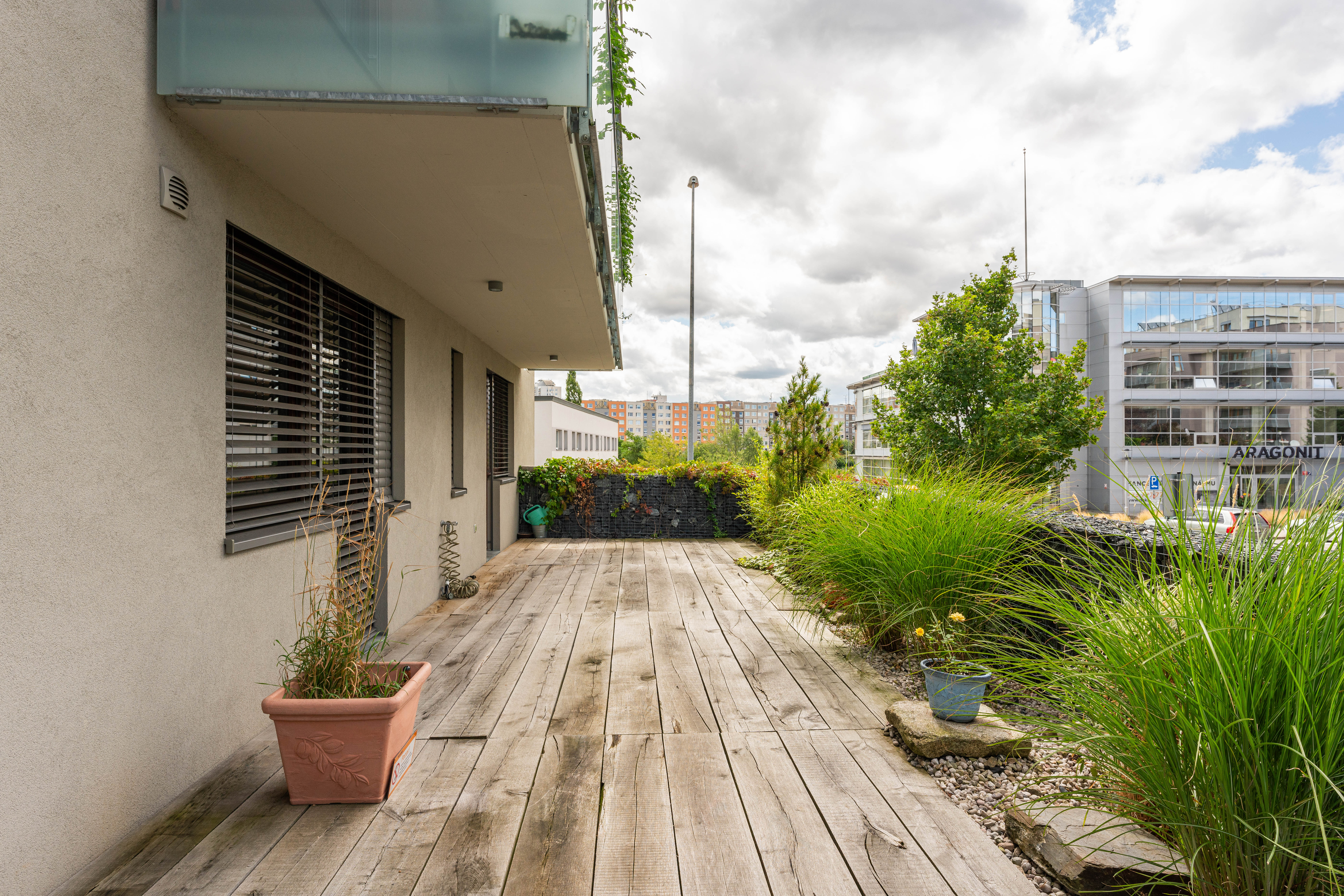 Celková plocha bytu činí 81m2. K bytu náleží terasa o rozloze 50 m2, která je přístupná ze tří pokojů. Všechna okna disponují venkovními žaluziemi na elektrické ovládání. V bytě zůstává kuchyňská linka včetně vestavěných spotřebičů, TV, regál, šatní skříň a skříň v chodbě, botník. Součástí je dále garážové stání. Ve společných prostorách je možné využívat kolárnu a místnost se sprchou pro mytí kol, kočárků či zablácených psů. Velkým bonusem je i nabíječka pro elektromobily.