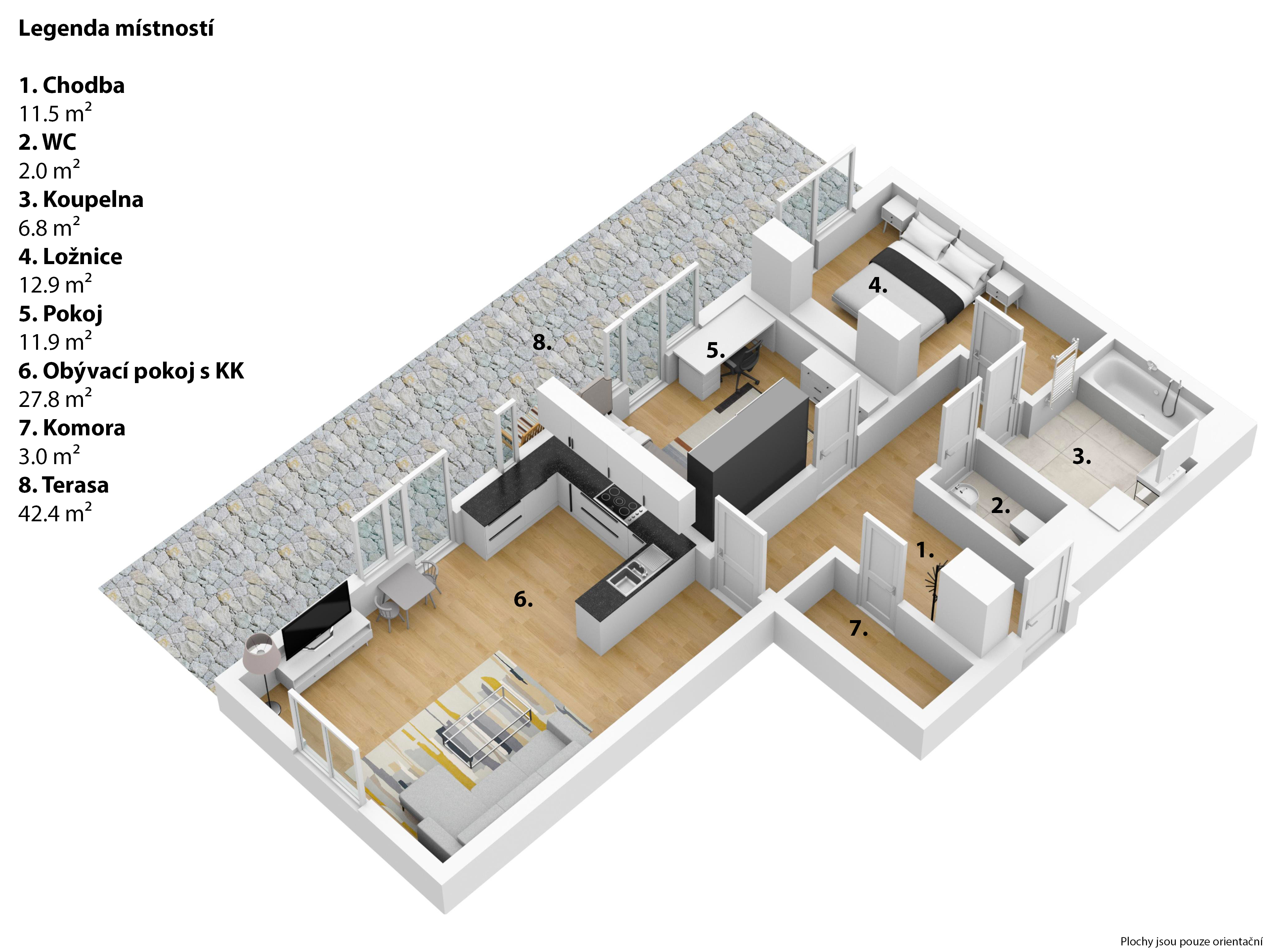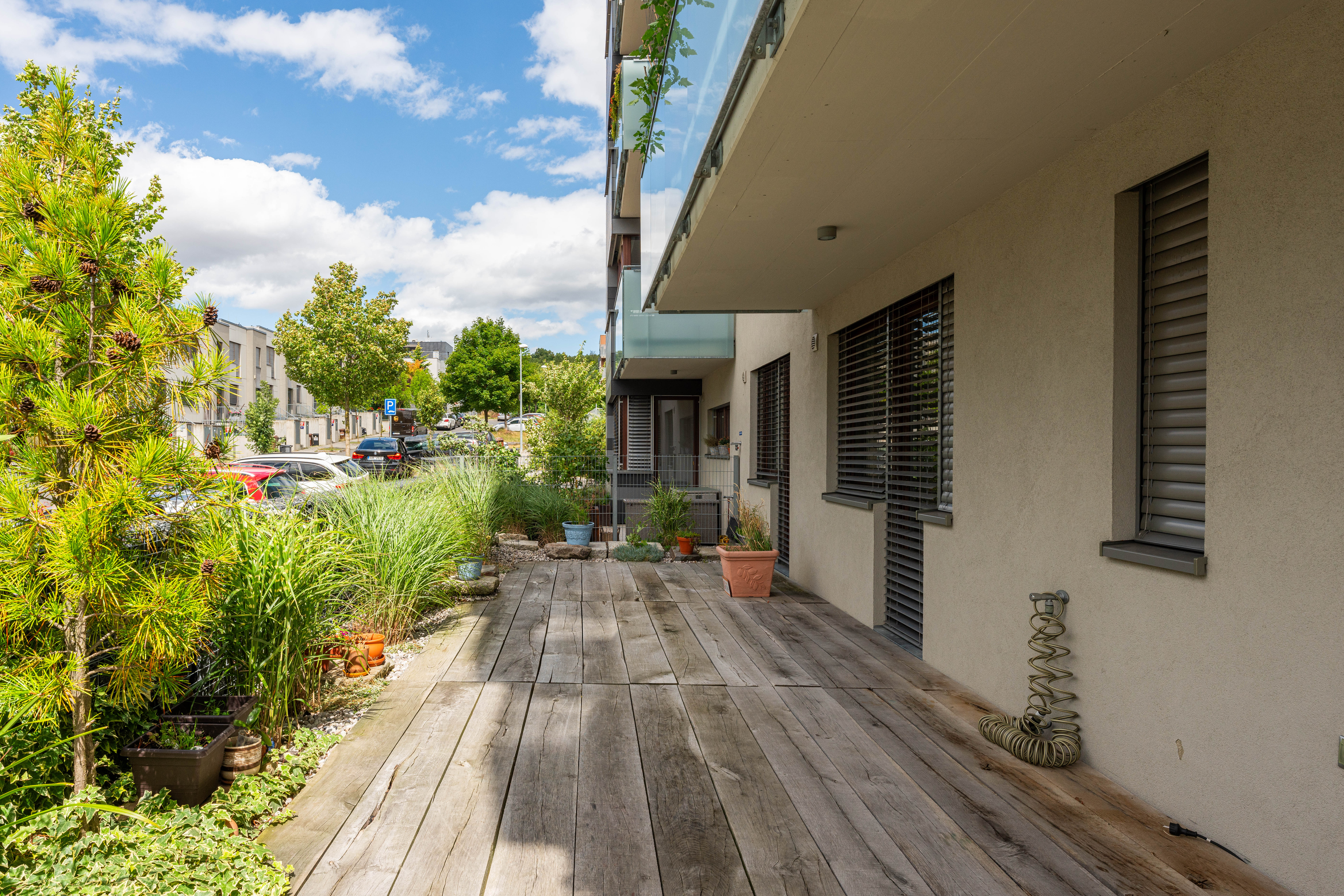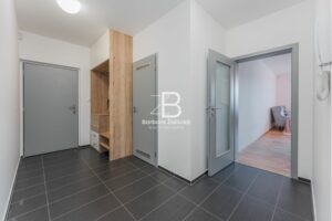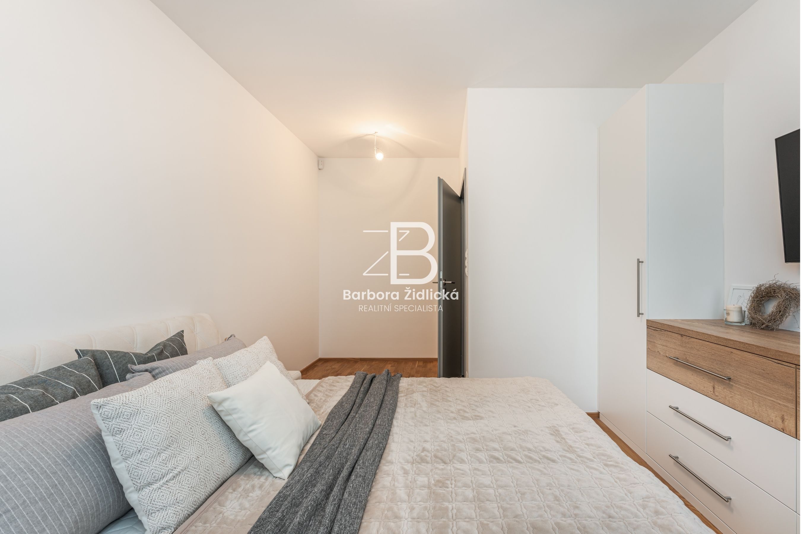 Celková plocha bytu činí 81m2. K bytu náleží terasa o rozloze 50 m2, která je přístupná ze tří pokojů. Všechna okna disponují venkovními žaluziemi na elektrické ovládání. V bytě zůstává kuchyňská linka včetně vestavěných spotřebičů, TV, regál, šatní skříň a skříň v chodbě, botník. Součástí je dále garážové stání. Ve společných prostorách je možné využívat kolárnu a místnost se sprchou pro mytí kol, kočárků či zablácených psů. Velkým bonusem je i nabíječka pro elektromobily.