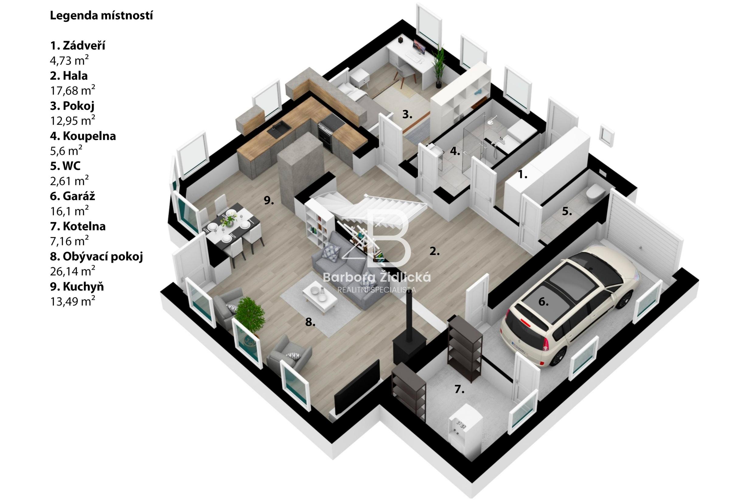 Přízemí domu se skládá ze zádveří (4,79 m2), chodby (17,68 m2), ze které se dá vstoupit do garáže (16,10 m2) a kotelny (7,16 m2), koupelny (5,60 m2) a oddělené toalety (2,61m2), ložnice (12,95m2), následuje kuchyňský kout (6,96 m2), součástí kterého je jídelna (6,53 m2). Dominantou domu je obývací pokoj s krbem (26,14 m2), ve kterém se nachází vstup rovnou na venkovní terasu.