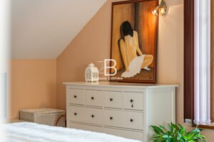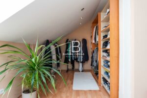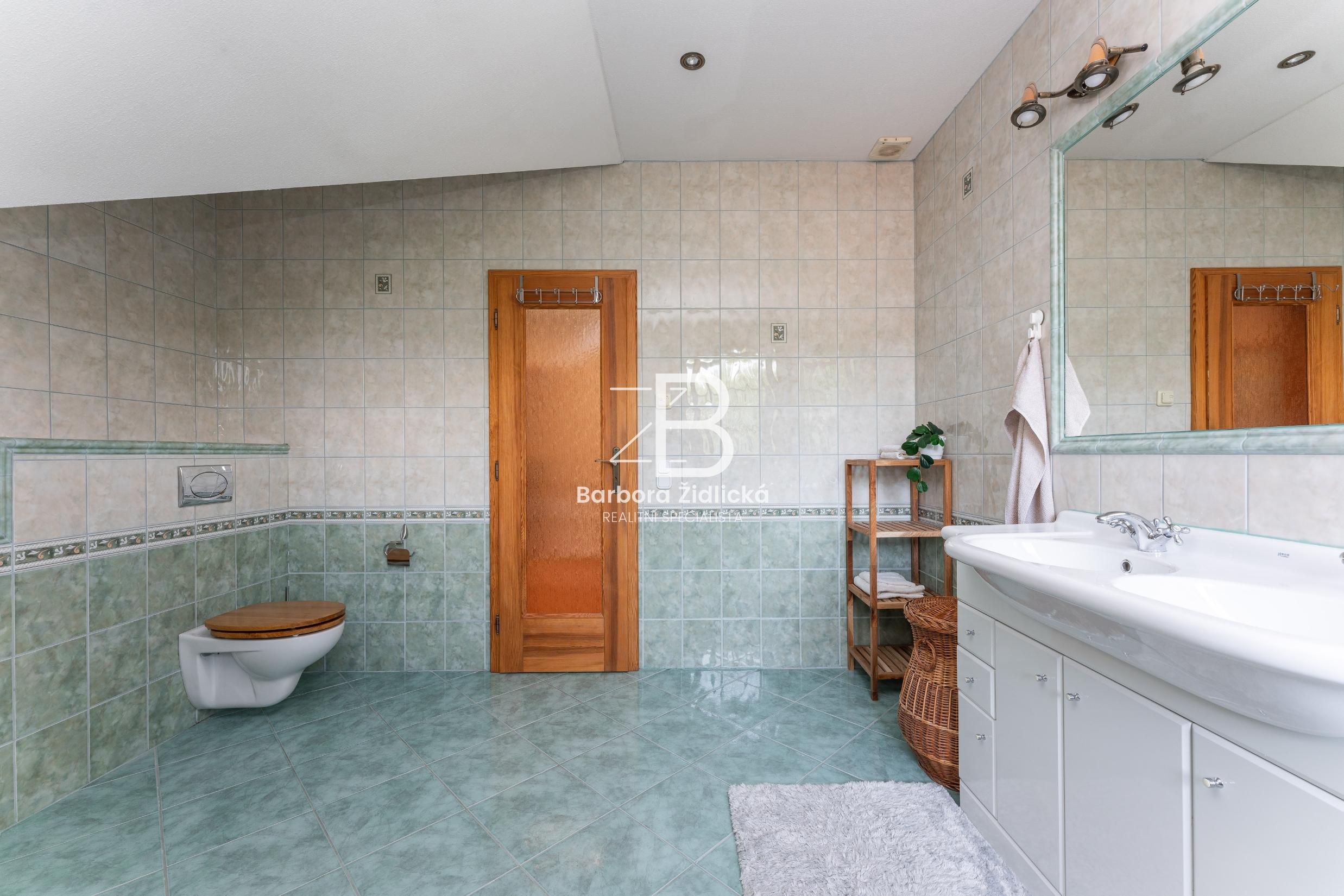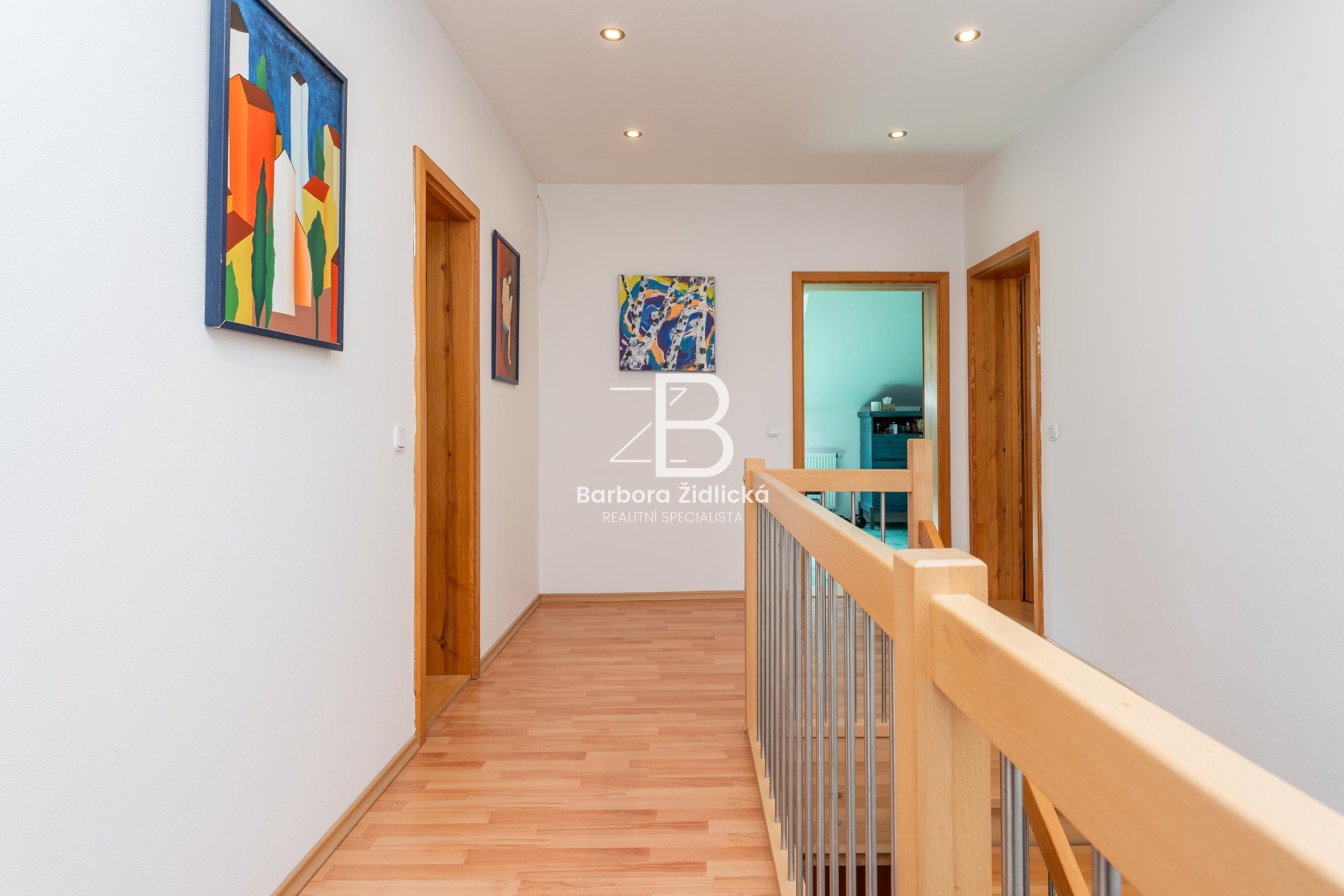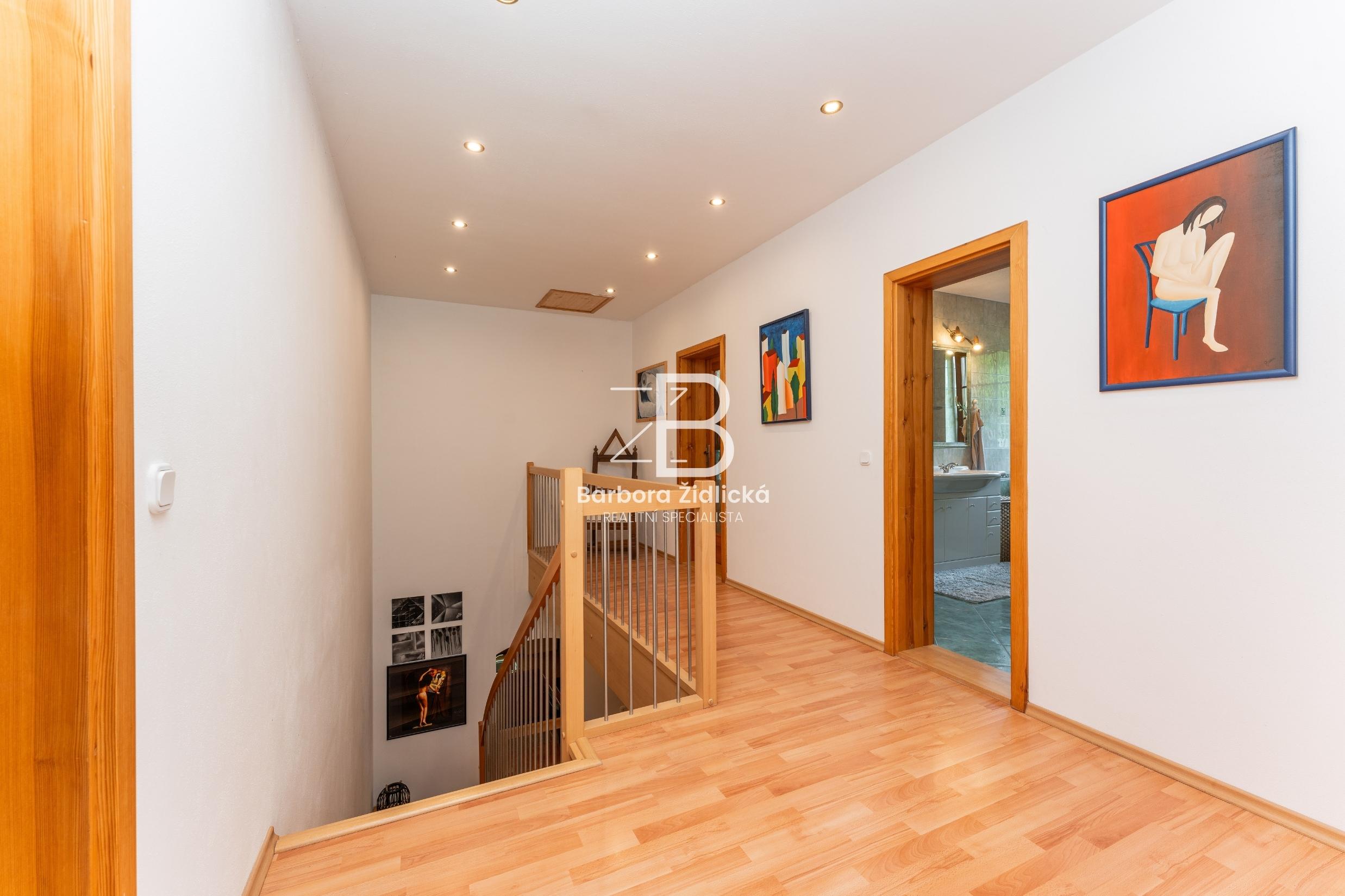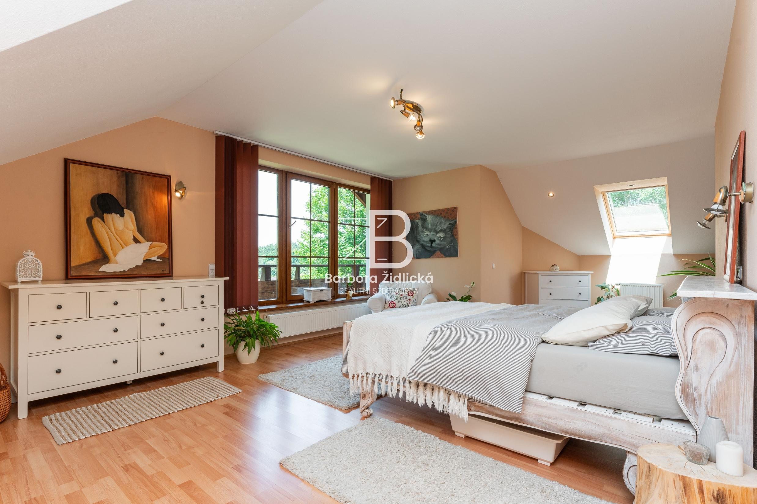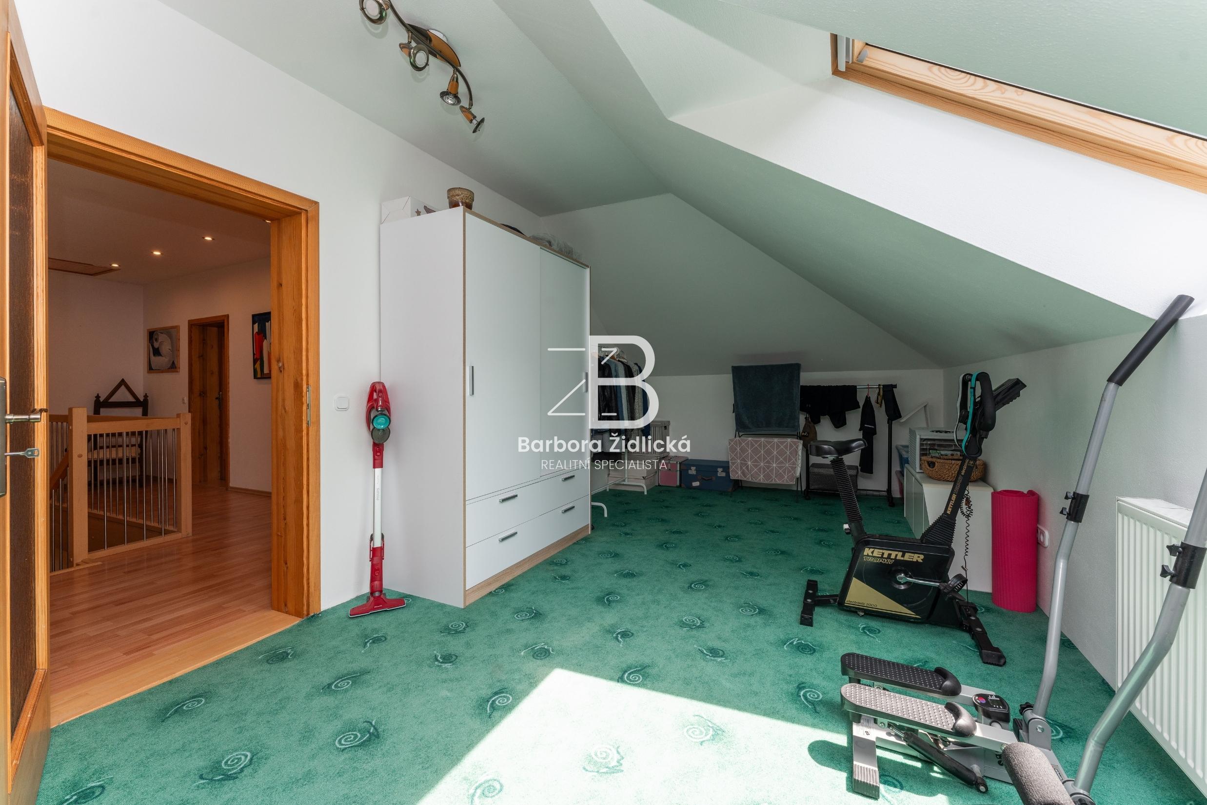 V 1. patře se dále nachází ložnice se šatnou (26,68 m2 + 14,53 m2), ze které máte dechberoucí výhled na nádhernou krajinu. Součástí 1. patra je dále chodba (11,68 m2), pokoj (24,56 m2), koupelna s toaletou (13,62 m2) a dětský pokoj (19,01 m2). Nad obytnou částí se nachází půdní prostor.