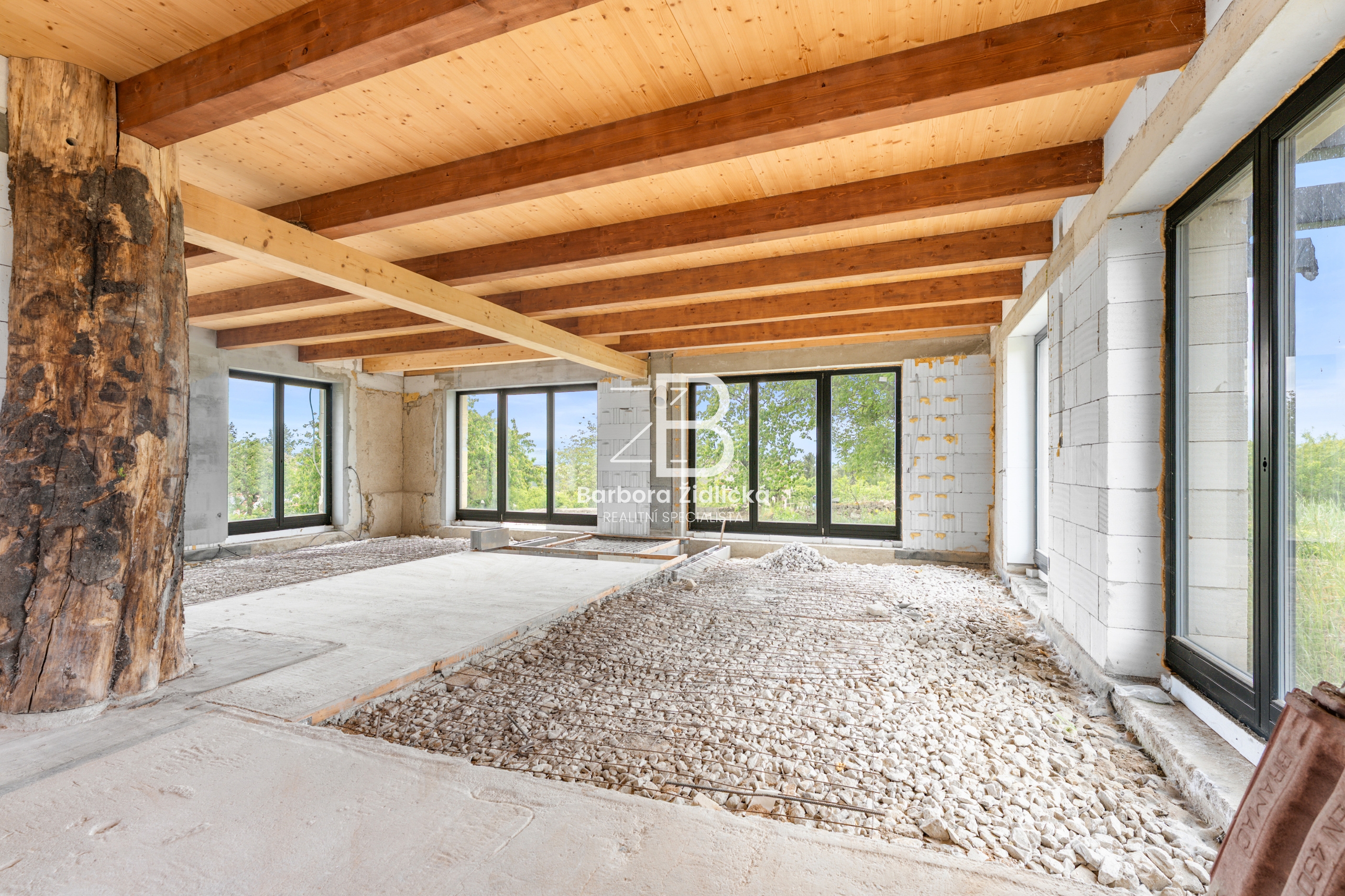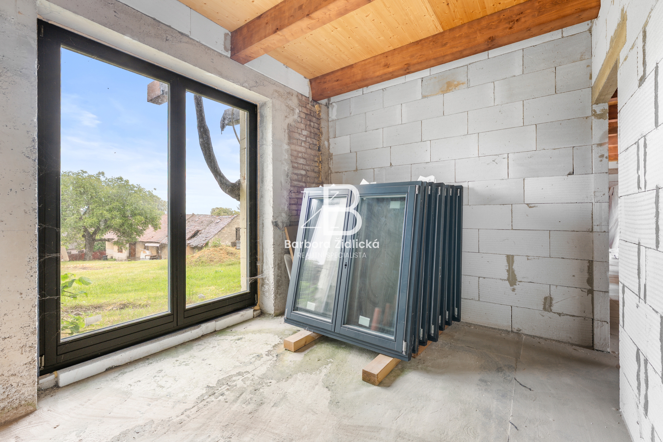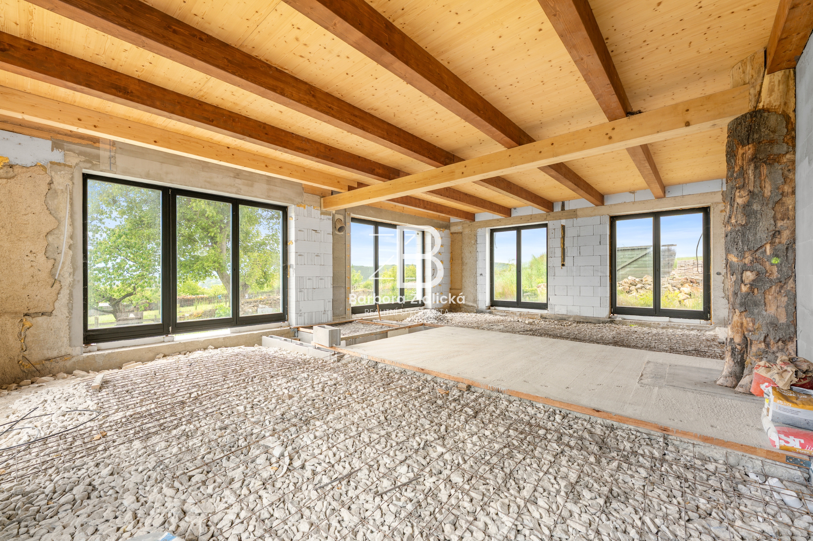 Dům prošel kompletní přestavbou – nezůstal kámen na kameni. Vzniká zcela nová stavba na nové základové desce, vyzděná ze 60cm Ytongu (není třeba zateplovat), se střechou z roku 2020 a osazená velkorysými francouzskými okny s trojskly ve vysokém standardu. Uvnitř je vše připraveno k dokončení podle vlastního vkusu – včetně originálního architektonického prvku v podobě masivního kmene stromu v hlavní obytné části, který vytváří jedinečnou atmosféru.