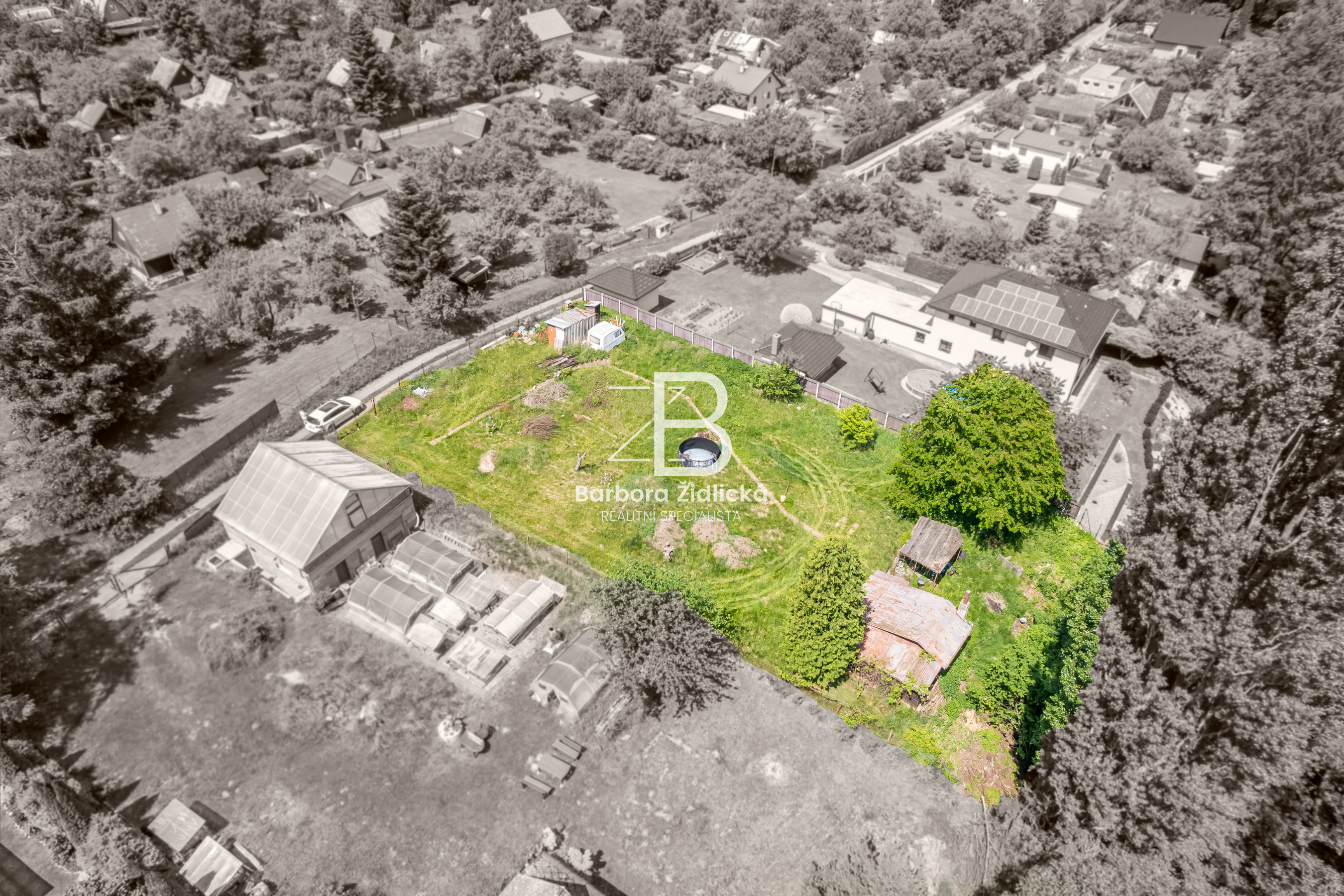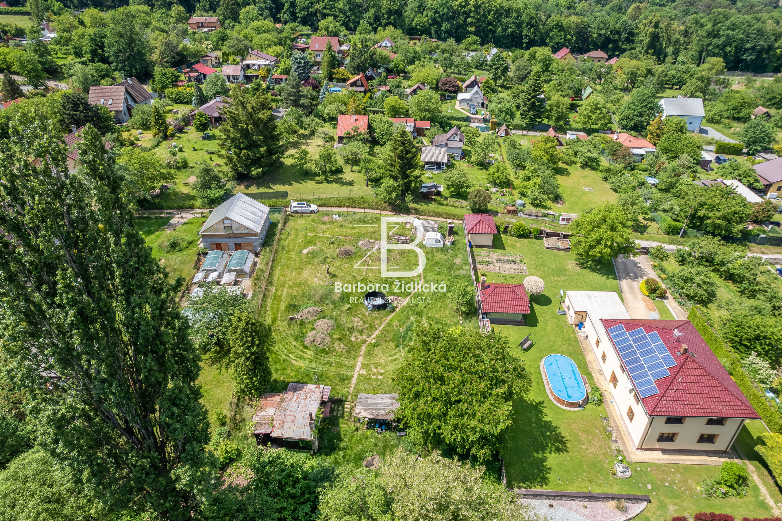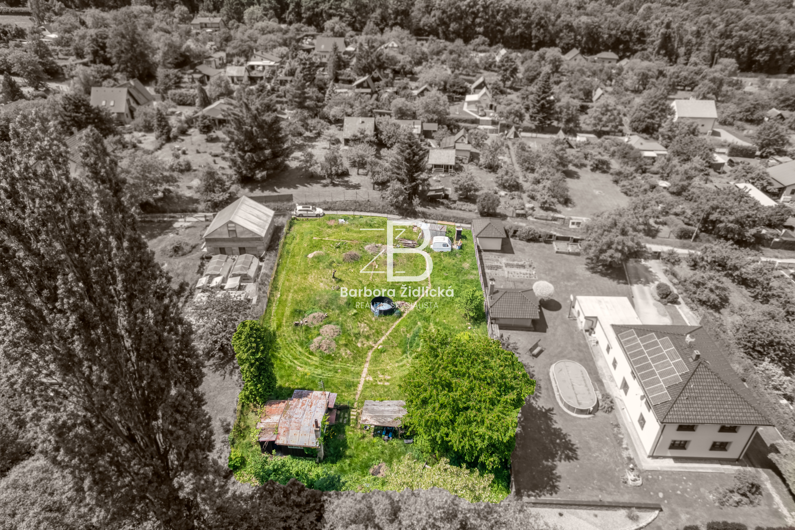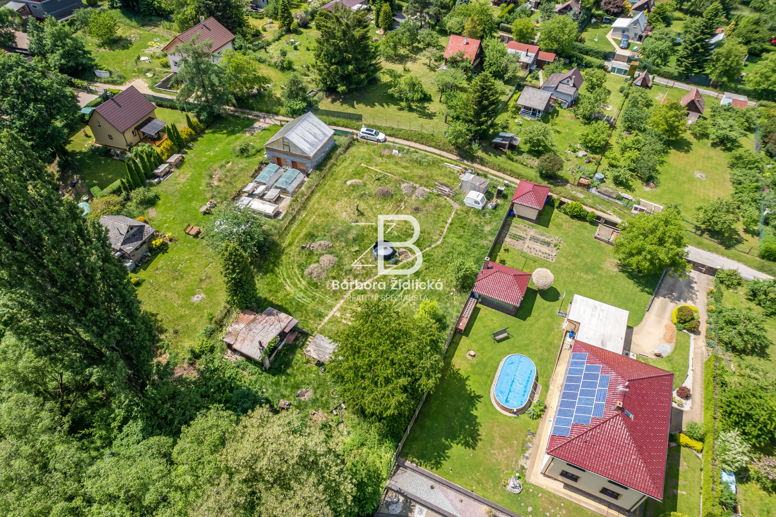 Na pozemku se nachází dřevěná chata o zastavěné ploše 19m2, která je určena k rekonstrukci či demolici. Na katastru vedeno jako zahrada s budovou bez čísla popisného nebo evidenčního. Dle územního plánu se jedná o plochu rekreace – stavby pro rodinnou rekreaci.