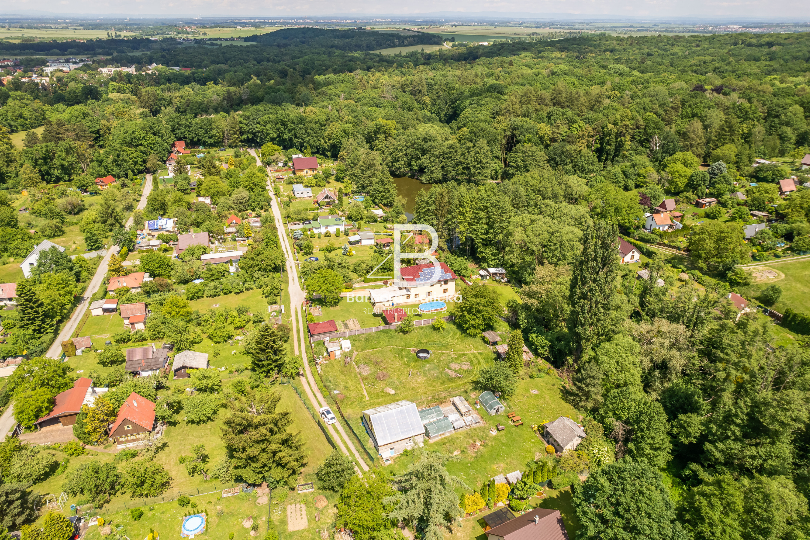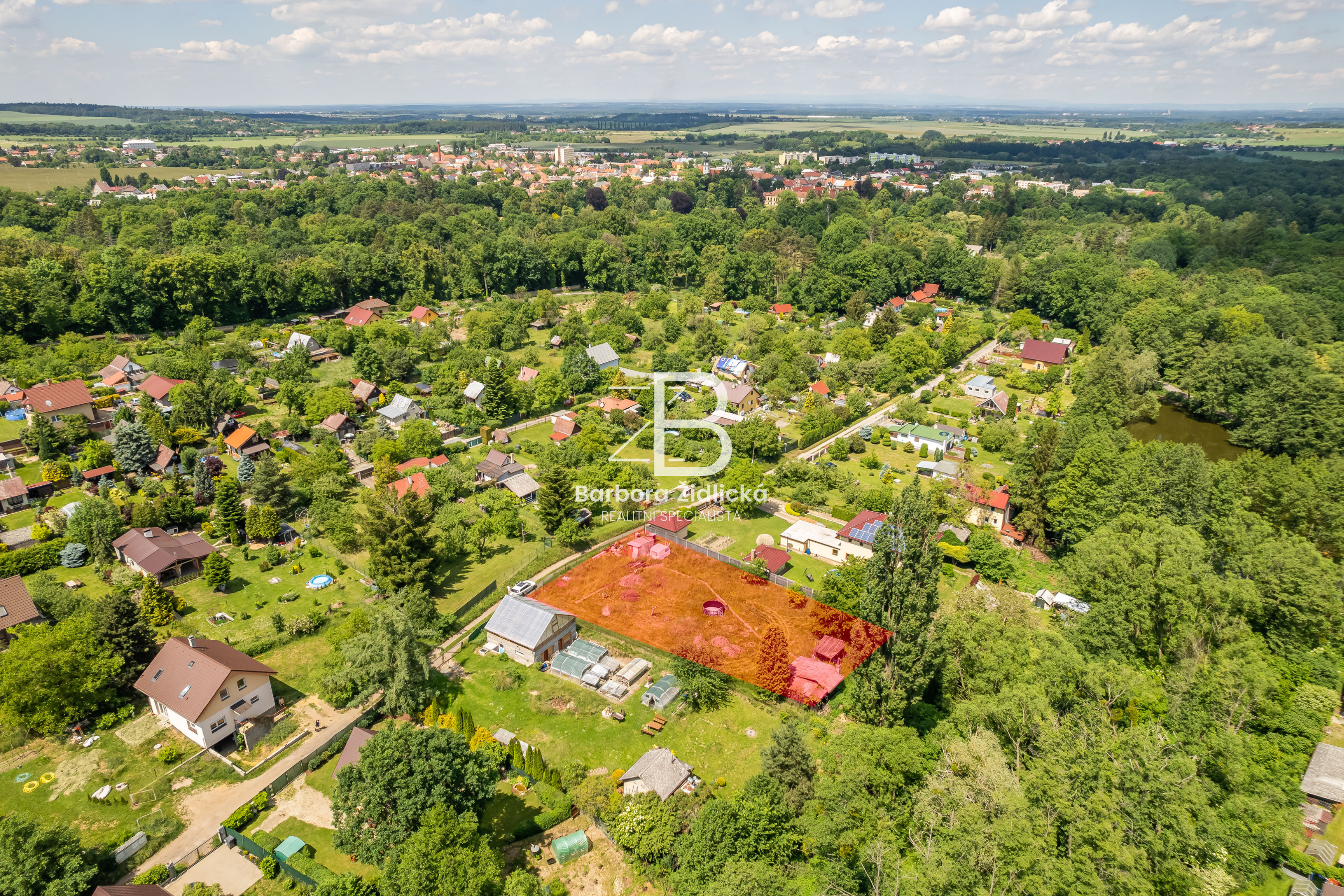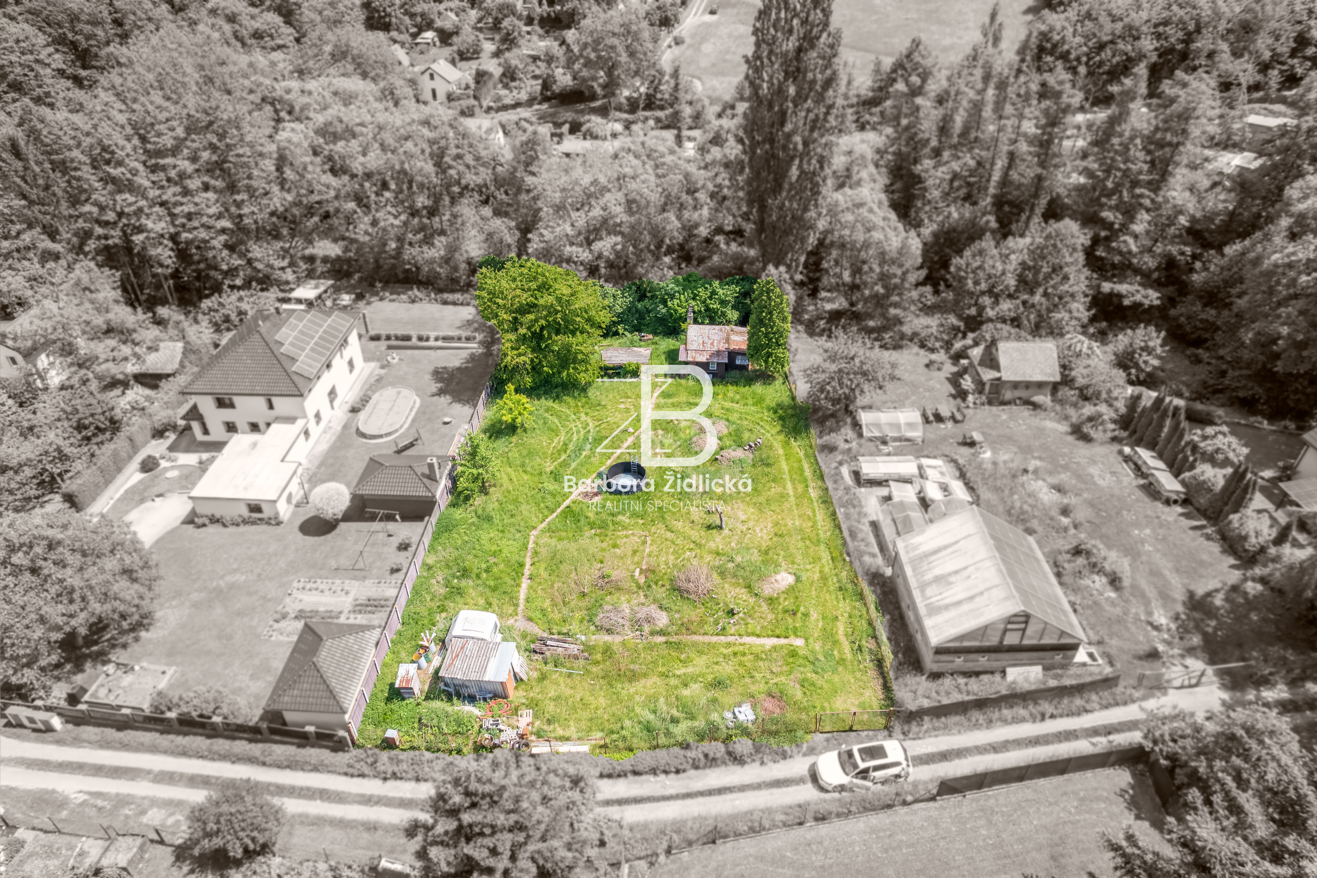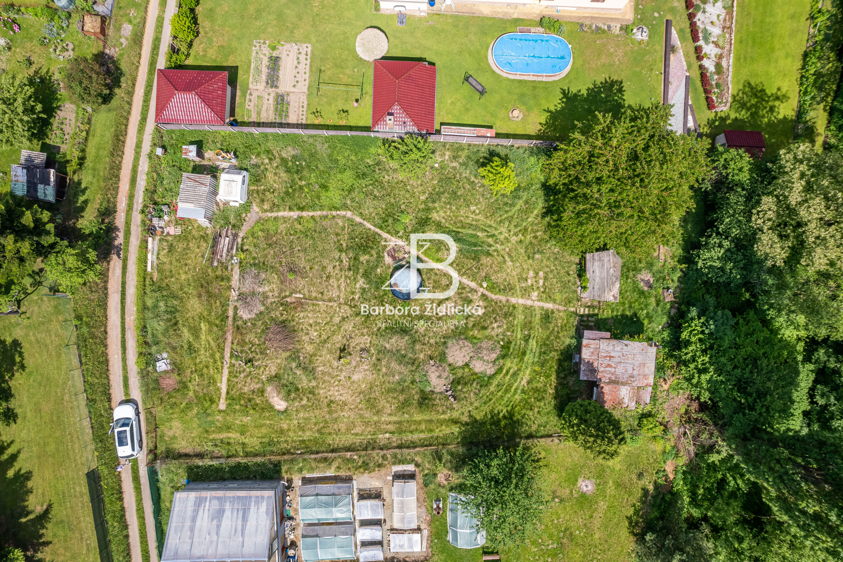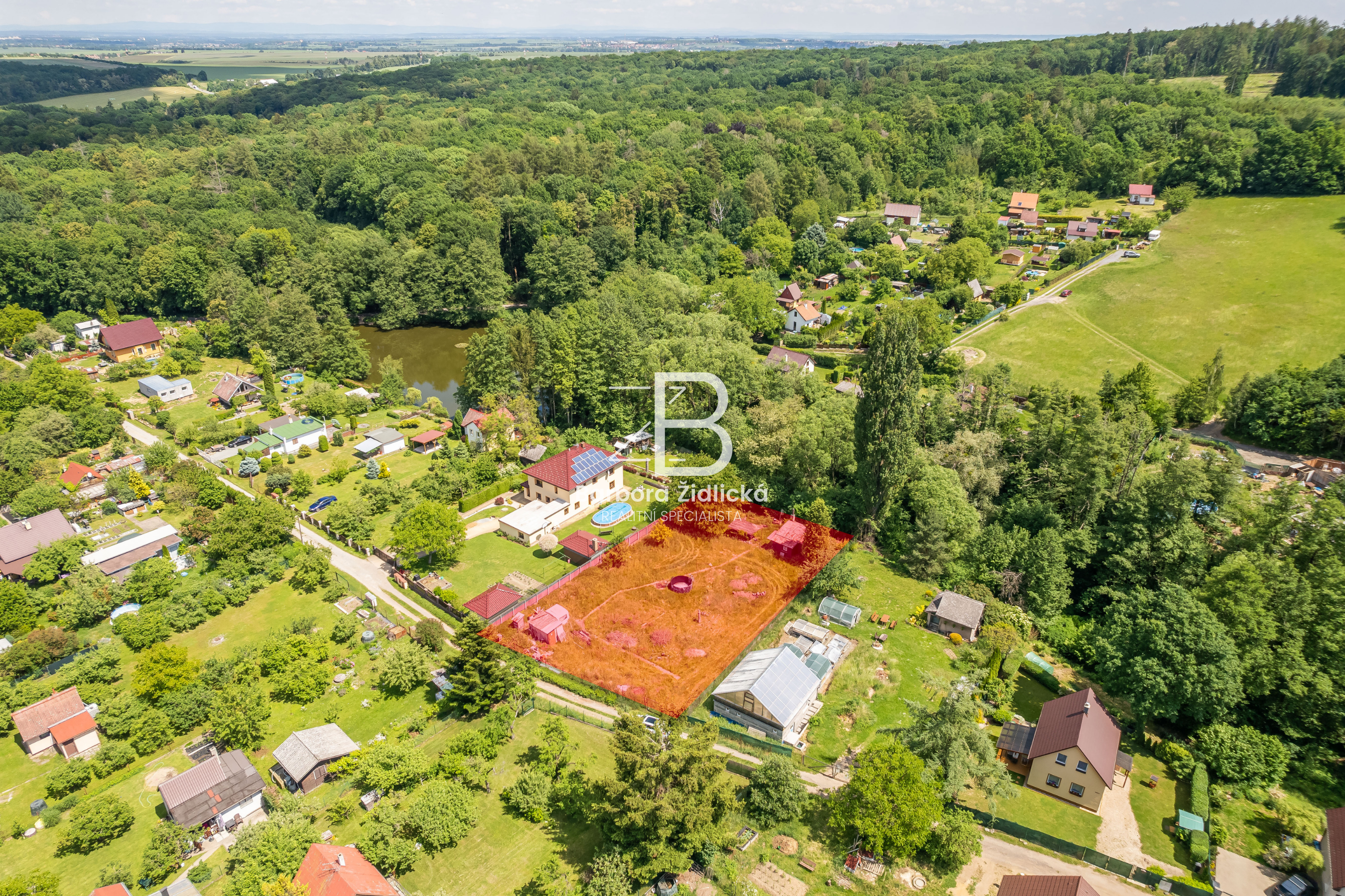 Na pozemku se nachází dřevěná chata o zastavěné ploše 19m2, která je určena k rekonstrukci či demolici. Na katastru vedeno jako zahrada s budovou bez čísla popisného nebo evidenčního. Dle územního plánu se jedná o plochu rekreace – stavby pro rodinnou rekreaci.